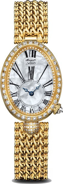 Часы Breguet Reine de Naples 8928BA/51/J20 DD0D выпущены в корпусе из желтого золота 18к, размером 33 х 24.95 х 8.6 мм и водонепроницаемостью 30 м с безелем из 139-и белых бриллиантов 1.32 ct. и заводным ключом, инкрустированным белым бриллиантом 0.26 ct. Внутри корпуса установлен автоматический механизм, Калибр 596. На белом жемчужном циферблате отображаются часы, минуты. Запас хода 38 часов. Часы комплектуются браслетом из желтого золота 18к и откидной застежкой.