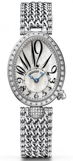 Корпус часового механизма из 18-каратного белого золота с изящно рифленым корпусным кольцом. Безель, обод циферблата и ушко украшены 139 бриллиантами (весом около 1,255 карат). Заводная головка инкрустирована бриллиантом огранки ""бриолет"" (весом около 0,26 карат). Задняя крышка из сапфирового стекла. Размеры: 33 x 24,95 мм. Водонепроницаемость до 3 бар (30 м). Циферблат из натурального белого перламутра. Индивидуальный номер и надпись Breguet Часовая шкала представлена арабскими цифрами Breguet, смещающимися к положению «6 часов». Стрелки Breguet с открытым наконечником из вороненой стали. Механизм с автоподзаводом, калибр 586/1. Номер и надпись Breguet 6¾ линий. 29 камней. Запас хода 38 часов. Перевернутый однорядный спусковой механизм с кремниевыми анкерами. Кремниевая спираль Частота колебаний балансира составляет 3 Гц. Механизм отрегулирован в 6 положениях. Браслет из белого золота 18к с золотой застежкой-клипсой, инкрустированной 26 бриллиантами (весом около 0,12 карат).