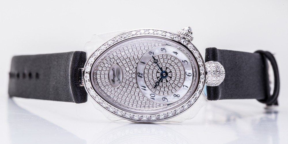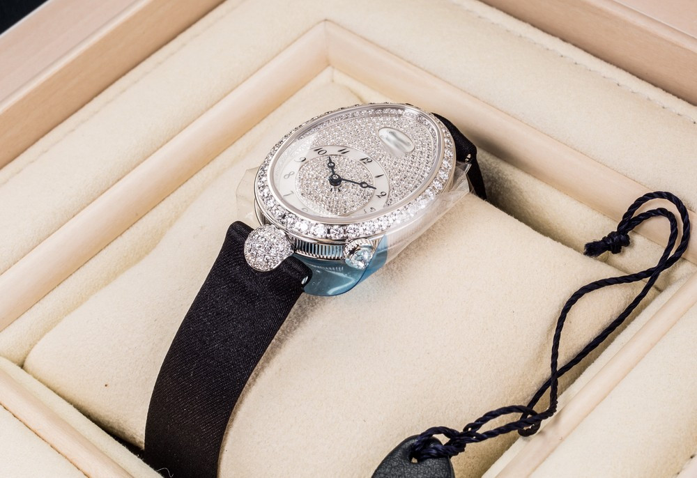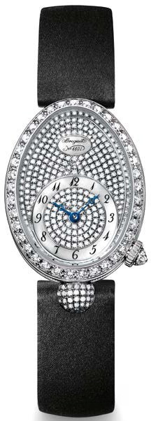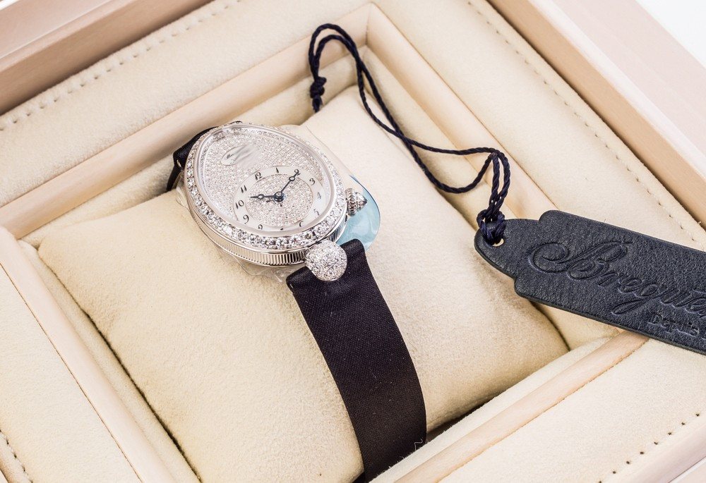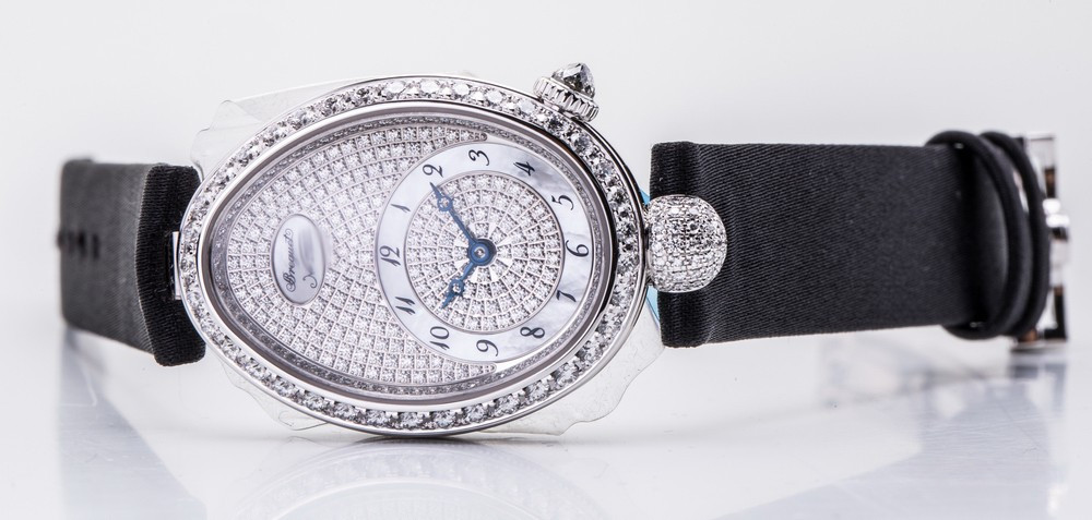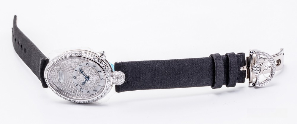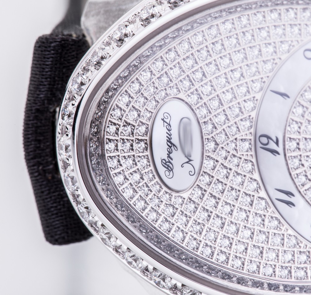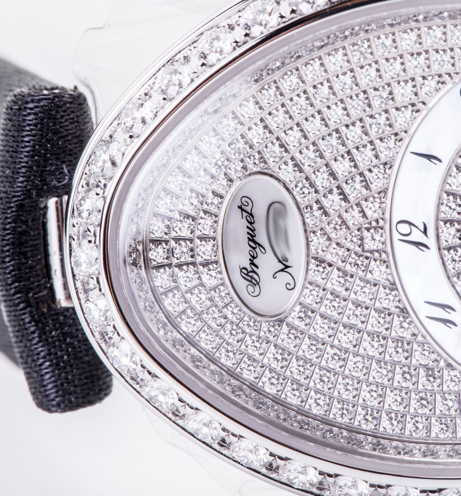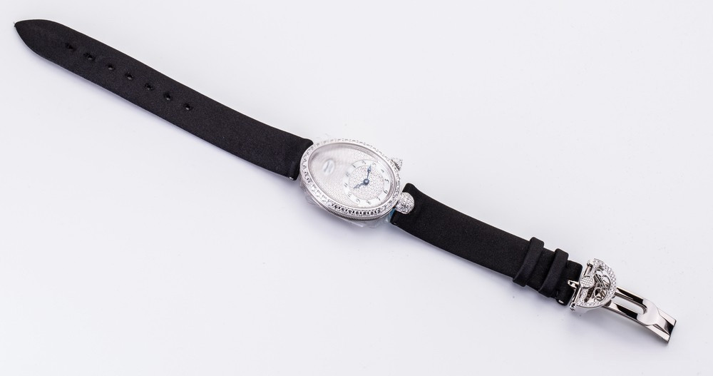 Овальный корпус Breguet Reine de Naples 8928BB/8D/844 DD0D выполнен из 18-каратного белого золота и имеет размеры 33 x 24.95 x 8.6 мм. Заводная головка инкрустирована белым бриллиантом 0.26 ct. Циферблат из посеребренного золота отделан 211 бриллиантами 0,63 ct. Стрелки отлиты из вороненной стали и украшены "яблоками" Breguet. Автоматический механизм 586 имеет запас хода на 40 часов. Водонепроницаемость модели равняется 30 метрам. Безель и ушки корпуса украшены 139 бриллиантами (около 1,32 ct). Задняя крышка выполнена из сапфирового стекла. Часы завершает черный, атласный ремешок оснащенный золотой раскладывающейся застежкой 18 карат. Часы представлены в элегантной фирменной коробке с документами.