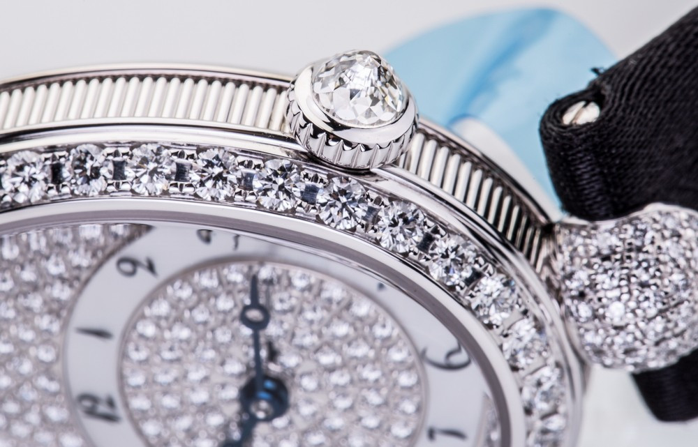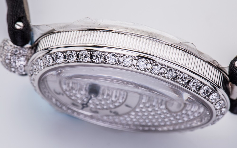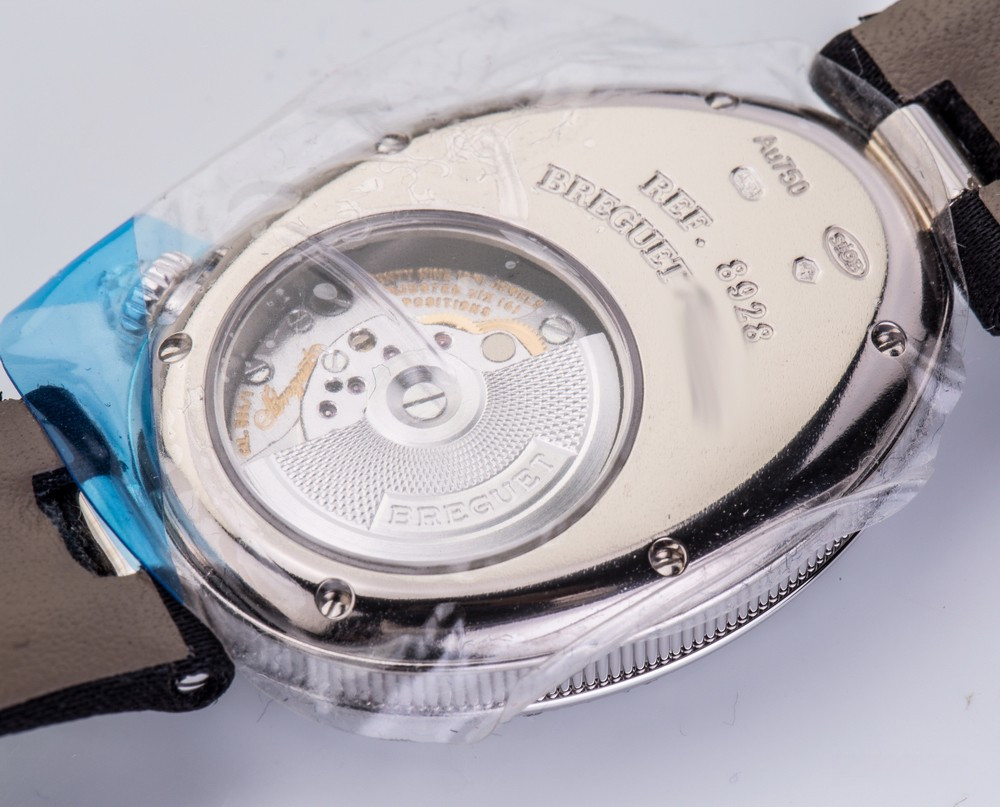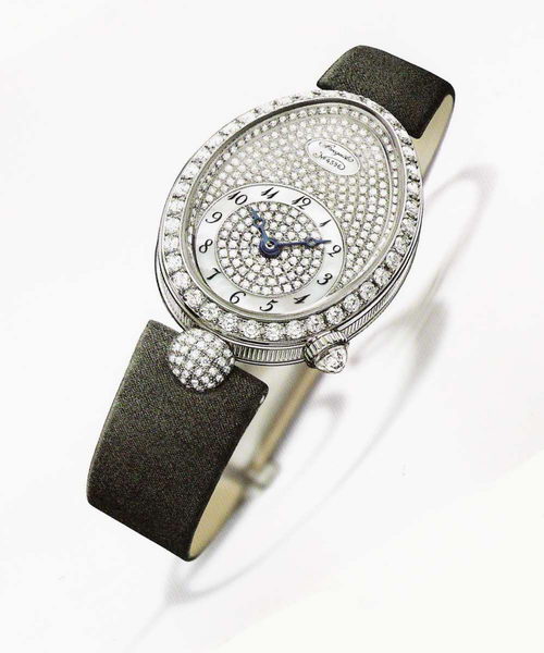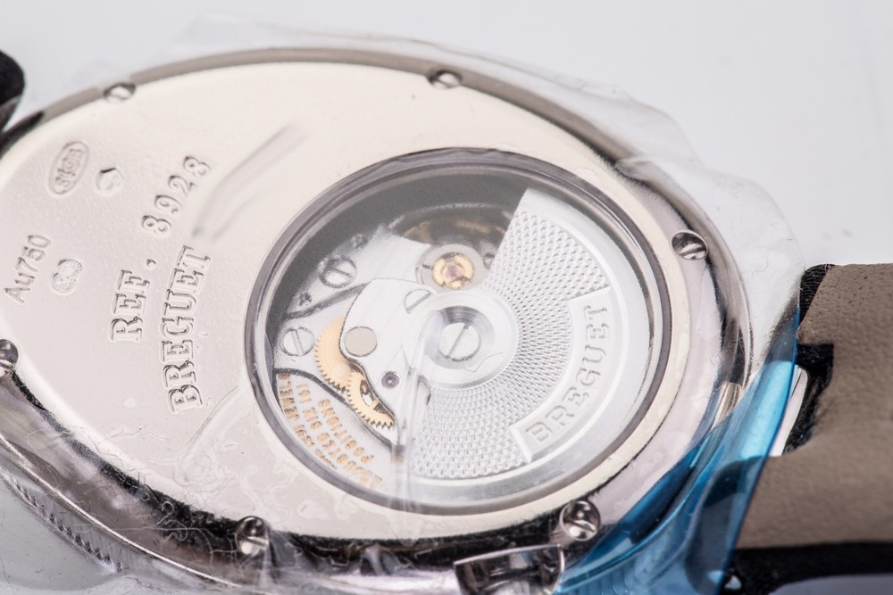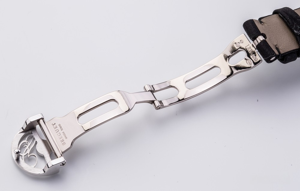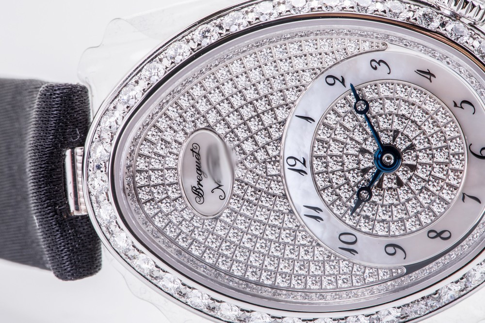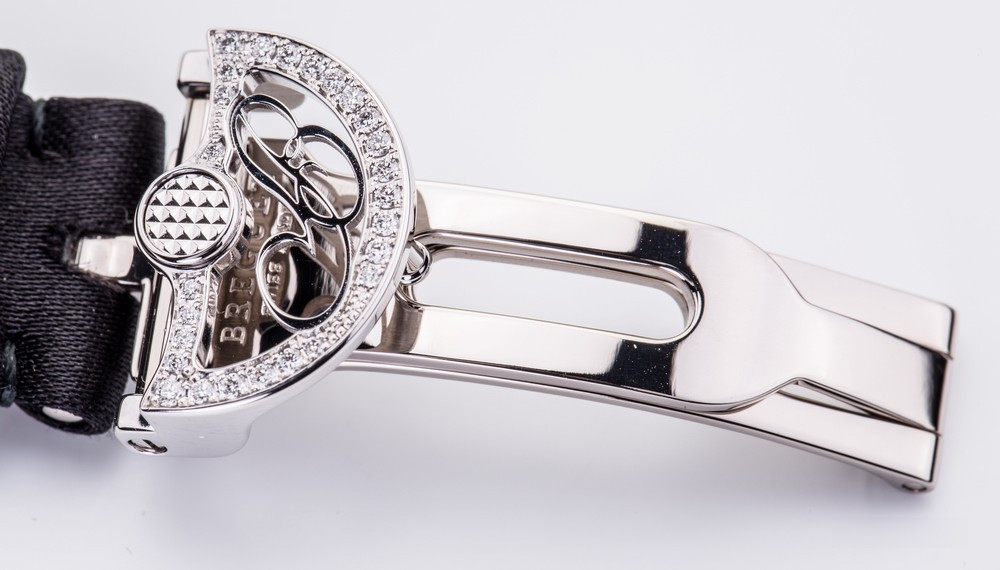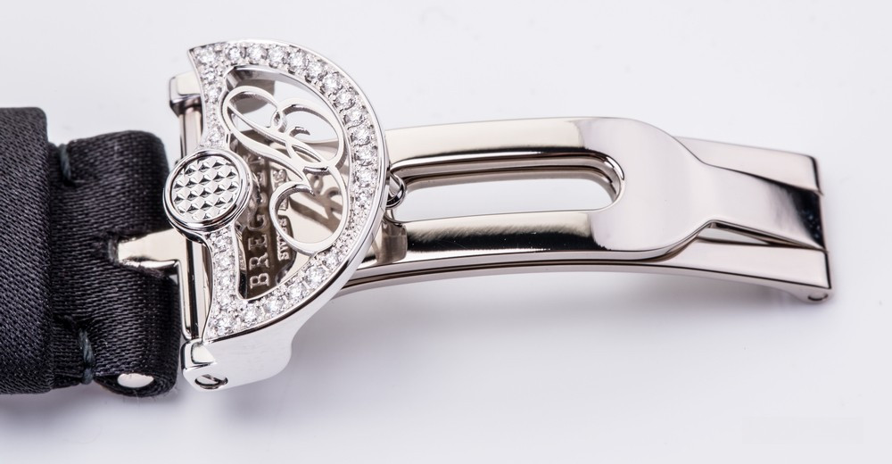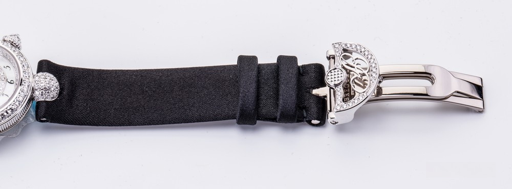 Овальный корпус Breguet Reine de Naples 8928BB/8D/844 DD0D выполнен из 18-каратного белого золота и имеет размеры 33 x 24.95 x 8.6 мм. Заводная головка инкрустирована белым бриллиантом 0.26 ct. Циферблат из посеребренного золота отделан 211 бриллиантами 0,63 ct. Стрелки отлиты из вороненной стали и украшены "яблоками" Breguet. Автоматический механизм 586 имеет запас хода на 40 часов. Водонепроницаемость модели равняется 30 метрам. Безель и ушки корпуса украшены 139 бриллиантами (около 1,32 ct). Задняя крышка выполнена из сапфирового стекла. Часы завершает черный, атласный ремешок оснащенный золотой раскладывающейся застежкой 18 карат. Часы представлены в элегантной фирменной коробке с документами.