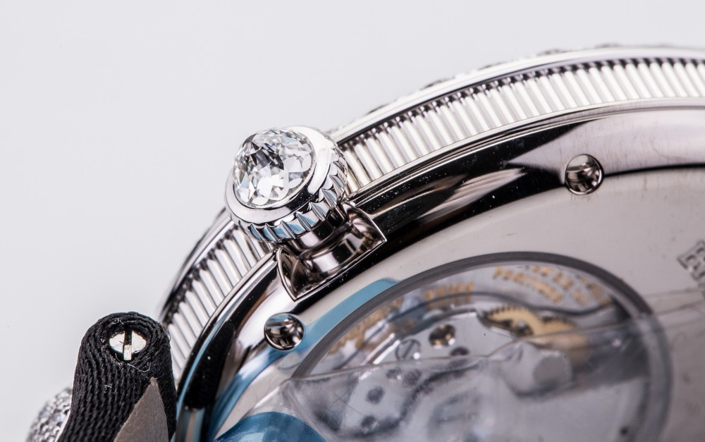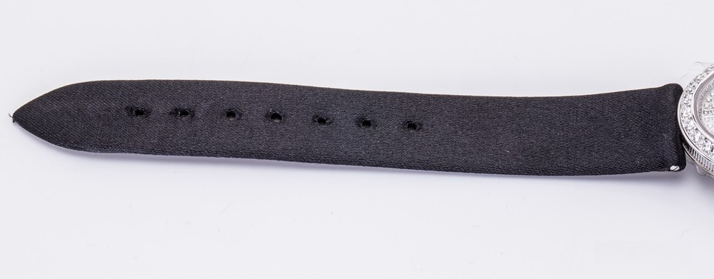 водонепроницаемость 30 м, корпус инкрустирован 139-ю белыми бриллиантами 1.32 ct.