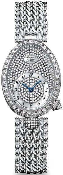 Часы Breguet Reine de Naples 8928BB/8D/J20 DD00 выпущены в корпусе из белого золота 18к, размером 33 х 24.95 х 8.6 мм и водонепроницаемостью 30 м, инкрустированном белыми бриллиантами. Внутри корпуса установлен автоматический механизм, Калибр 586. На серебристом жемчужном циферблате с белыми бриллиантами отображаются часы, минуты. Запас хода 38 часов. Часы комплектуются браслетом из белого золота 18к.