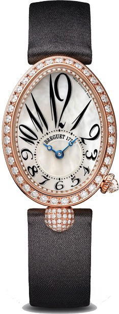 Корпус часового механизма из 18-каратного розового золота с изящно рифленым корпусным кольцом. Безель, обод циферблата и ушко украшены 139 бриллиантами (весом около 1,255 карат). Заводная головка инкрустирована бриллиантом огранки ""бриолет"" (весом около 0,26 карат). Задняя крышка из сапфирового стекла. Размеры: 33 x 24,95 мм. Водонепроницаемость до 3 бар (30 м). Циферблат из натурального белого перламутра. Индивидуальный номер и надпись Breguet Часовая шкала представлена арабскими цифрами Breguet, смещающимися к положению «6 часов». Стрелки Breguet с открытым наконечником из вороненой стали. Механизм с автоподзаводом, калибр 586/1. Номер и надпись Breguet 6¾ линий. 29 камней. Запас хода 38 часов. Перевернутый однорядный спусковой механизм с кремниевыми анкерами. Кремниевая спираль Частота колебаний балансира составляет 3 Гц. Механизм отрегулирован в 6 положениях. Атласный ремешок с золотой застежкой-клипсой, инкрустированной 26 бриллиантами (весом около 0,12 карат).