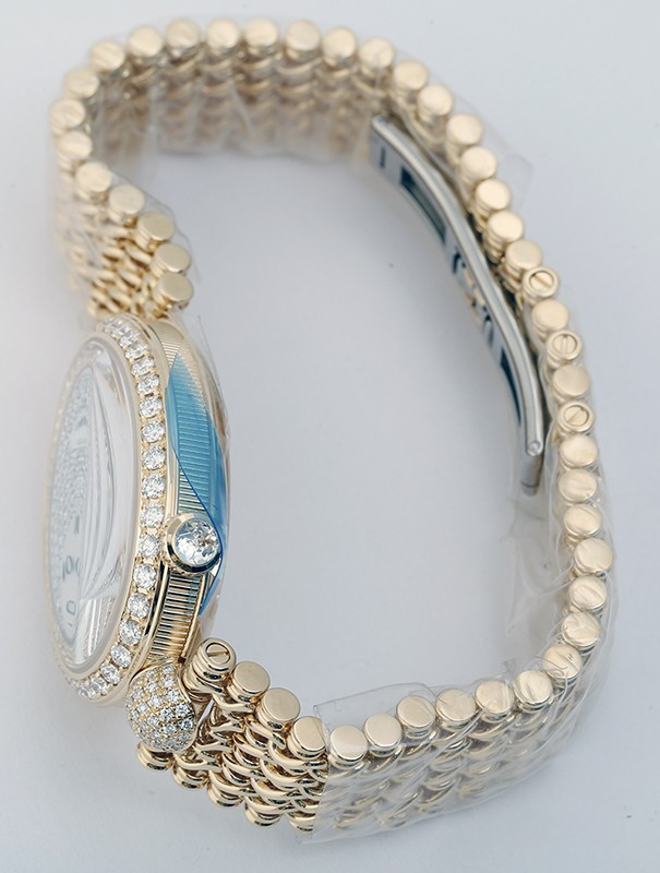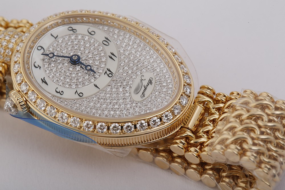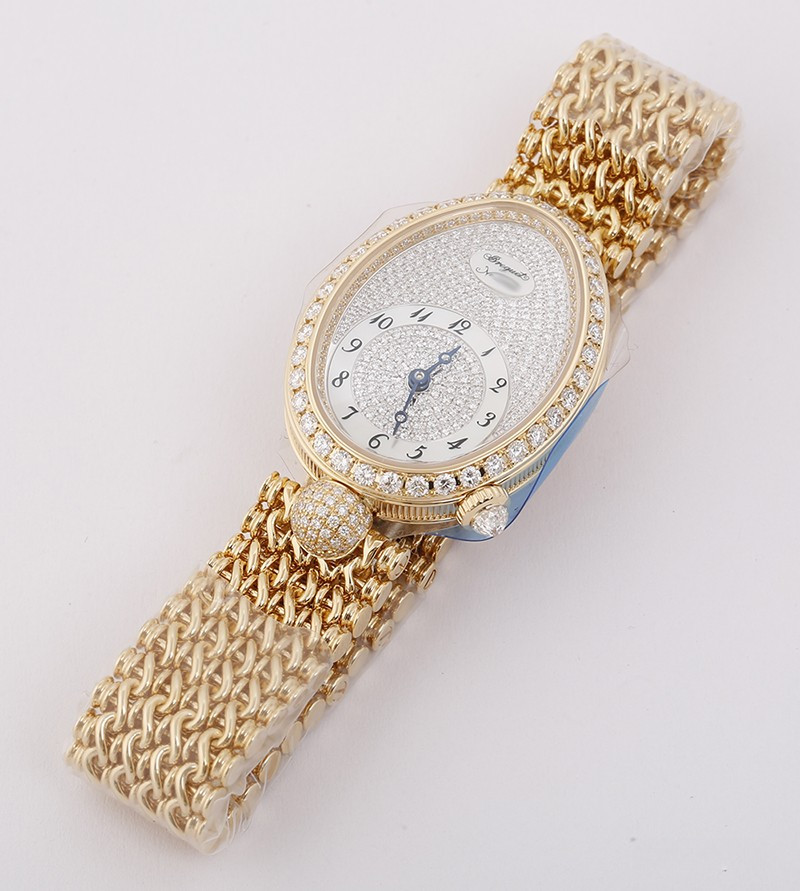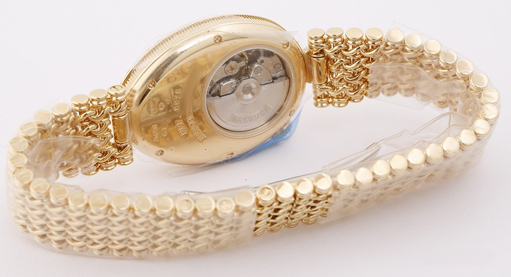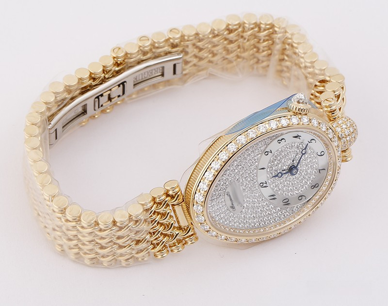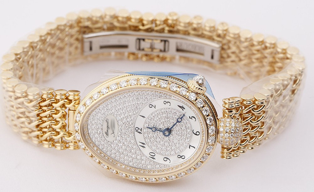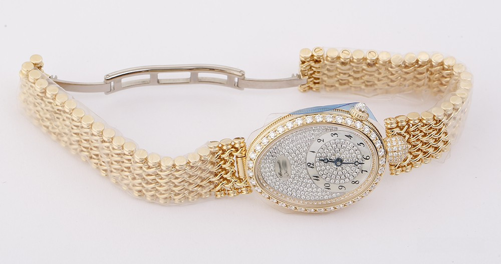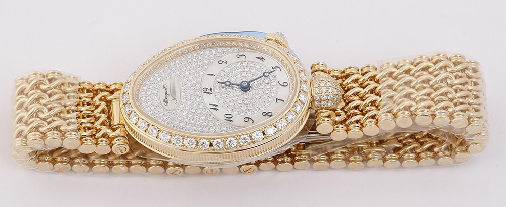 Часы Breguet Reine de Naples 8928BA/8D/J20 DD00 выпущены в корпусе из желтого золота 18к, размером 33 х 24.95 х 8.6 мм и водонепроницаемостью 30 м, инкрустированном белыми бриллиантами. Внутри корпуса установлен автоматический механизм, Калибр 586. На серебристом циферблате с белыми бриллиантами отображаются часы, минуты. Запас хода 38 часов. Часы комплектуются браслетом из желтого золота 18к.
