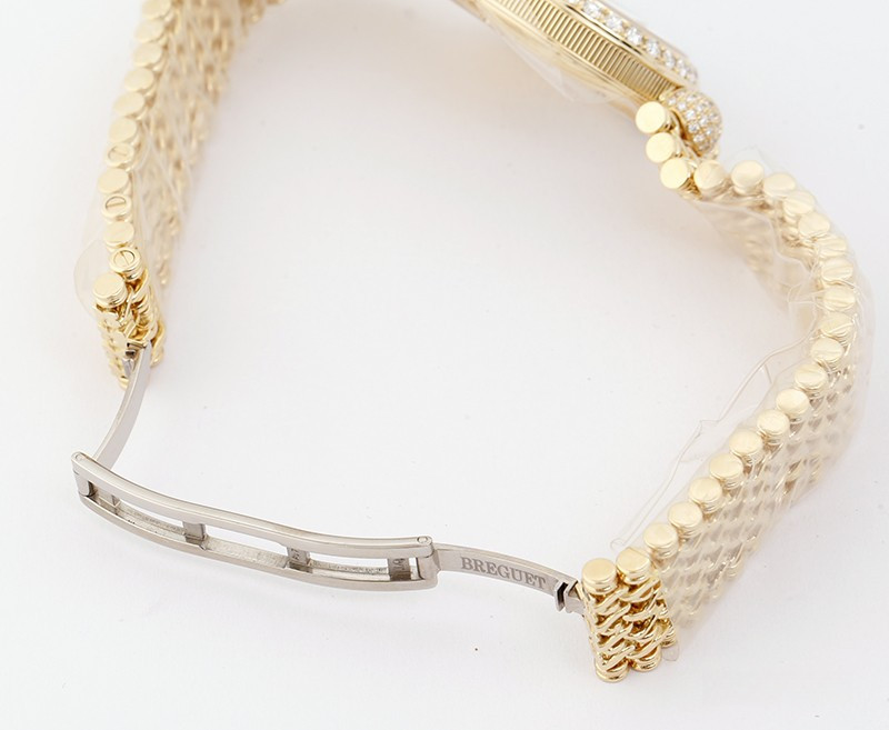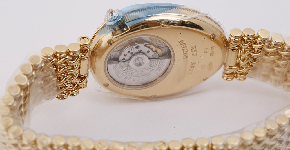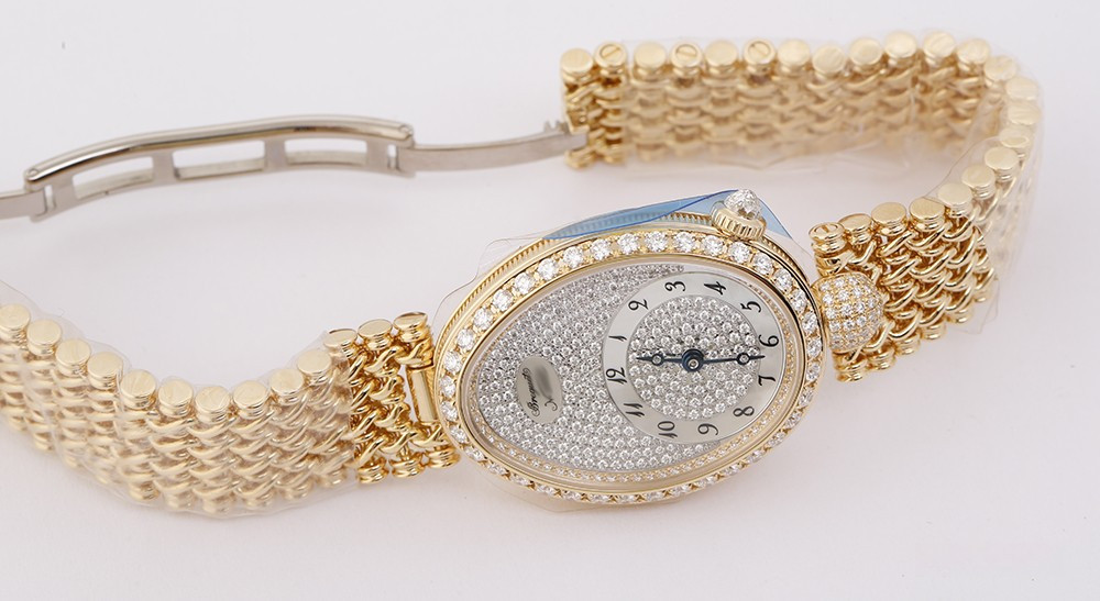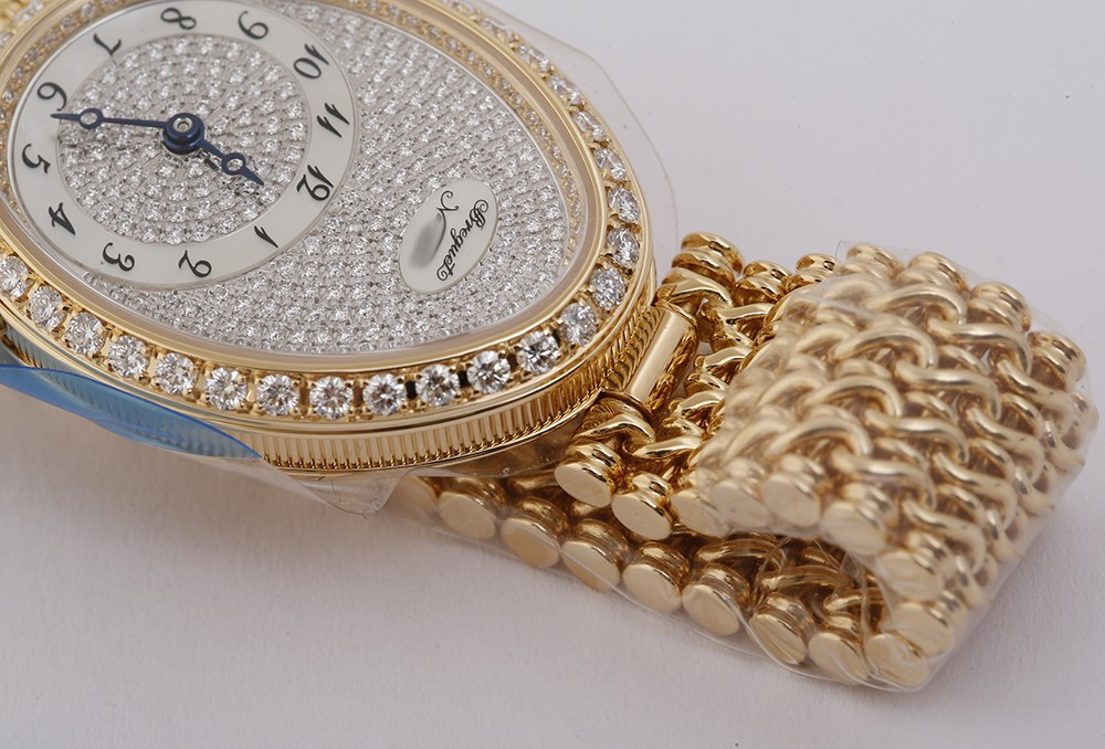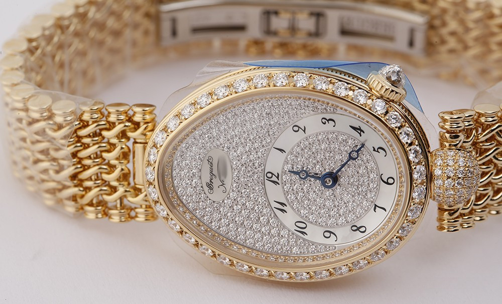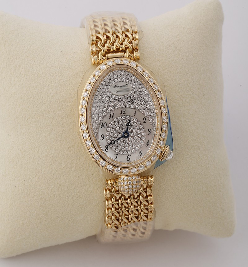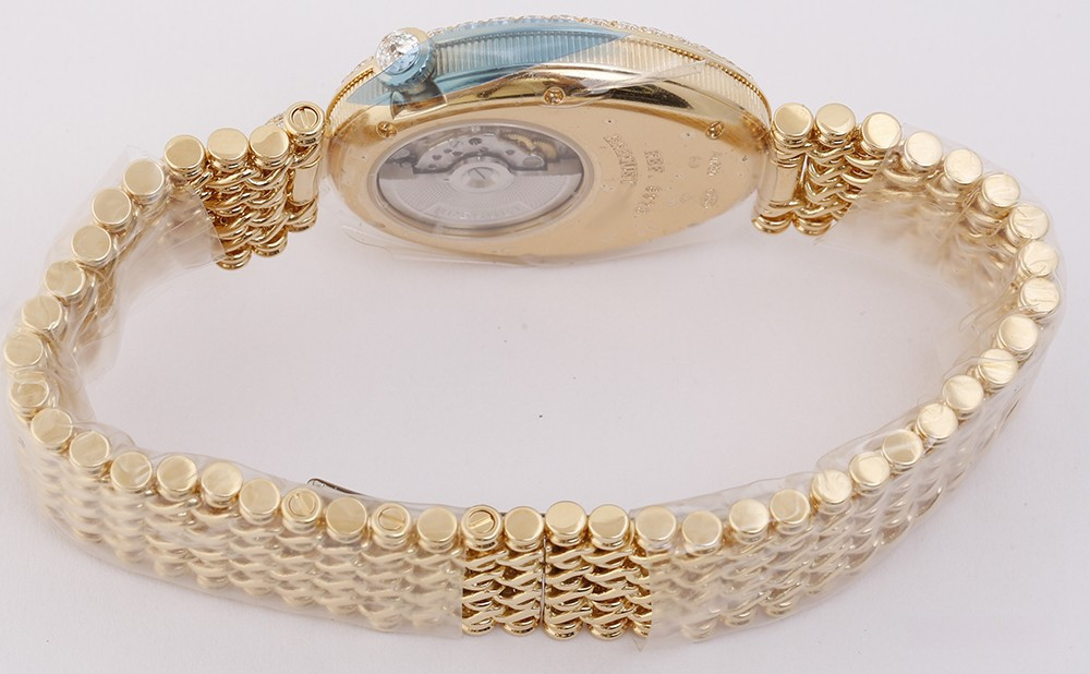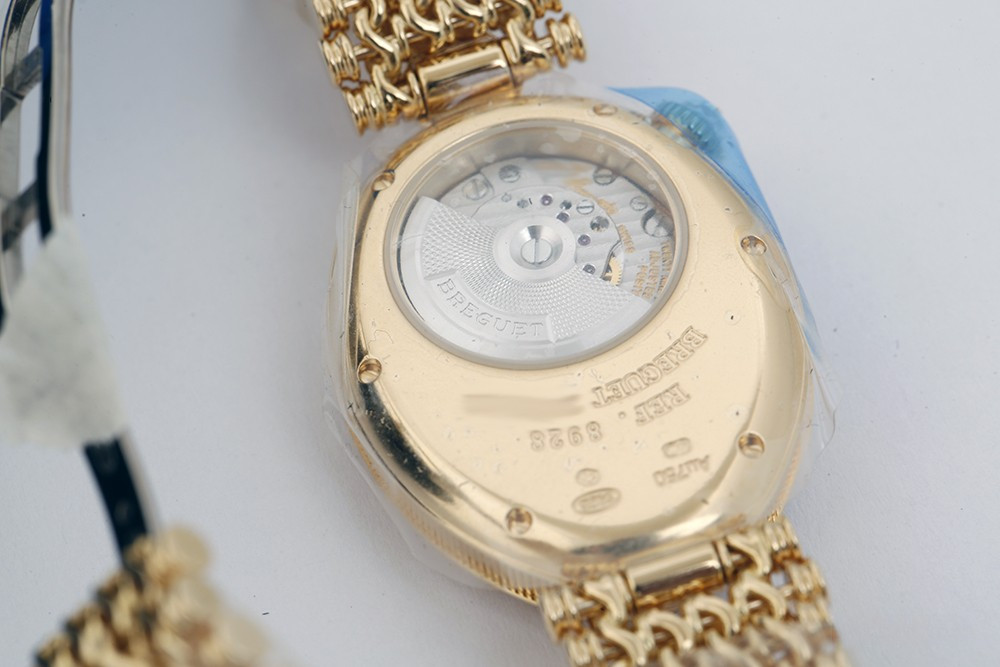 Часы Breguet Reine de Naples 8928BA/8D/J20 DD00 выпущены в корпусе из желтого золота 18к, размером 33 х 24.95 х 8.6 мм и водонепроницаемостью 30 м, инкрустированном белыми бриллиантами. Внутри корпуса установлен автоматический механизм, Калибр 586. На серебристом циферблате с белыми бриллиантами отображаются часы, минуты. Запас хода 38 часов. Часы комплектуются браслетом из желтого золота 18к.
