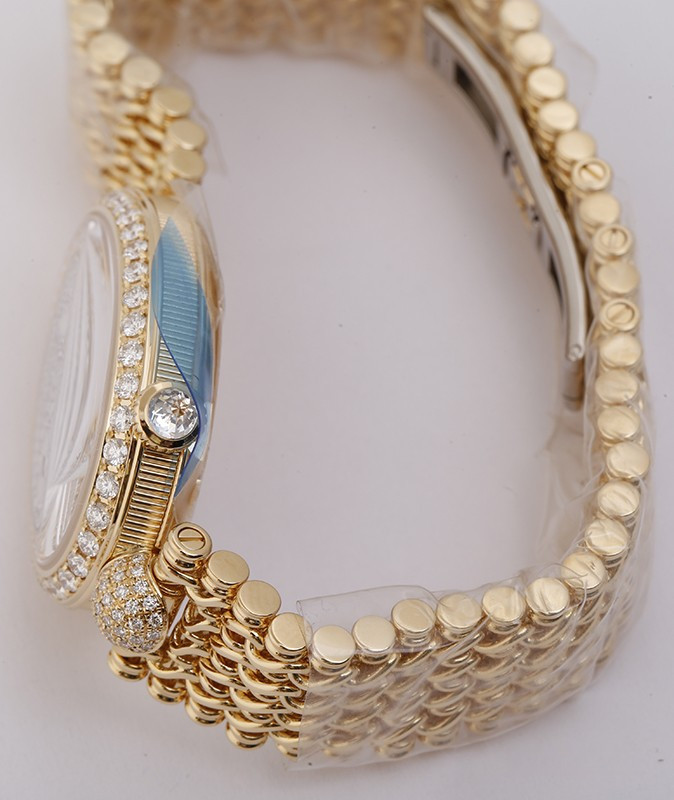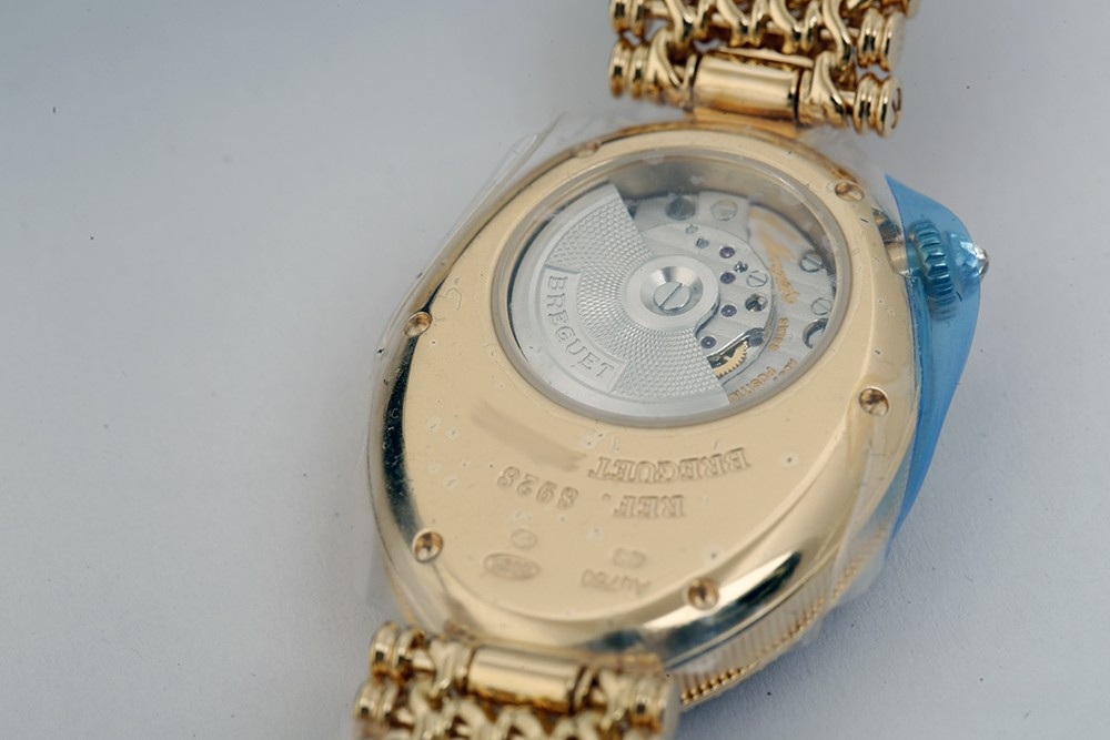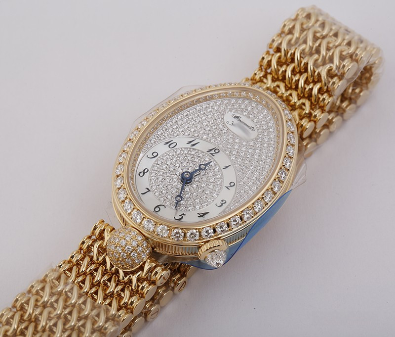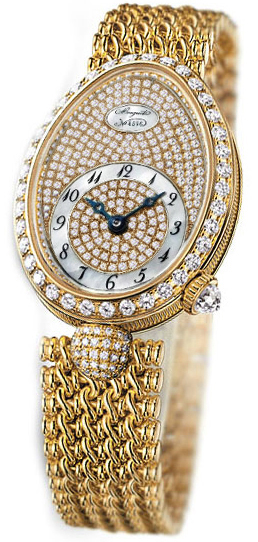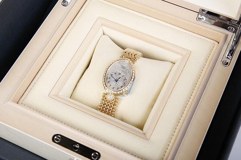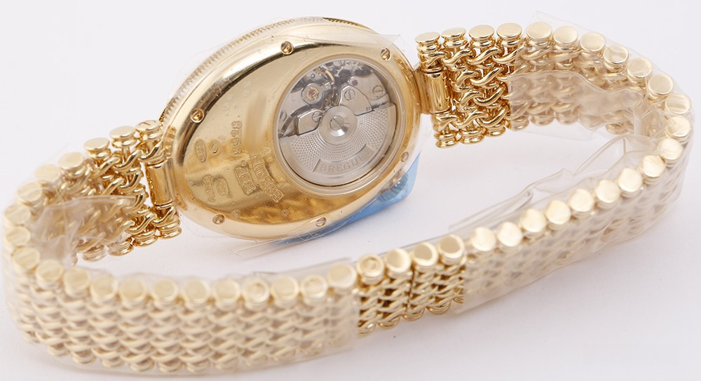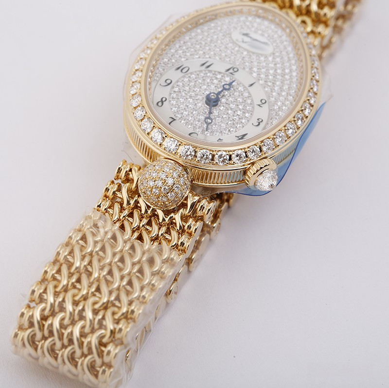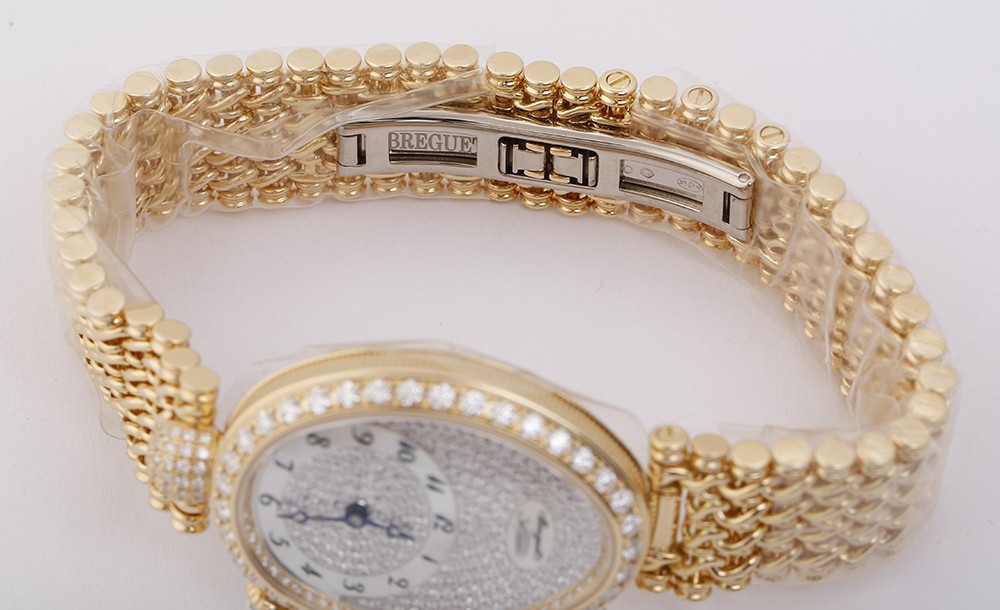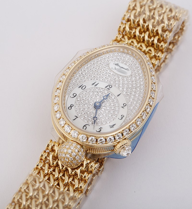 Часы Breguet Reine de Naples 8928BA/8D/J20 DD00 выпущены в корпусе из желтого золота 18к, размером 33 х 24.95 х 8.6 мм и водонепроницаемостью 30 м, инкрустированном белыми бриллиантами. Внутри корпуса установлен автоматический механизм, Калибр 586. На серебристом циферблате с белыми бриллиантами отображаются часы, минуты. Запас хода 38 часов. Часы комплектуются браслетом из желтого золота 18к.