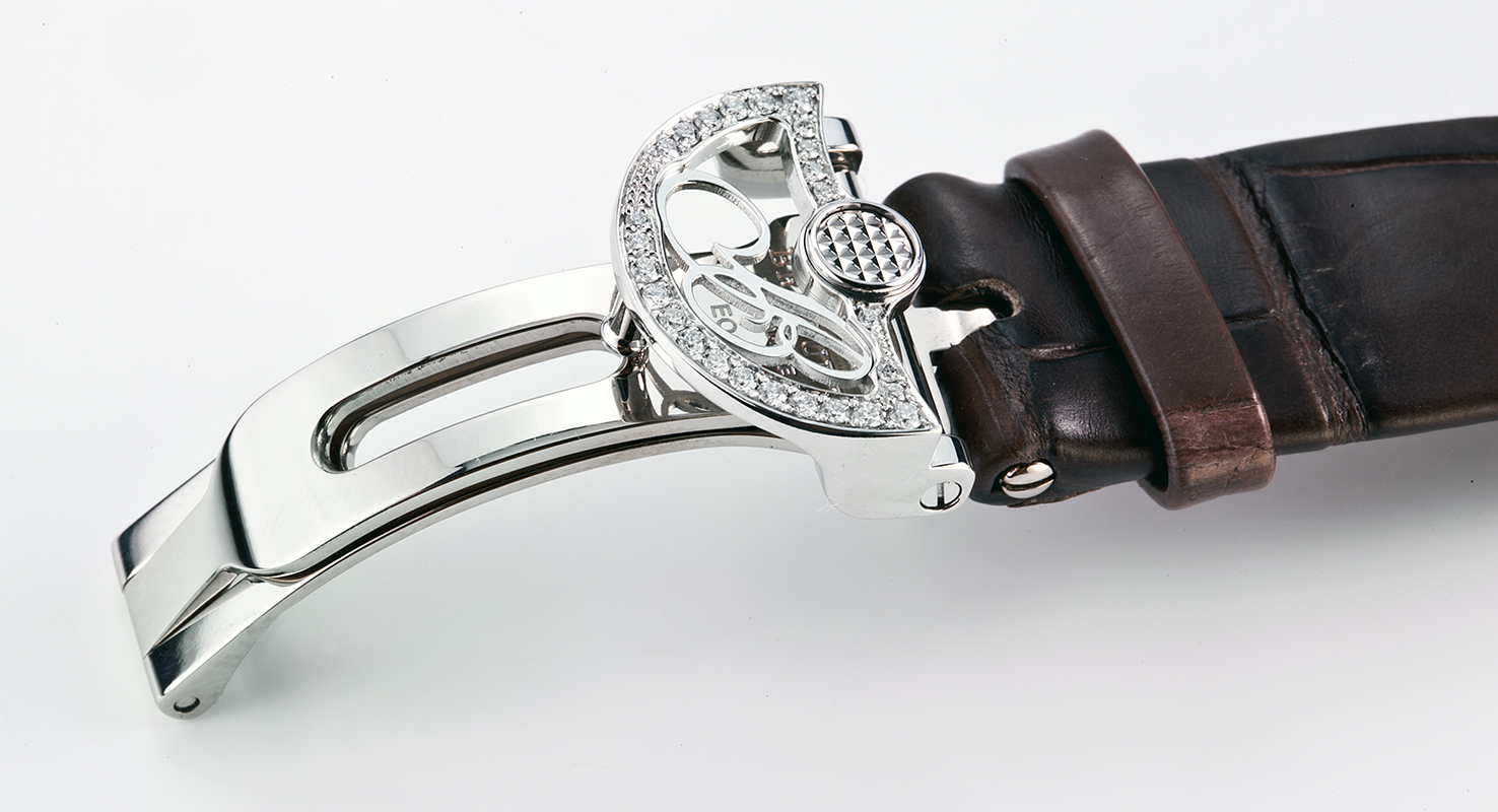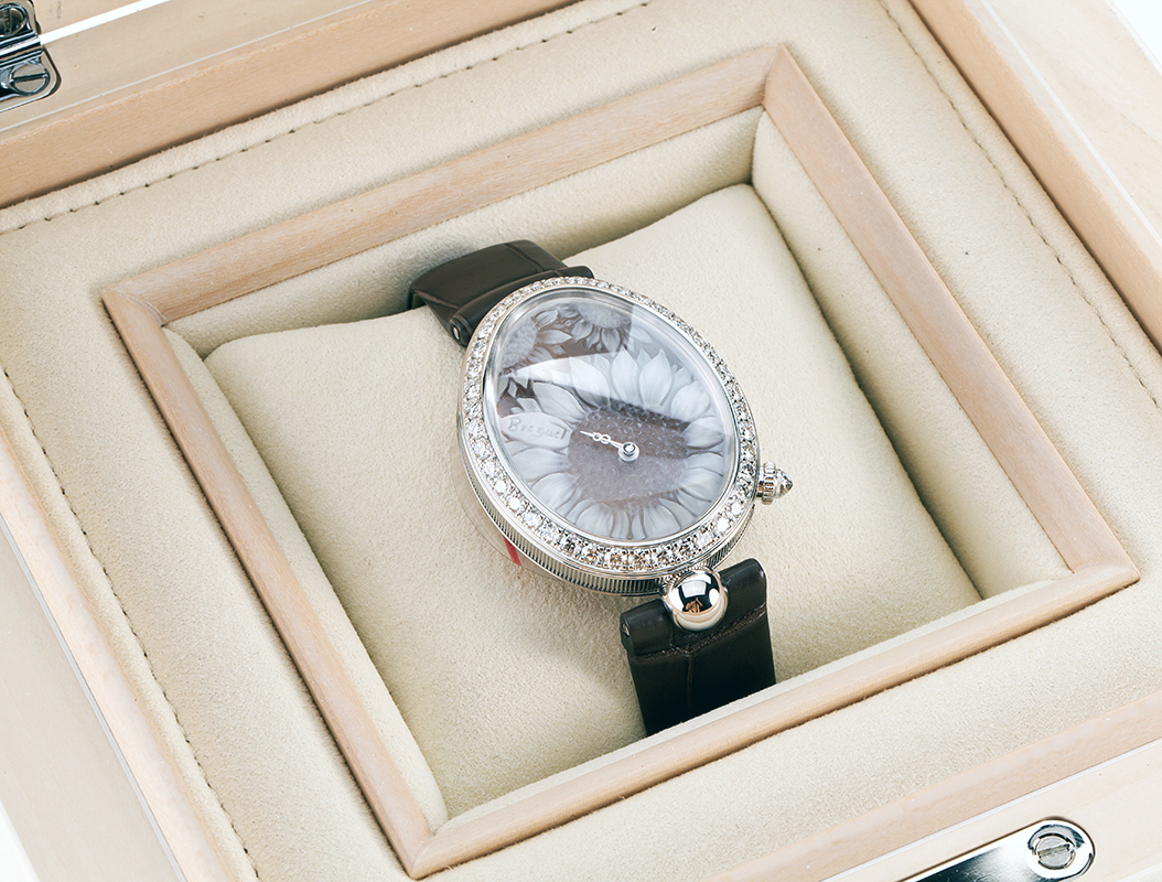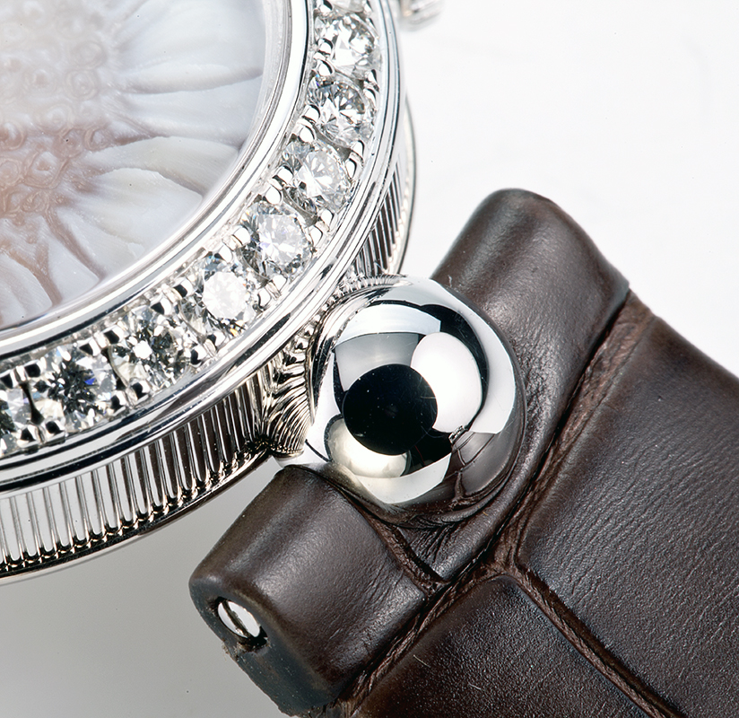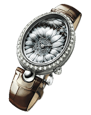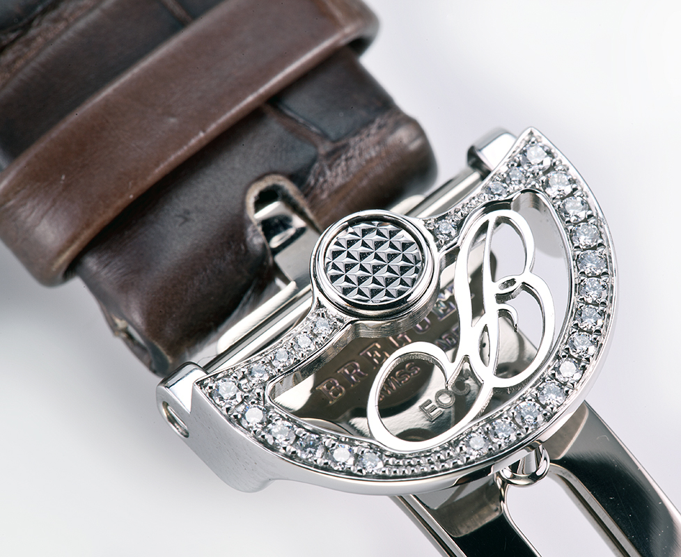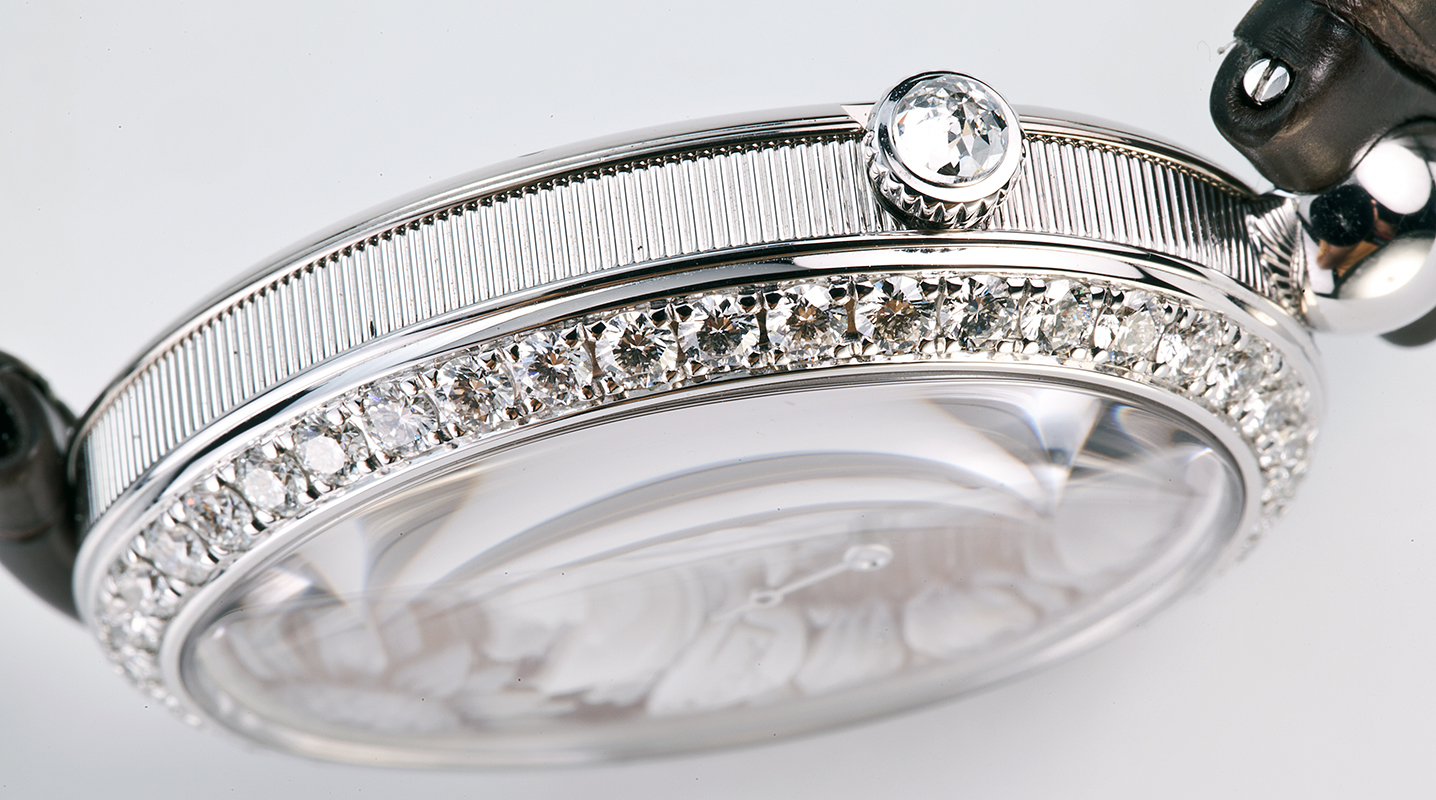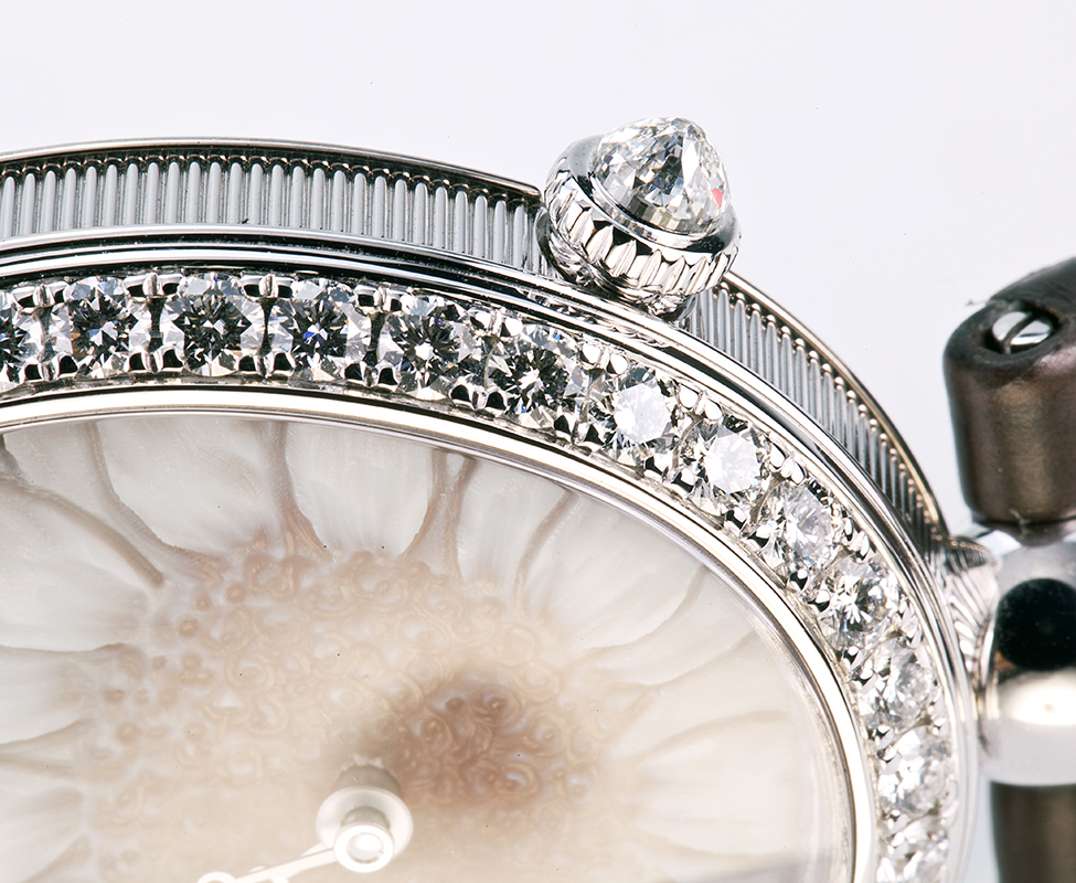 водонепроницаемость 30 м, безель из 40-а белых бриллиантов 2.42 ct., заводной ключ инкрустирован белым бриллиантом 0.26 ct.