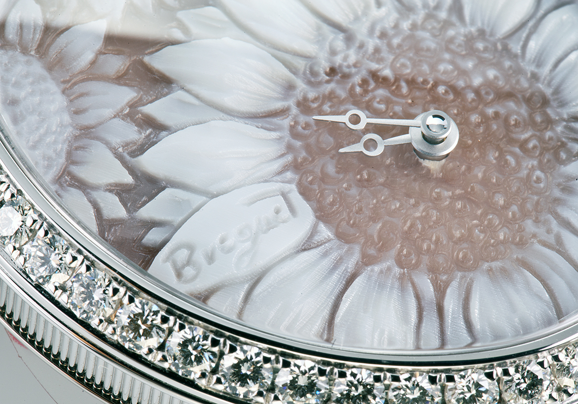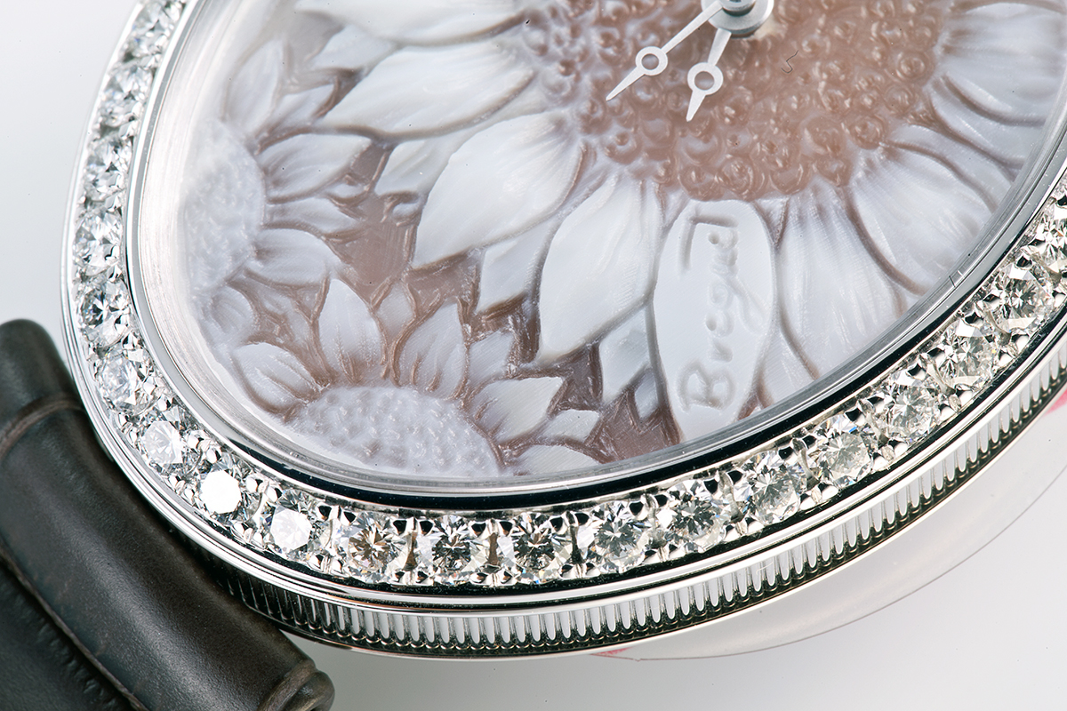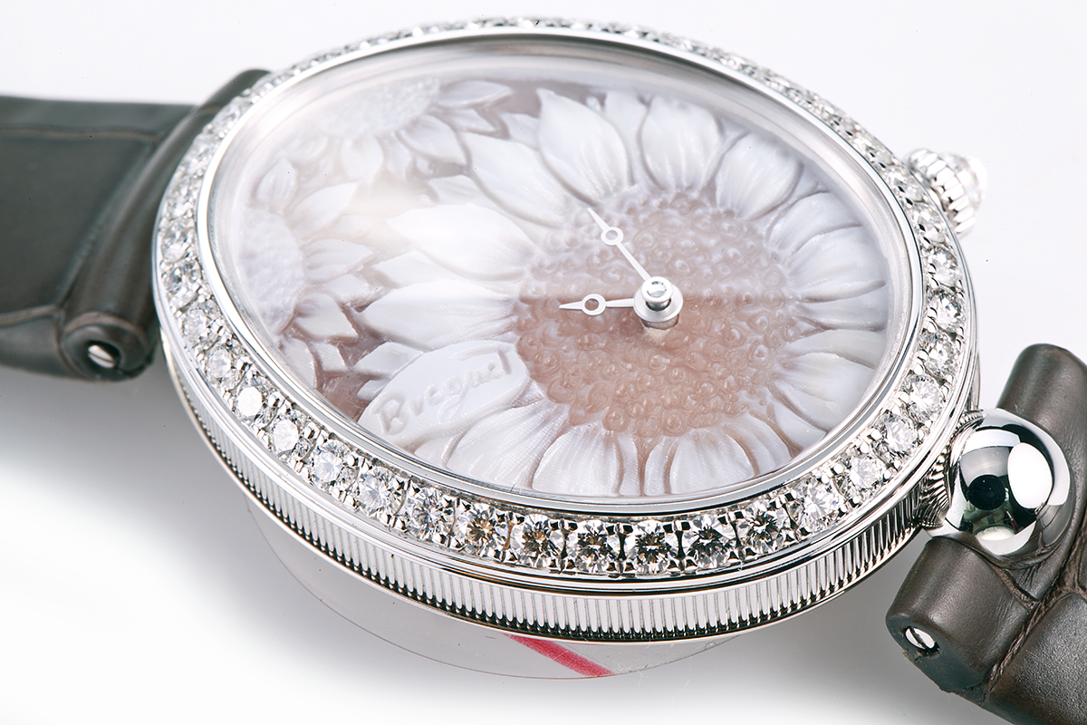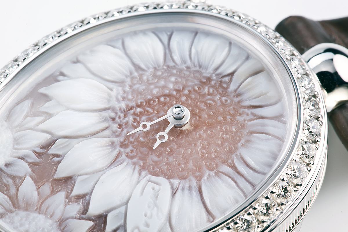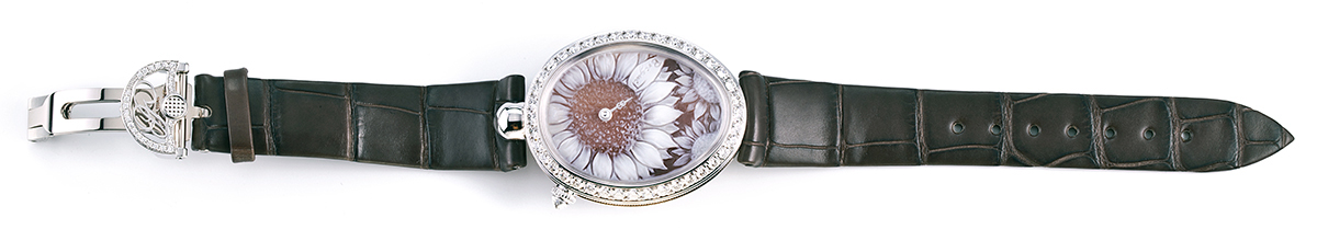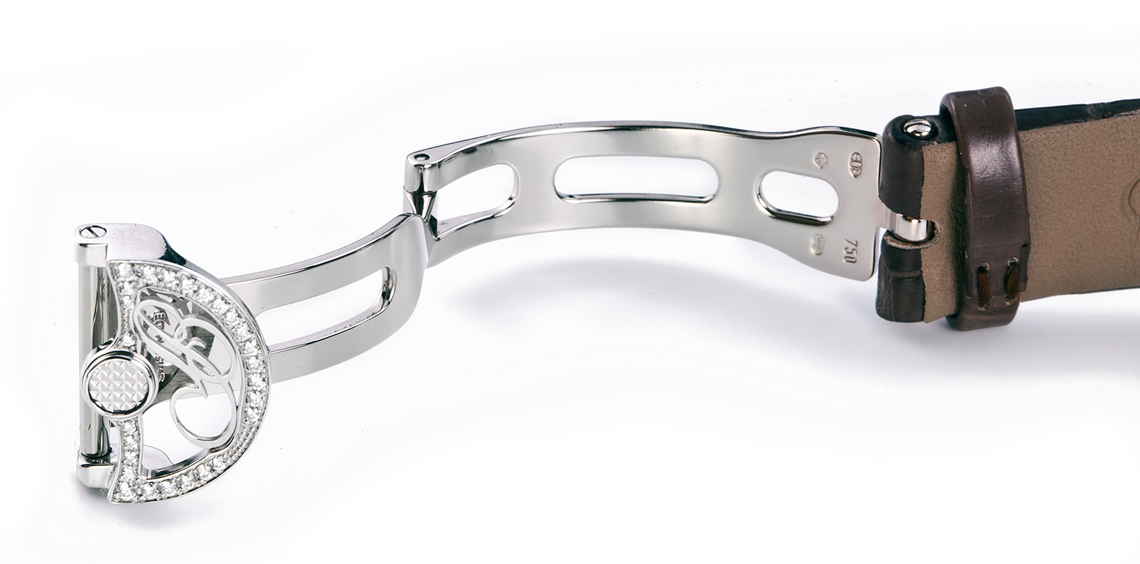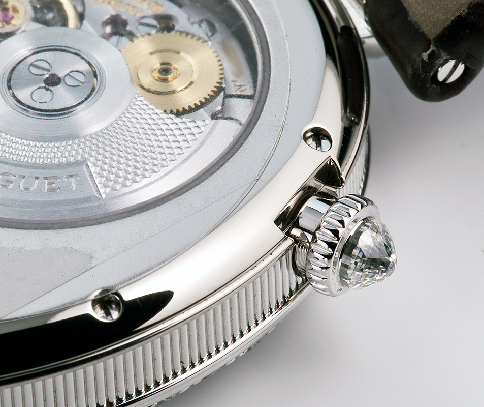 водонепроницаемость 30 м, безель из 40-а белых бриллиантов 2.42 ct., заводной ключ инкрустирован белым бриллиантом 0.26 ct.