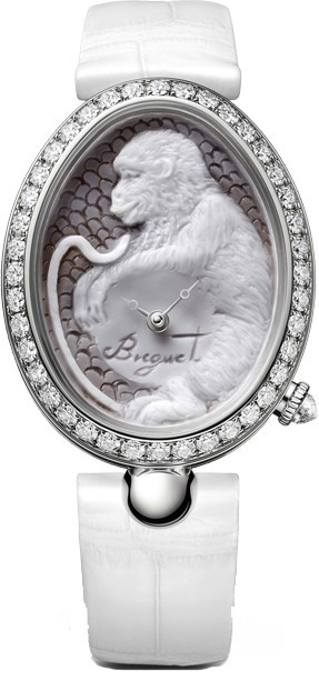 Часы Breguet Reine de Naples 8958BB/55/974 08/D00D выпущены в корпусе из белого золота 18к, размером 40 х 31.95 х 10.15 мм и водонепроницаемостью 30 м с безелем из 40-а белых бриллиантов 2.42ct. и заводным ключом, инкрустированным белым бриллиантом 0.26 ct. Внутри корпуса установлен автоматический механизм, Калибр 537/1. На сером с камеей из морской раковины циферблате отображаются часы, минуты. Запас хода 40 часов. Часы комплектуются ремешком из кожи аллигатора с золотой 18к вставкой, инкрустированной 26-ю белыми бриллиантами 0.14 ct. и откидной застежкой.