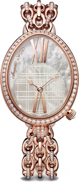 Корпус часового механизма из 18-каратного розового золота с изящно рифленым корпусным кольцом. Безель и ушко украшены 83 бриллиантами (весом около 1,53 карат). Заводная головка инкрустирована перевернутым бриллиантом (весом около 0,15 карат) Задняя крышка из сапфирового стекла. Размеры: 43 x 34,95 мм. Водонепроницаемость до 3 бар (30 м). Гильошированный циферблат из натурального белого перламутра. Индивидуальный номер и надпись Breguet Накладные изогнутые римские цифры в розовом золоте на отметке 6 и 12 часов. Стрелки Breguet с открытым наконечником из розового золота. Механизм с автоподзаводом, калибр 591C. Номер и надпись Breguet 111/2 линий. 25 камней. Запас хода 38 часов. Анкерное колесо и однорядный швейцарский спусковой механизм из кремния. Кремниевая спираль Частота колебаний балансира составляет 4 Гц. Механизм отрегулирован в 6 положениях. Часы комплектуются браслетом из розового золота, инкрустированным 104 бриллиантами алмазной огранки.
