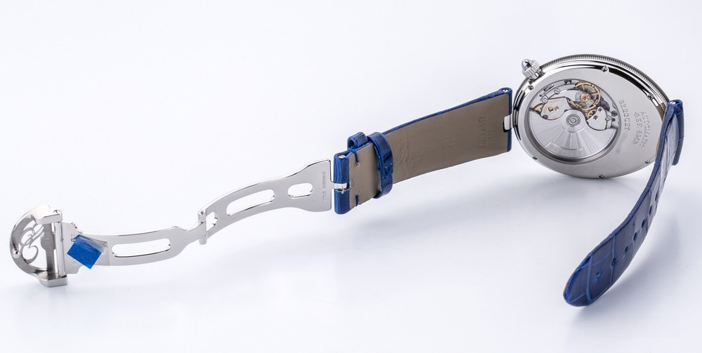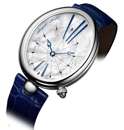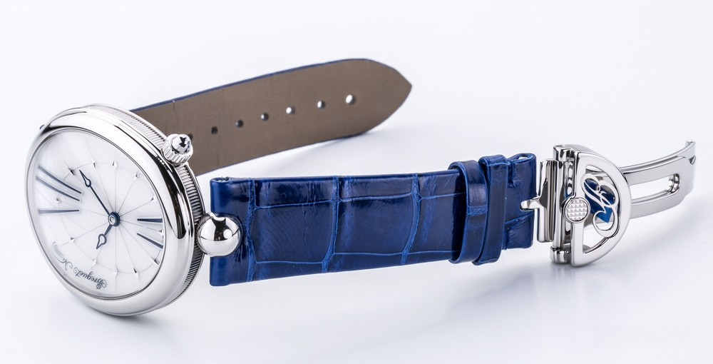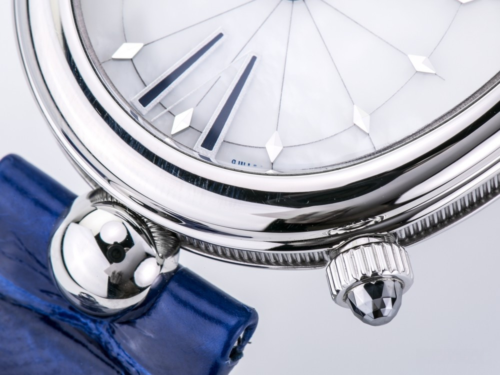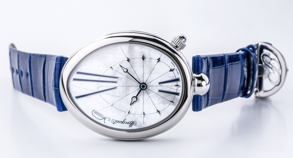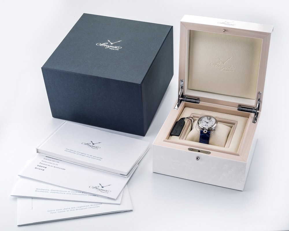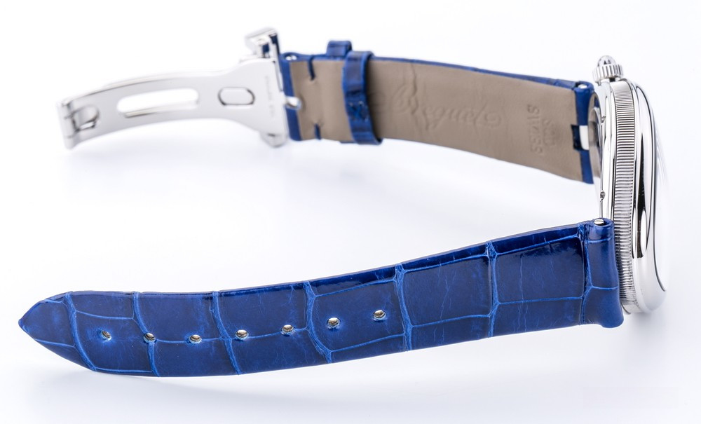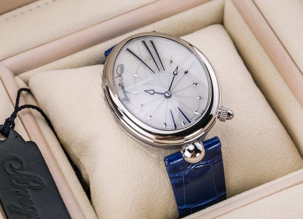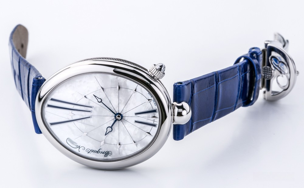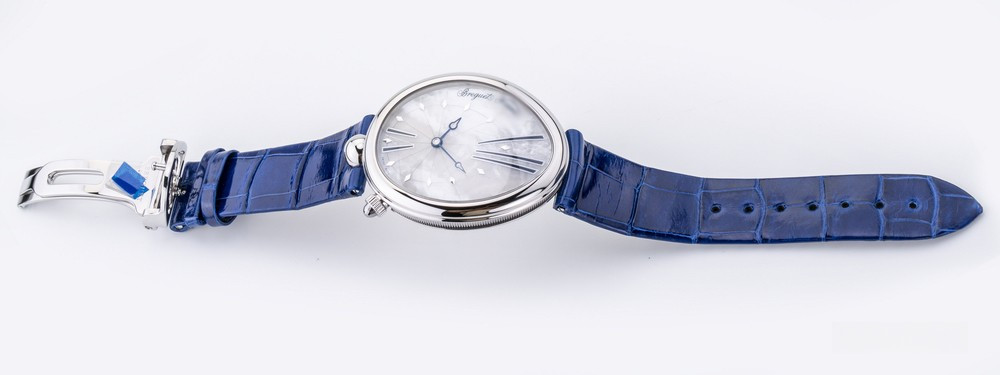 Женские часы Breguet Reine de Naples 8967 ST/51/986 оснащены автоматическим механизмом, Калибр 591C с кремниевым волоском и спуском. Запас хода механизма составляет приблизительно 38 часов. Размеры корпуса из нержавеющей стали составляют 43.75 x 35.5 x 9.45 мм. Белый перламутровый циферблат со стрелками из вороненной стали, украшенными "яблоками" Breguet. Сапфировое стекло установлено с обеих сторон корпуса. Часы дополнены синим ремешком из кожи аллигатора с раскладывающейся застежкой из нержавеющей стали. Неповоротный безель также выполнен из нержавеющей стали. Водонепроницаемость корпуса до 30 м. Часы Бреге пользовались огромным успехом у самых знаменитых женщин своего времени – королевы Франции Марии-Антуанетты, маркизы Кондорсе и императрицы Жозефины. С присущим им вниманием к деталям мастера Breguet продолжают создавать современные ювелирные часы, которые являются подлинным символом женственности и утонченности. Часы представлены в элегантной фирменной коробке с документами.