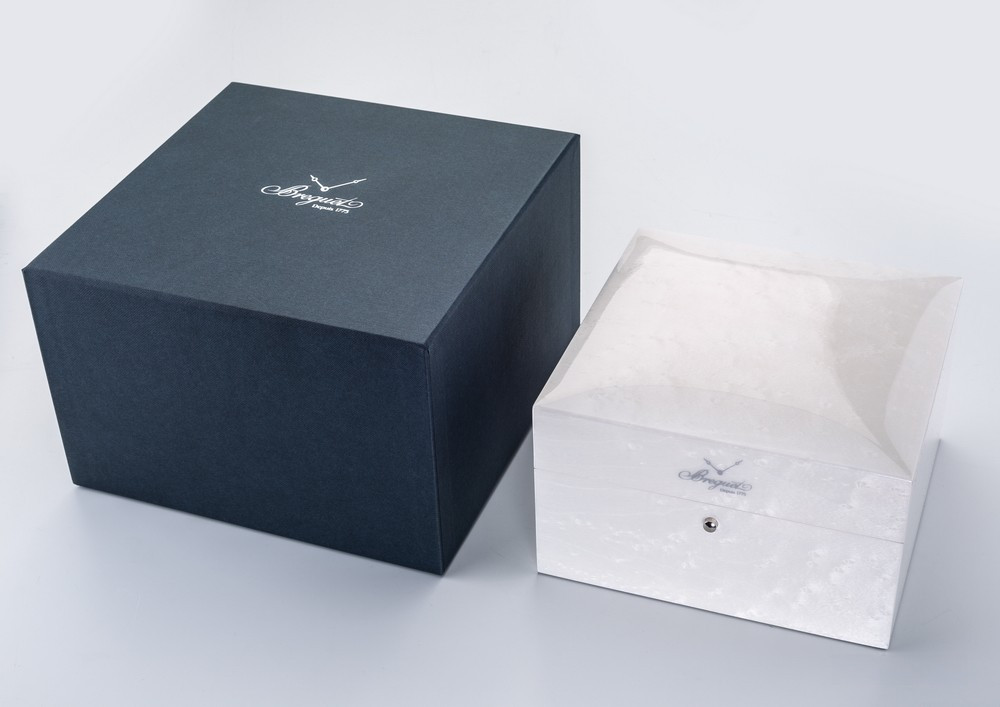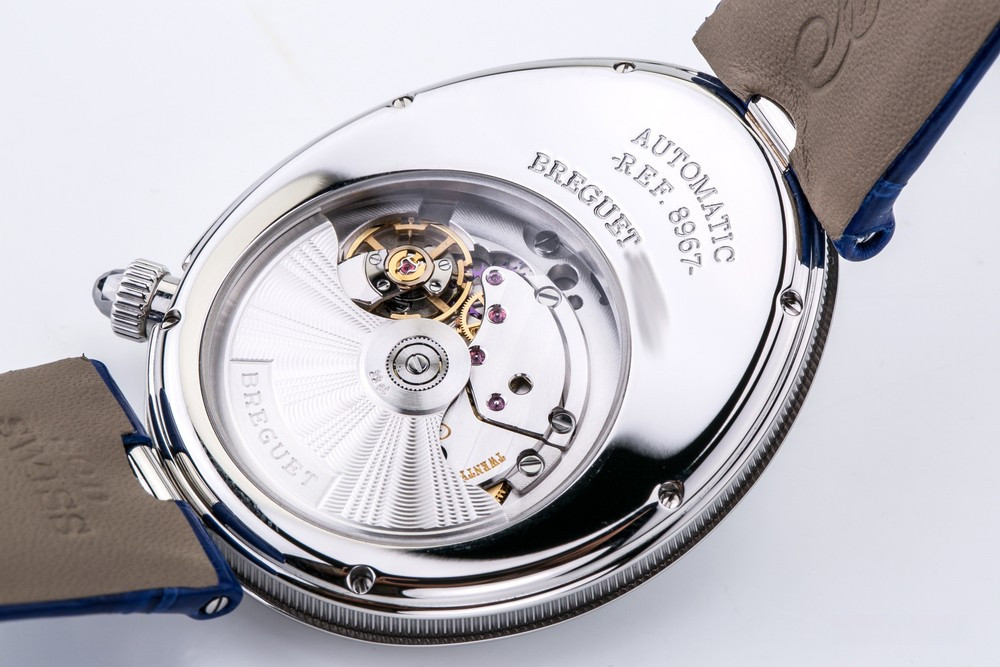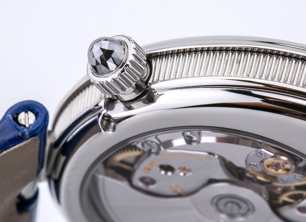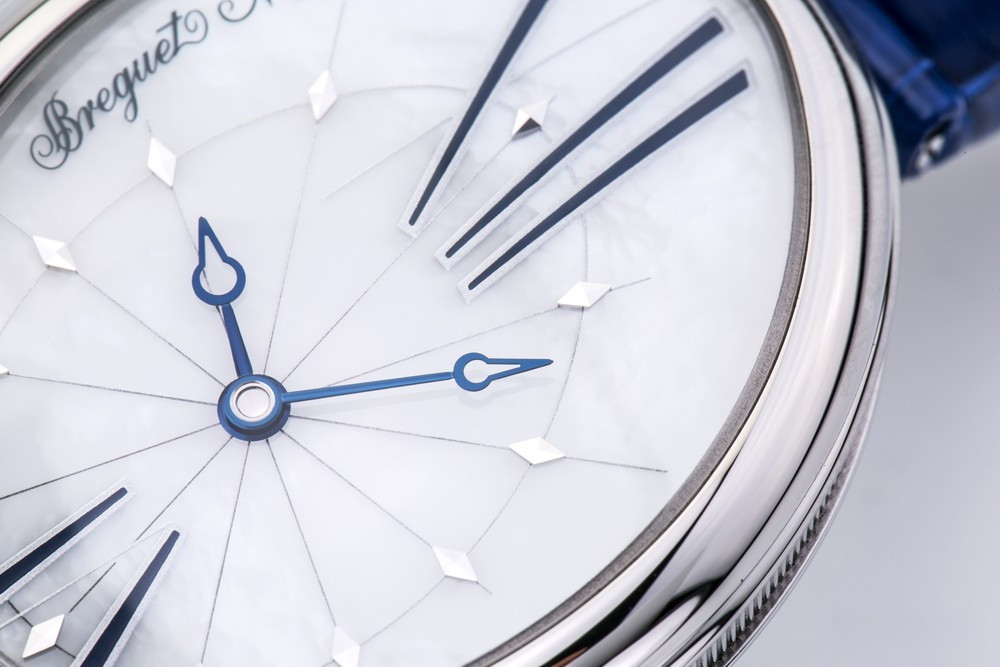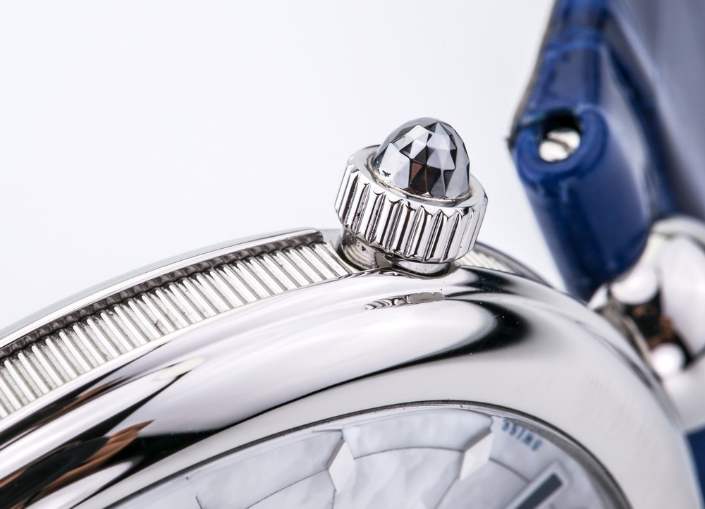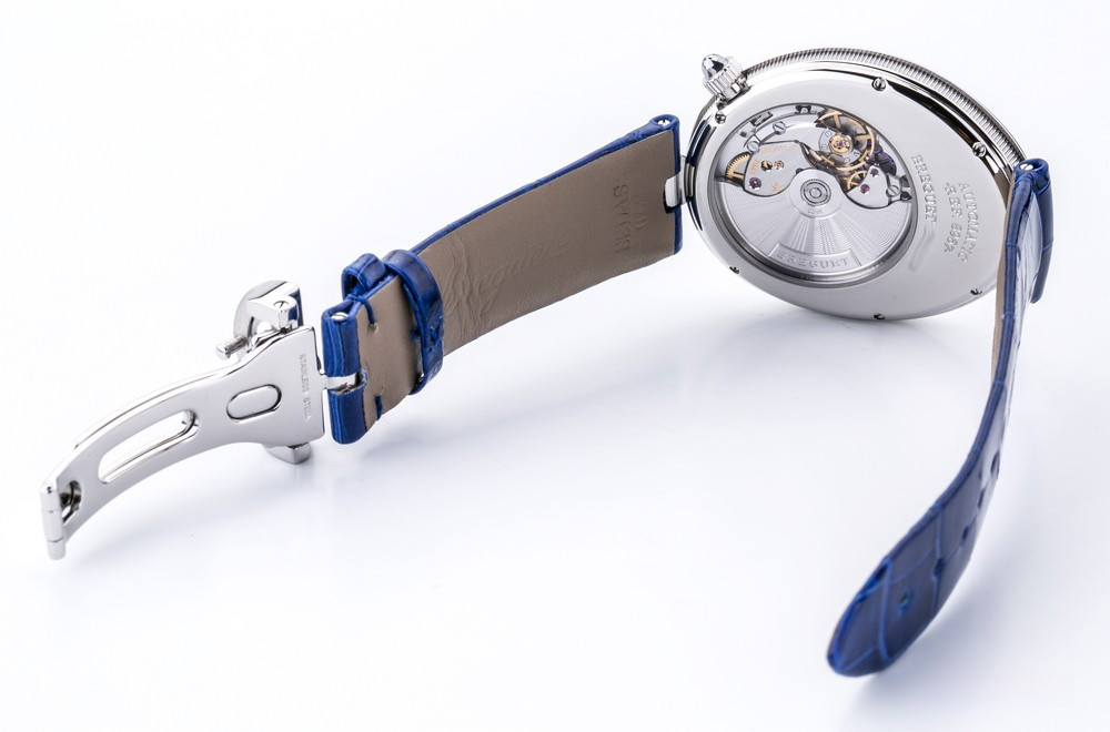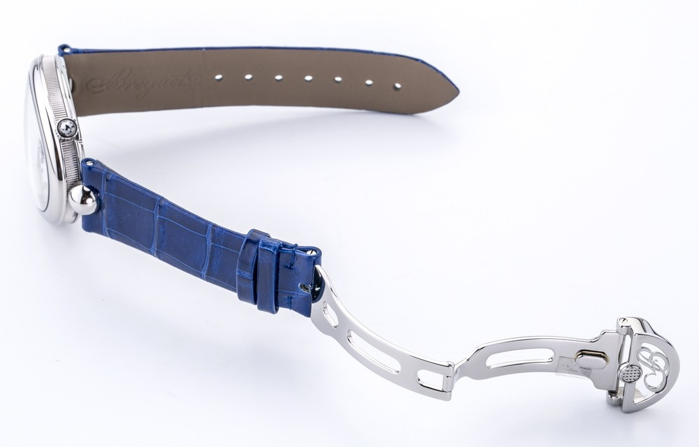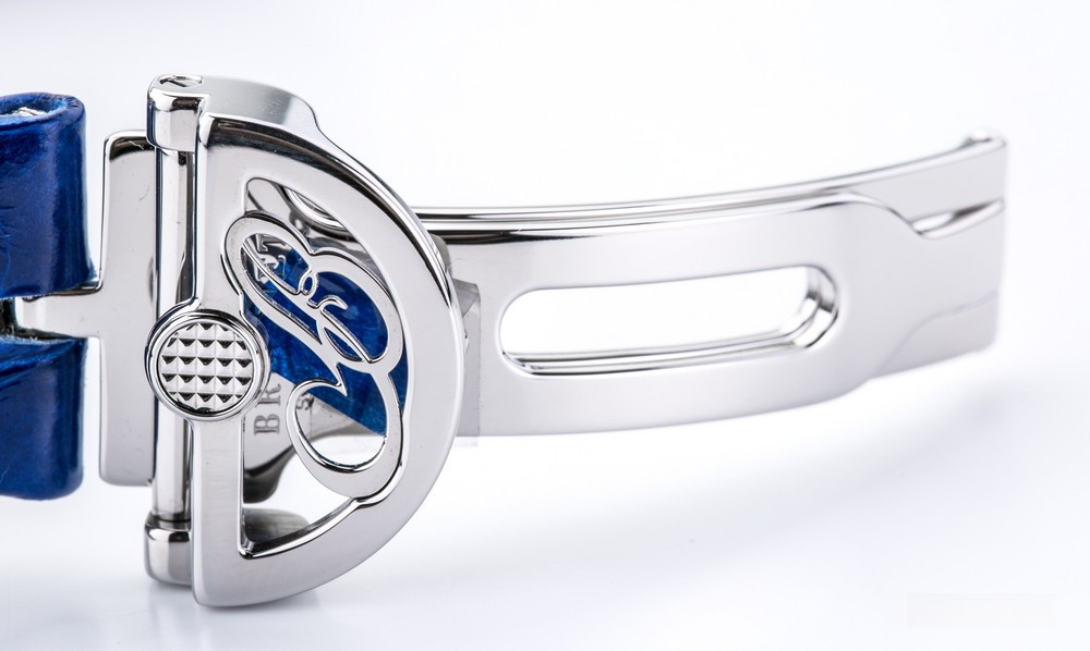 Женские часы Breguet Reine de Naples 8967 ST/51/986 оснащены автоматическим механизмом, Калибр 591C с кремниевым волоском и спуском. Запас хода механизма составляет приблизительно 38 часов. Размеры корпуса из нержавеющей стали составляют 43.75 x 35.5 x 9.45 мм. Белый перламутровый циферблат со стрелками из вороненной стали, украшенными "яблоками" Breguet. Сапфировое стекло установлено с обеих сторон корпуса. Часы дополнены синим ремешком из кожи аллигатора с раскладывающейся застежкой из нержавеющей стали. Неповоротный безель также выполнен из нержавеющей стали. Водонепроницаемость корпуса до 30 м. Часы Бреге пользовались огромным успехом у самых знаменитых женщин своего времени – королевы Франции Марии-Антуанетты, маркизы Кондорсе и императрицы Жозефины. С присущим им вниманием к деталям мастера Breguet продолжают создавать современные ювелирные часы, которые являются подлинным символом женственности и утонченности. Часы представлены в элегантной фирменной коробке с документами.