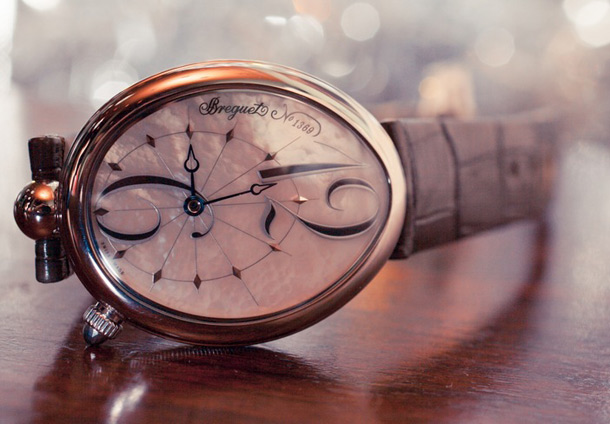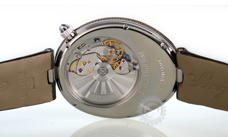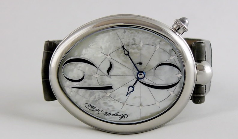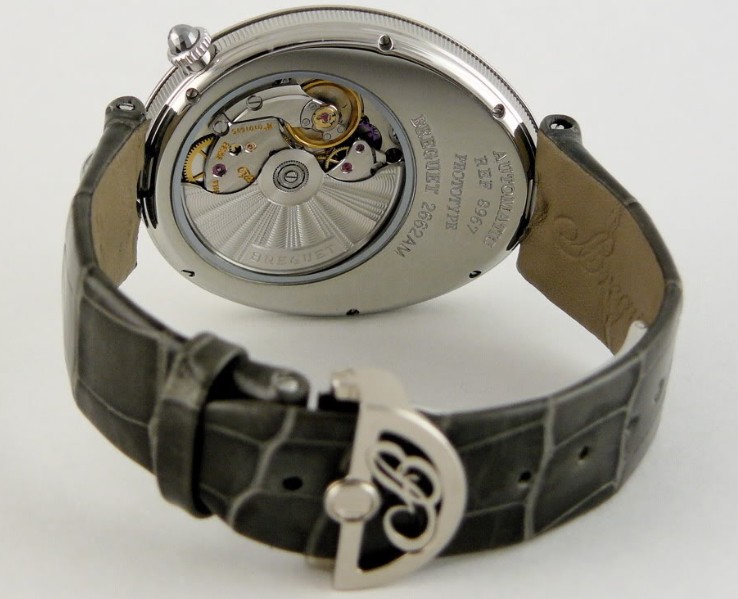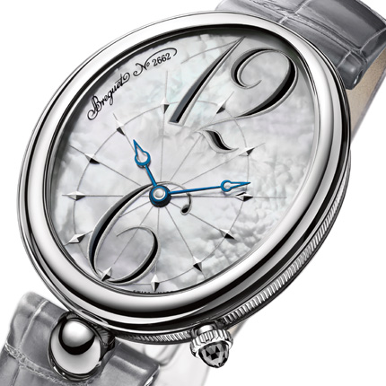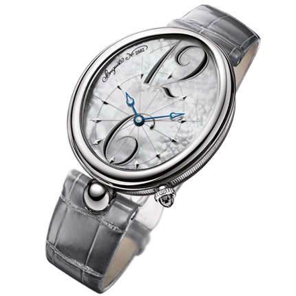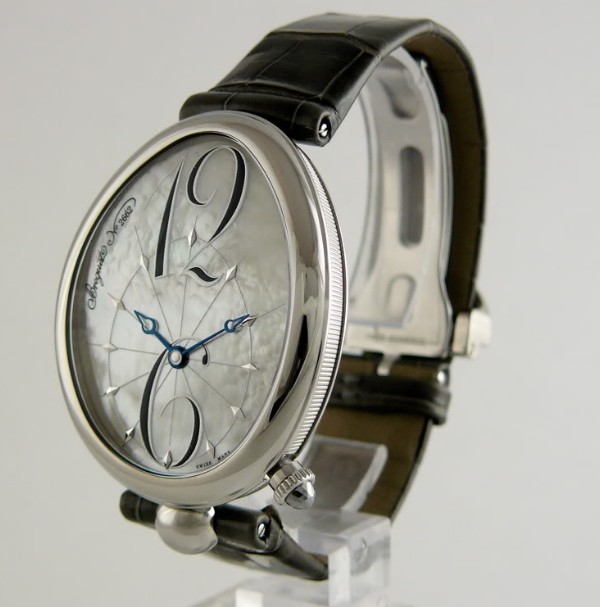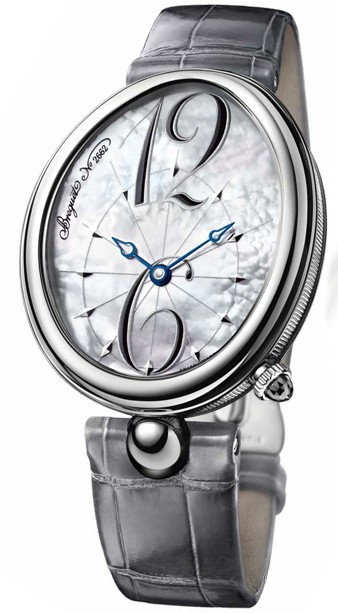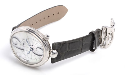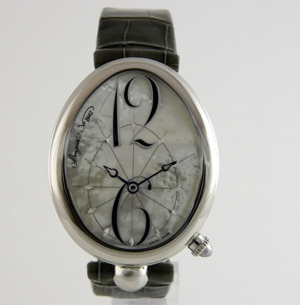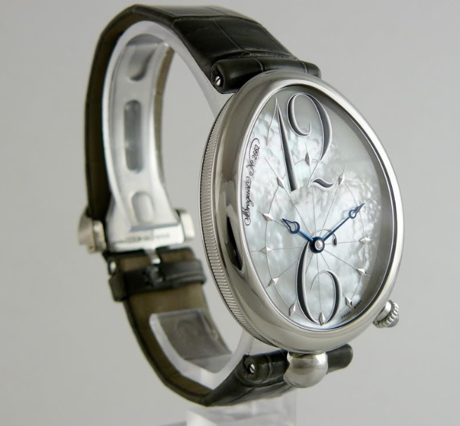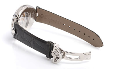Модель женских часов Breguet Reine de Naples 8967ST/58/986 изготовлена из нержавеющей стали. Корпус выполнен из нержавеющей стали размером 43,75 х 35,50 х 9,45 мм. На циферблате из белоснежно-серебристого перламутра «присутствуют» всего две часовые метки в готическом стиле – «12» и «6». Поле циферблата визуально сужено своеобразной розой ветров и находится в смещенном положении от центра. Модель, в основе которой лежит мануфактурный автоматический калибр 591С с кремниевым волоском и спуском, имеет запас хода 38 часов. Частота колебаний баланса 28 800 пк/час, его спираль, анкер и спусковое колесо были выполнены из кремния, а ротор автоподзавода из 22К золота, гильоширован вручную, 25 камней. Водонепроницаемость до 30 метров. Часы дополнены, черным ремешком из кожи аллигатора с раскладывающейся застежкой из нержавеющей стали. Часы представлены в элегантной фирменной коробке с документами.