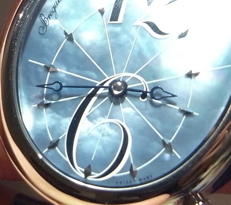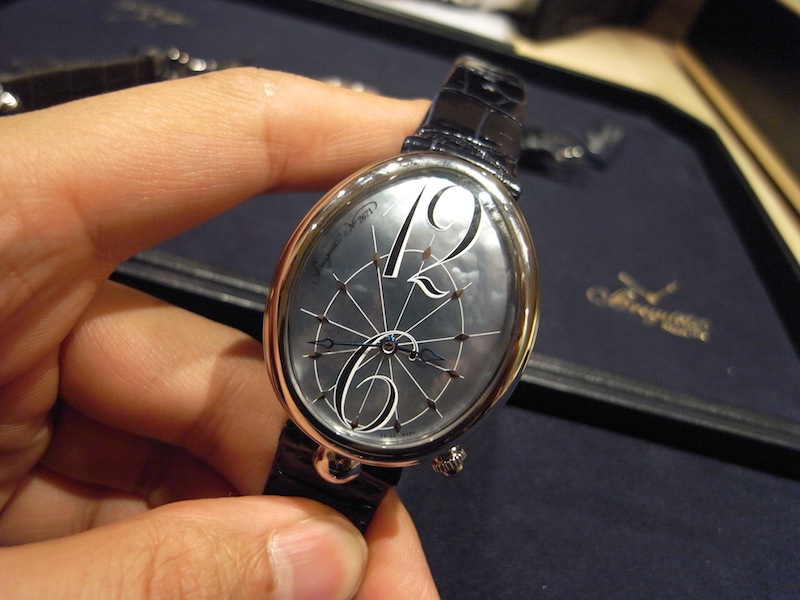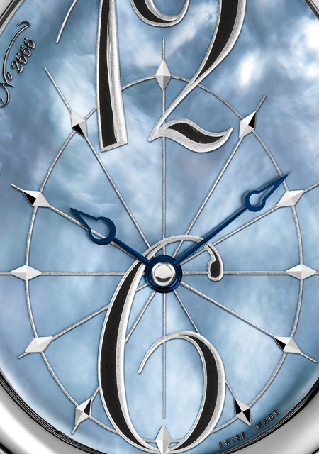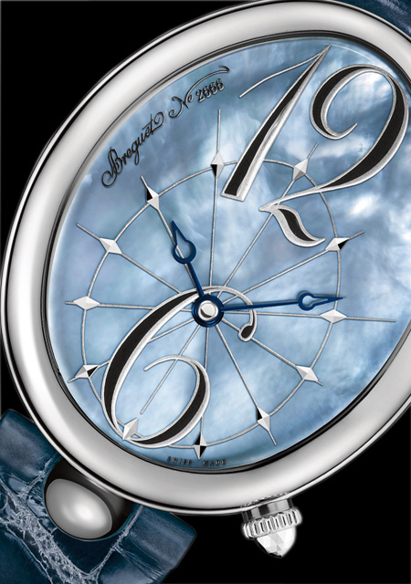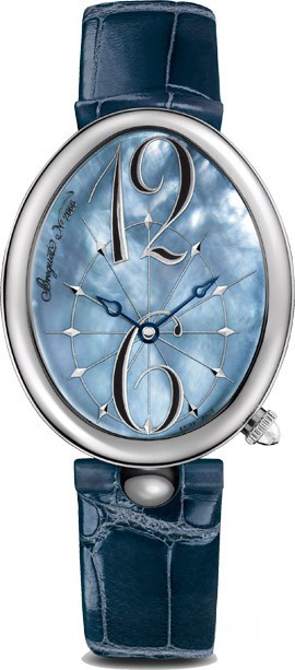 Часы Breguet Reine de Naples 8967ST/V8/986 выпущены в корпусе из нержавеющей стали, размером 43.75 х 35.5 х 9.45 мм и водонепроницаемостью 30. Внутри корпуса установлен автоматический механизм, Калибр 591С с кремниевым волоском и спуском. На синем жемчужном циферблате отображаются часы, минуты. Запас хода 38 часов. Часы комплектуются ремешком из кожи аллигатора с вставкой из нержавеющей стали и раскладывающейся застежкой.