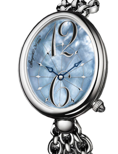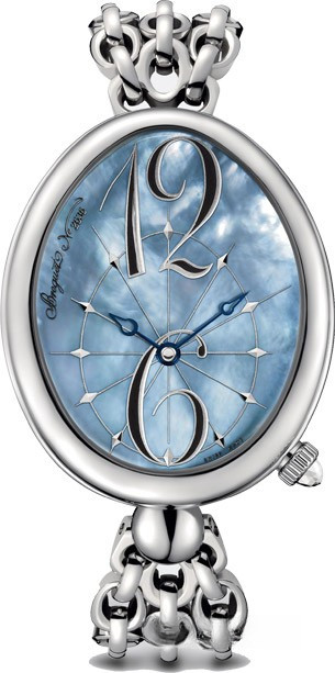 Часы Breguet Reine de Naples 8967ST/V8/J50 выпущены в корпусе из нержавеющей стали, размером 43.75 х 35.5 х 9.45 мм и водонепроницаемостью 30. Внутри корпуса установлен автоматический механизм, Калибр 591QSHD с кремниевым волоском и спуском. На голубом жемчужном циферблате отображаются часы, минуты. Запас хода 38 часов. Часы комплектуются браслетом из нержавеющей стали.
