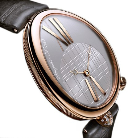 Корпус из 18-каратного розового золота с тонким рифлением на боковых поверхностях. Заводная коронка украшена перевернутым бриллиантом (0,15 карата). Прикрепленный декоративный элемент украшен 16 бриллиантами бриллиантовой огранки (около 0,15 карата). Задняя крышка корпуса выполнена из сапфирового стекла. Диаметр: 43 x 34,95 мм. Водонепроницаемость: до 3 бар (30 метров). Циферблат серебристый, гильошированный. Проставлены индивидуальный номер и подпись «Breguet». Накладные и криволинейные римские цифры из розового золота в положении «на 12 часов» и «на 6 часов». Стрелки «Breguet» с открытым наконечником из розового золота. Механизм с автоматическим подзаводом. Пронумерован, имеет надпись «Breguet». Калибр 591C. 11 ½ линий, 25 камней. Запас хода 38 часов. Прямолинейный швейцарский анкерный спуск из кремния. Кремниевая балансирная пружина. Частота колебаний 4 Гц. Механизм отрегулирован в 6 положениях. Ремешок кожаный, застежка украшена 29 бриллиантами бриллиантовой огранки.