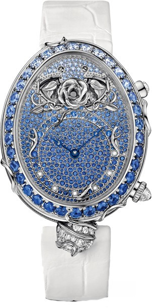 Часы линии Reine de Naples Grande Complication из 18-каратного белого золота, с боем. Безель и «ножки» украшены 29 бриллиантами (около 0,918 карата) и 27 синими сапфирами (около 2,84 карата). Обод циферблата украшен 77 бриллиантами (около 0,16 карата). Указатель запуска механизма боя украшен одним бриллиантом. Гравированный вручную автоматический механизм. Спираль и анкер из кремния. Циферблат украшен 156 бриллиантами (около 0,42 карата) и 303 синими сапфирами (около 0,84 карата). Задняя крышка из сапфирового стекла. Водонепроницаемые до 3 бар (30 м). Размеры: 40,1 х 32 мм.