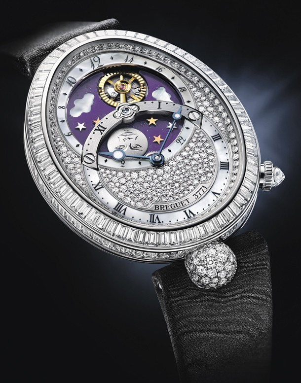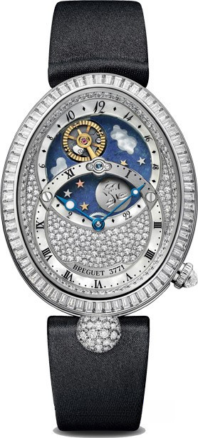 Корпус из 18-каратного белого золота. Безель и боковые поверхности корпуса украшены 131 бриллиантом огранки «багет» (около 5,59 карата). Фланец украшен 73 бриллиантами бриллиантовой огранки (около 0,332 карата). Заводная головка украшена бриллиантом (около 0,26 карата). Декоративный элемент, украшенный 35 бриллиантами бриллиантовой огранки (около 0,464 карата) и произвольной бриллиантовой «матировкой». Задняя крышка корпуса выполнена из сапфирового стекла. Диаметр 42,05 x 34 мм. Циферблат из 18-каратного золота, декорированного паве из 147 бриллиантов бриллиантовой огранки (около 0,4 карата). Усложнение с индикацией дня и ночи в верхней половине, с Солнцем, изображенным при помощи колеса балансира «Breguet», и выгравированной вручную титановой Луной, которые вместе совершают полный оборот за 24 часа. Индикация часов и минут в нижней части. Проставлены индивидуальный номер и подпись «Breguet». Отдельный циферблат с индикацией римскими цифрами; на индикаторе «день-ночь» – арабские цифры Breguet. Стрелки «Breguet» из вороненой стали с открытым наконечником. Механизм с автоматическим подзаводом. Пронумерован, имеет надпись «Breguet». Калибр 78CS. 9 ¾ x 13 ¼ линий, 45 камней. Запас хода 57 часов. Прямолинейный швейцарский анкерный спуск. Кремниевая балансирная пружина. Частота колебаний 3,5 Гц. Механизм отрегулирован в 6 положениях. Атласный ремешок со складной застежкой с тремя язычками, украшенной 26 бриллиантами бриллиантовой огранки.