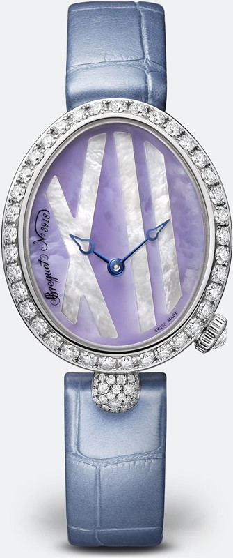 Корпус из 18-каратного белого золота, овальной формы с боковой рифленой поверхностью. Безель и ушки инкрустированы 64-мя белыми бриллиантами (ок. 1.654 карат). Сапфировая задняя крышка. Размеры корпуса 32.7 х 27.3 мм. Водонепроницаемость до 30 м. Циферблат в цвета лаванды жемчужный, часы индивидуально пронумерованы и подписаны Breguet. Часы и минуты отображаются при помощи центральных стрелок из вороненой стали с яблоками Breguet. Часы комплектуются автоматическим механизмом 586/1 с запасом хода 38 часов. Поставляются на ремешке из кожи аллигатора с золотой застежкой.