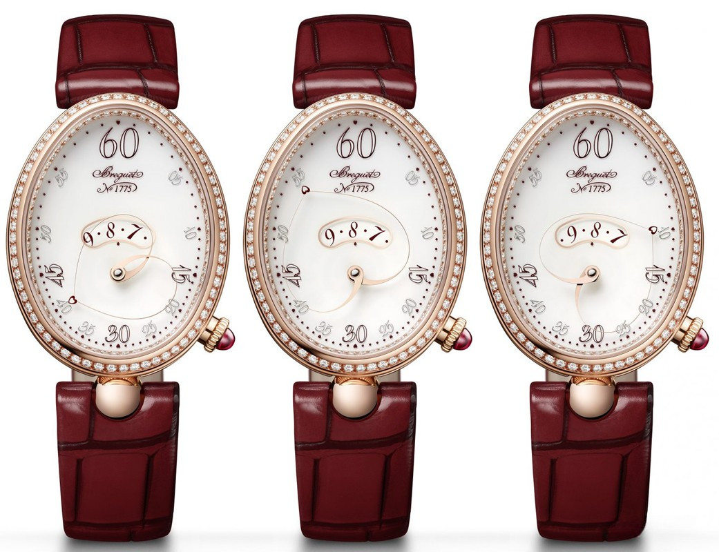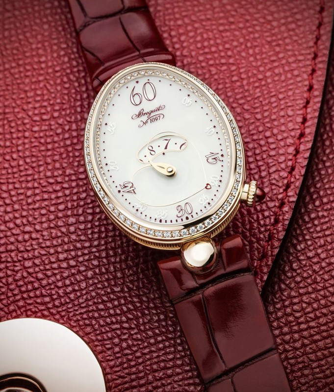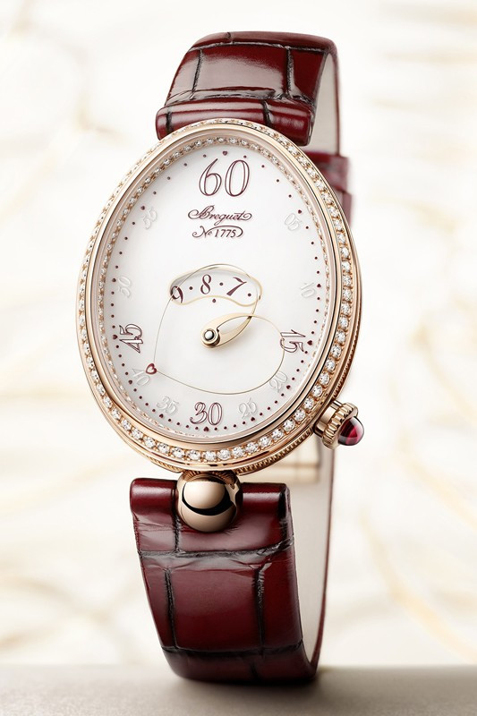 Часы Reine de Naples из розового золота 18 карат. Безель и обод циферблата украшены 128 бриллиантами (около 0,77 карата). Заводная головка с рубином (около 0,25 карата). Автоматический механизм. Спираль, анкер и анкерное колесо из кремния. Белый лакированный циферблат из сапфира с арабскими цифрами Breguet. Индикация часа в окошке, индикация минут с помощью фигурной стрелки в форме сердца. Задняя крышка из сапфирового стекла. Водонепроницаемость до 3 бар (30 м). Размеры: 36,5 х 28,45 мм. Красный ремешок из кожи аллигатора с раскладывающейся застежкой в 3 ряда из розового золота с 28 бриллиантами (около 0,17 карата). Ограниченная серия из 28 пронумерованных экземпляров. Часы предлагаются в футляре-сумочке из телячьей зернистой кожи красного цвета.