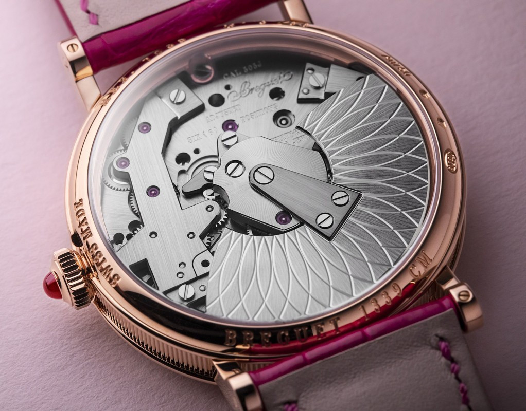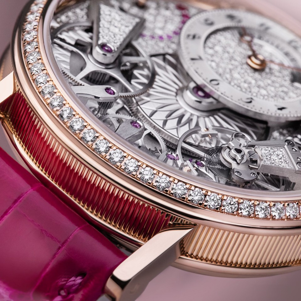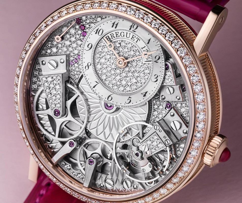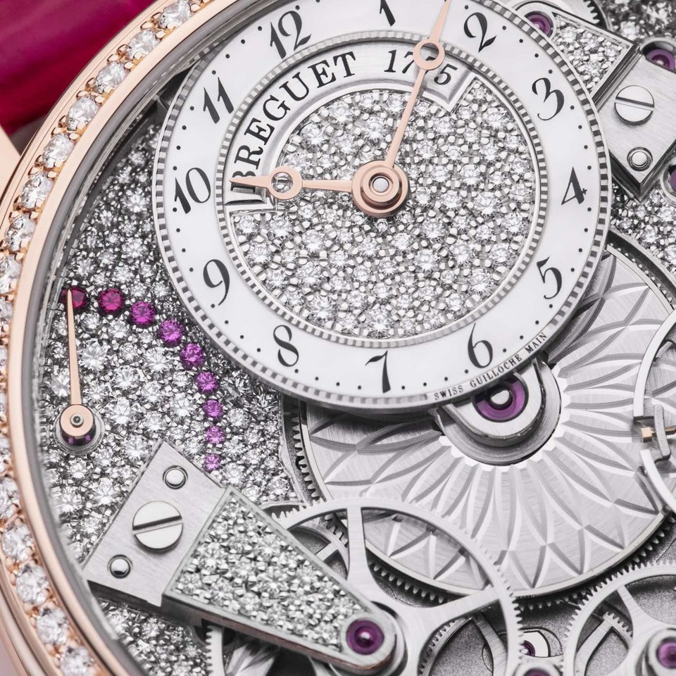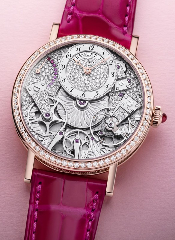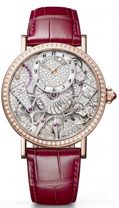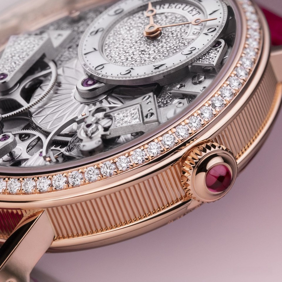 Часы Breguet Tradition 7035 представлены в корпусе из розового золота 18к размером 37 мм водонепроницаемостью 30 метров. Внутри корпуса установлен автоматический механизм, Калибр Breguet 505J, обладающий запасом хода 50 часов. На циферблате с белыми бриллиантами отображаются часы, минуты, запас хода. Часы поставляются на ремешке из кожи аллигатора с вставкой из розового золота 18к. Безель из белых бриллиантов. Серия ограничена - 88 шт.