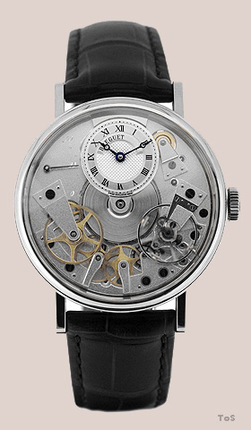 Круглый полированный корпус сделан из 18-каратного белого золота. Боковая сторона корпуса украшена неглубоким рифлением. Линейка Breguet создана в память о мастере Бреге. В диаметре размер корпуса составляет 38 мм. Циферблат сделан из цельной пластины 18-каратного золота. Стрелки отлиты вручную из вороненной стали, и украшены характерными для Breguet "яблоками". Ультратонкий механизм оснащен калибром 505SR, и имеет приблизительный запас хода на 50 часов. Благодаря задней прозрачной крышке, сделанной из сапфирового стекла, можно наблюдать за работой механизма. Водонепроницаемость модели составляет 30 метров. Ремешок сделан из кожи аллигатора и оснащен золотой 18-каратной застежкой.