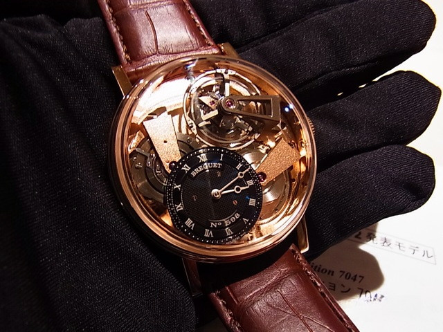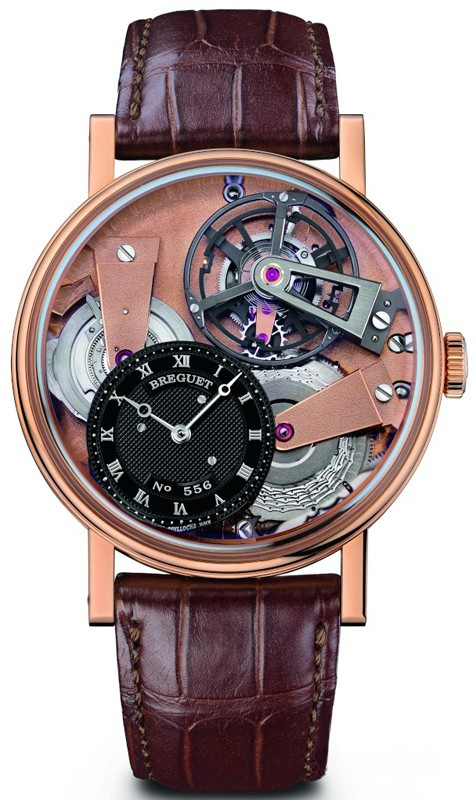 Круглый корпус часво изготовлен из розового золота 18 карат с рифленым узором. Сапфировая задняя крышка установлена на обратной стороне корпуса. Диаметр часов 41 мм. Закругленные кнопки на корпусе, винтовые шпильки для крепления ремешка. Водонепроницаемость до 3 бар (30 м). Циферблат из золота 18к украшен ручной гравировкой в смещенном центре циферблата в позиции «7 часов». Индивидуальный номер и подпись Breguet. Градуировка циферблата выполнена римскими цифрами. Окно турбийона на 60 секунд в позиции «1 час». Стрелки Бреге со смещенными наконечниками выполнены из белого золота. Часовой механизм с ручным подзаводом из антрацитового сплава металлов платиновой группы и регулятором турбийон. Индивидуальный номер и подпись Breguet. Cal. 569. 16 линий, 43 камня. Запас хода механизма составляет 50 часов, при этом индикатор запаса хода расположен на заводном барабане. Точность поворотного механизма в ходе работы часов обеспечивается особенной цепной передачей (fusee-and-chain transmission). Верхняя дуга каретки турбийона выполнена из титана. Тонкая полоска с надписью Breguet из немагнитной нержавеющей стали. Швейцарский анкерный ход расположен по прямой линии. Титановое балансирное колесо Breguet оснащено четырьмя золотыми регулировочными винтами, а балансирная пружина выполнена из кремния. Частота 2,5 Гц. Регулировка в 6 позициях.