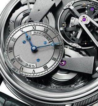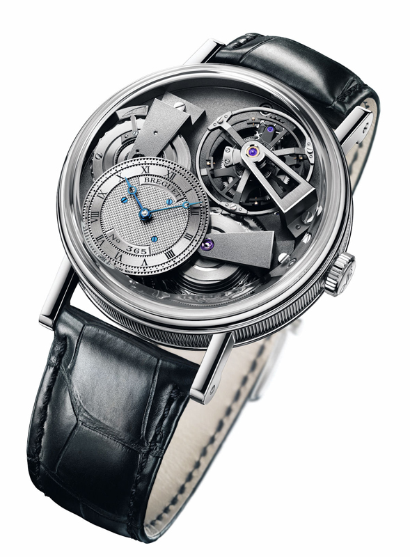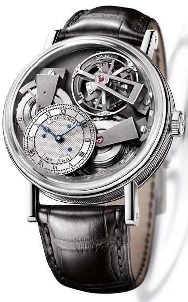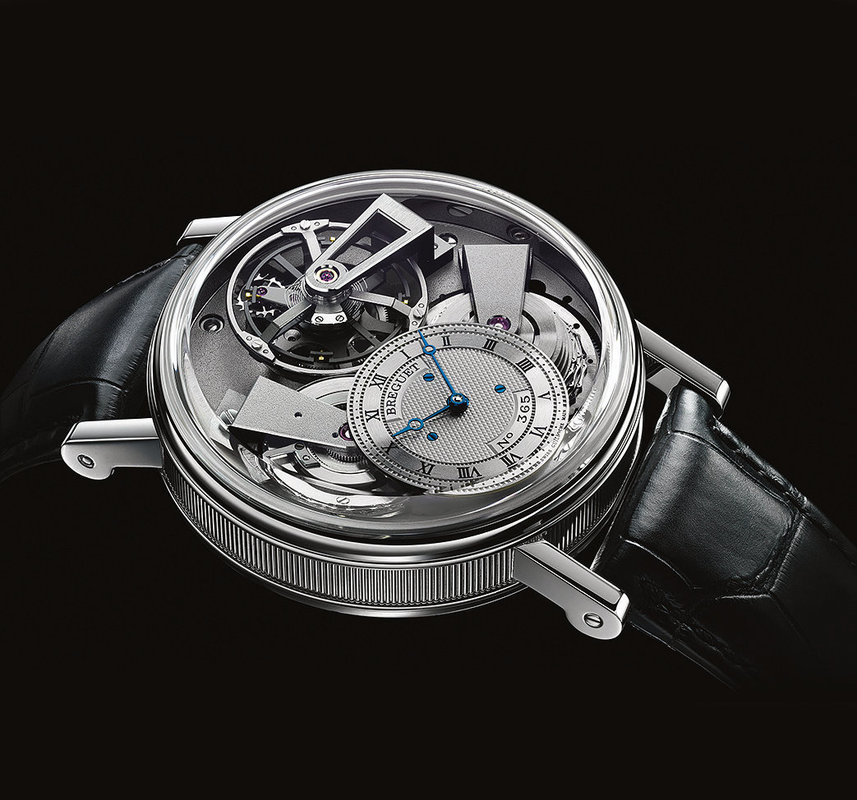 Круглый корпус часво изготовлен из платины 950 с рифленым узором. Сапфировая задняя крышка установлена на обратной стороне корпуса. Диаметр часов 41 мм. Закругленные кнопки на корпусе, винтовые шпильки для крепления ремешка. Водонепроницаемость до 3 бар (30 м). Циферблат из золота 18к украшен ручной гравировкой в смещенном центре циферблата в позиции «7 часов». Индивидуальный номер и подпись Breguet. Градуировка циферблата выполнена римскими цифрами. Окно турбийона на 60 секунд в позиции «1 час». Стрелки Бреге со смещенными наконечниками выполнены из вороненой стали. Часовой механизм с ручным подзаводом из антрацитового сплава металлов платиновой группы и регулятором турбийон. Индивидуальный номер и подпись Breguet. Cal. 569. 16 линий, 43 камня. Запас хода механизма составляет 50 часов, при этом индикатор запаса хода расположен на заводном барабане. Точность поворотного механизма в ходе работы часов обеспечивается особенной цепной передачей (fusee-and-chain transmission). Верхняя дуга каретки турбийона выполнена из титана. Тонкая полоска с надписью Breguet из немагнитной нержавеющей стали. Швейцарский анкерный ход расположен по прямой линии. Титановое балансирное колесо Breguet оснащено четырьмя золотыми регулировочными винтами, а балансирная пружина выполнена из кремния. Частота 2,5 Гц. Регулировка в 6 позициях.