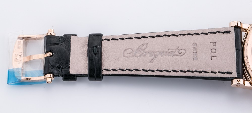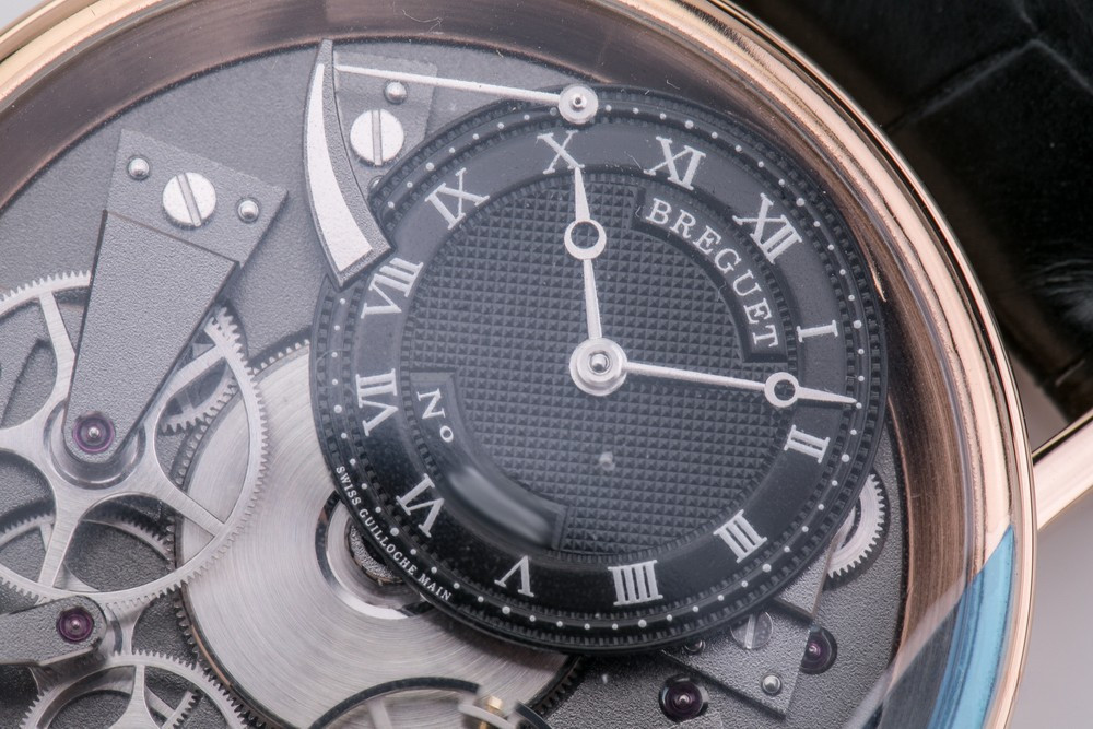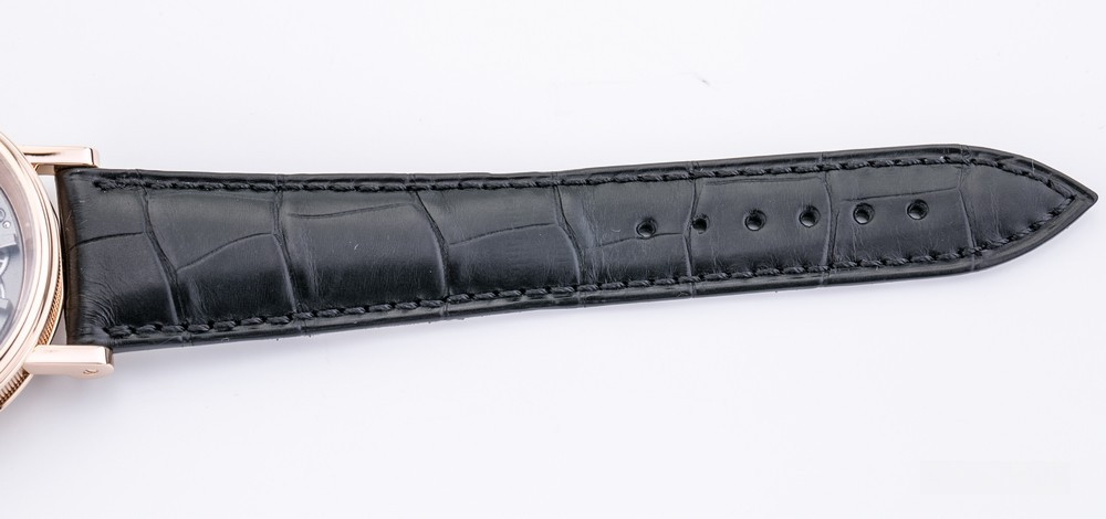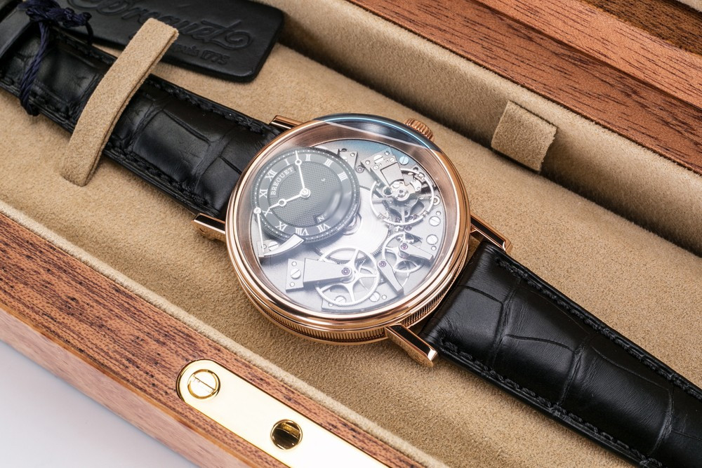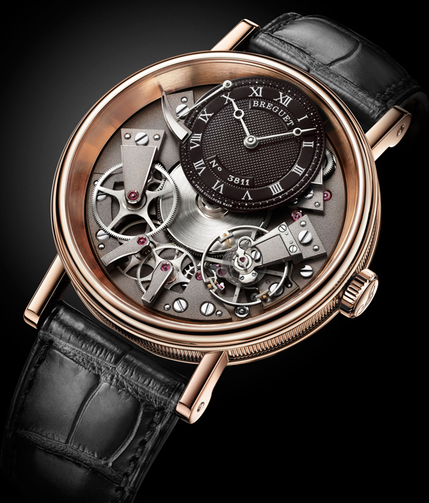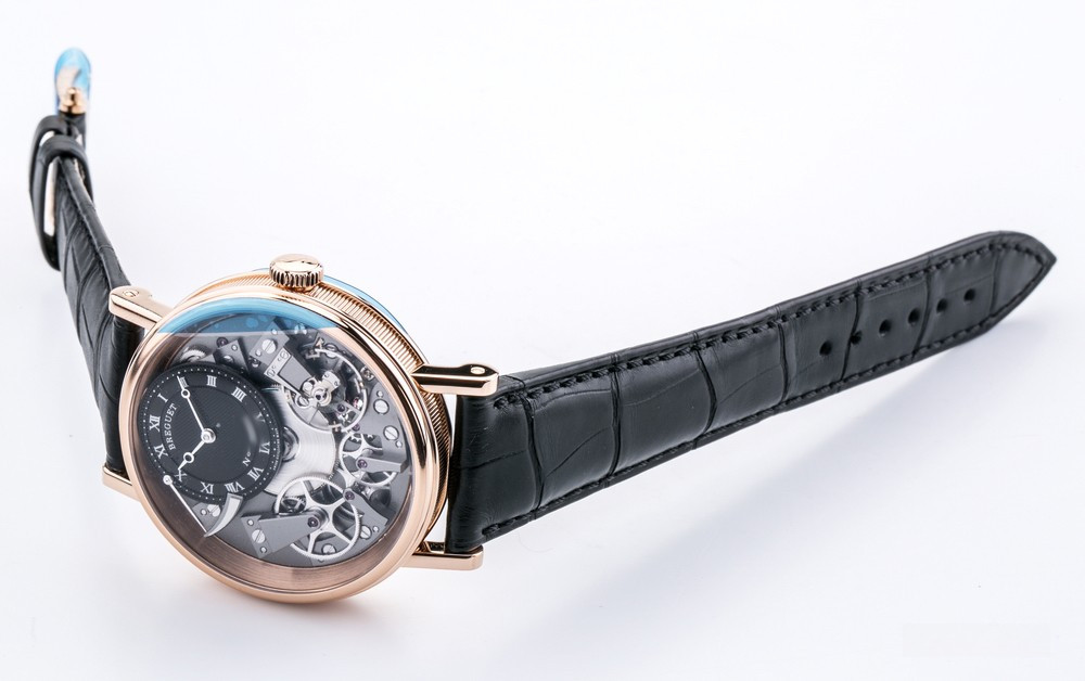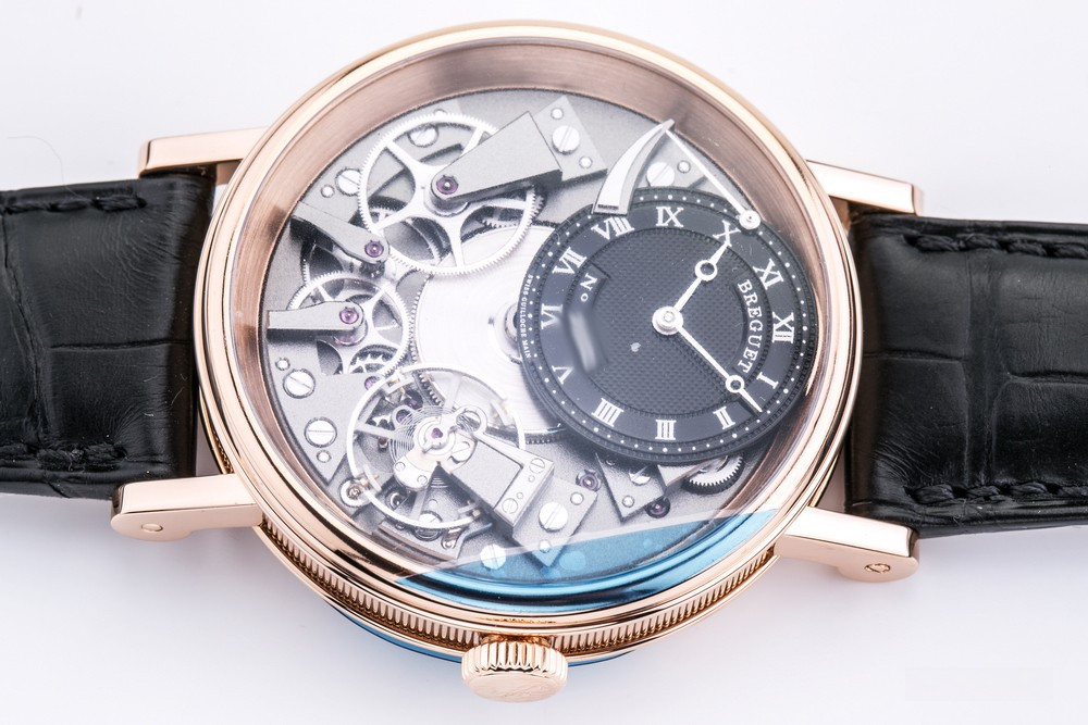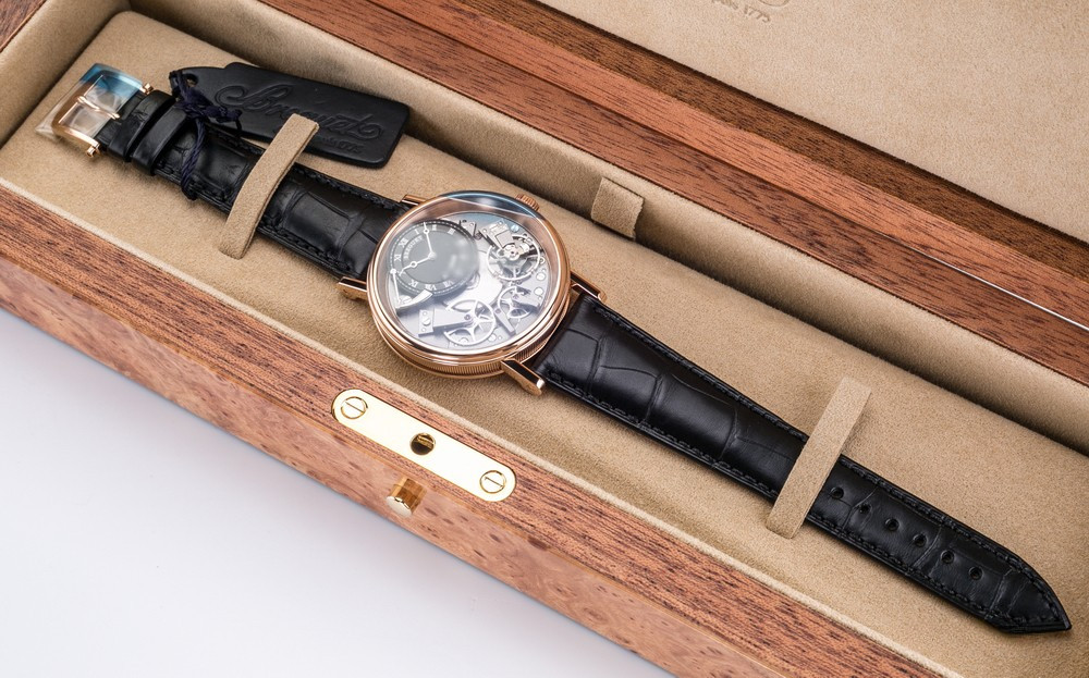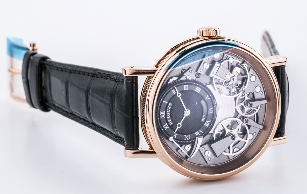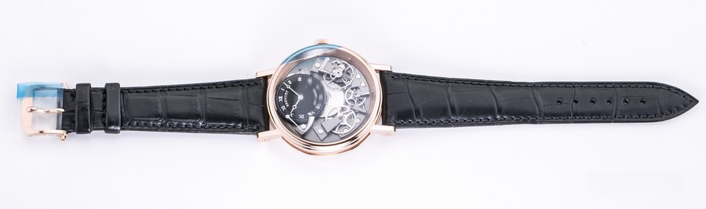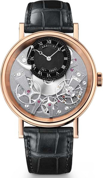 Breguet La Tradition - это сочетание многолетних традиций и нового дизайна. Союз классического циферблата и матового открытого механизма делают часы Tradition уникальными и не похожим на другие произведения часового искусства. Корпус часов сделан из розового золота 18 карат, черный циферблат гильоширован вручную. На передней и задней части часов установлено сапфировое стекло. Защита от воды стандартная для классических часов и составляет 30 метров. Внутри корпуса размером 40 x 11.65 мм заключен механизм с ручным заводом 507DR и запасом хода 50 часов. Часы комплектуются черым ремешком из кожи аллигатора с застежкой из розового золота 18к.