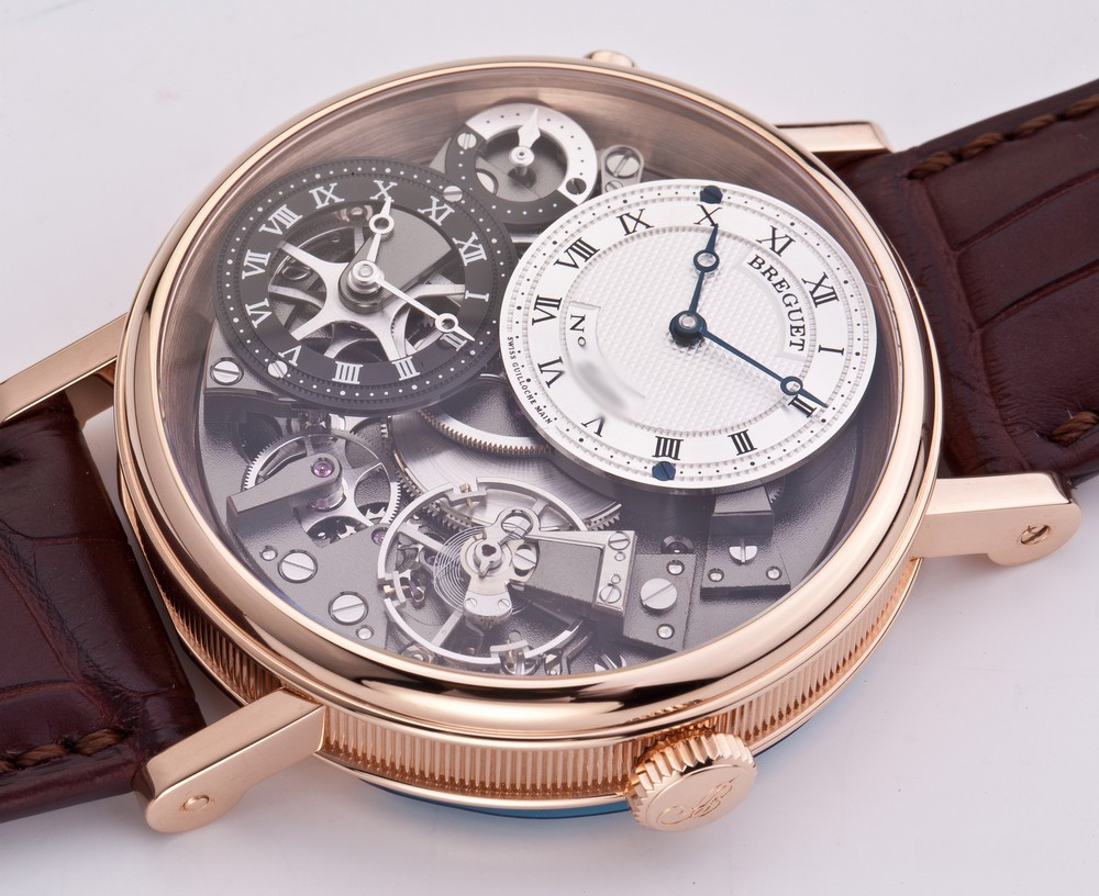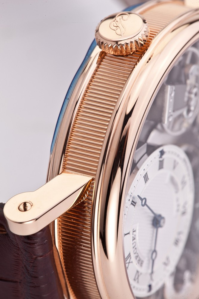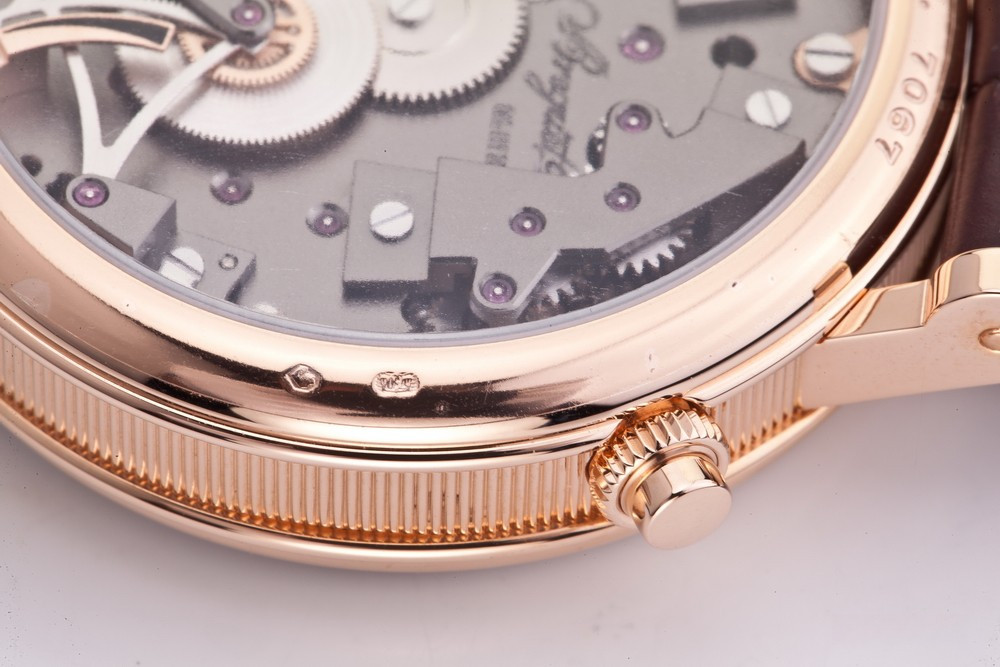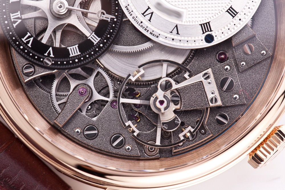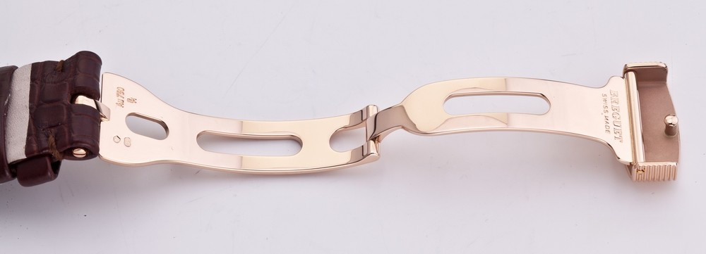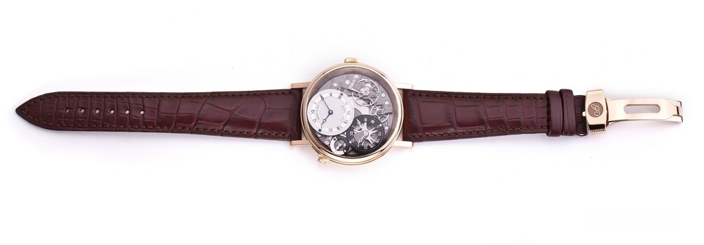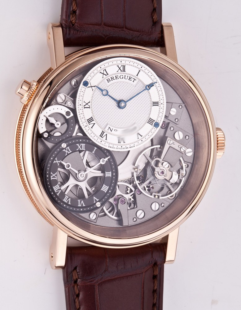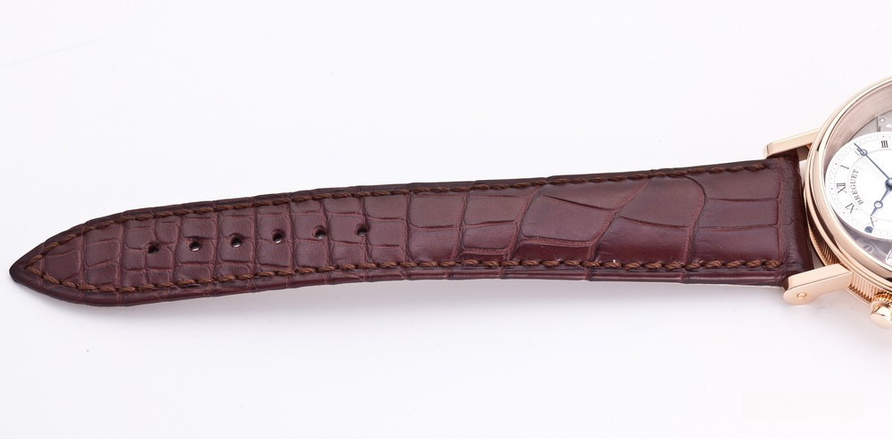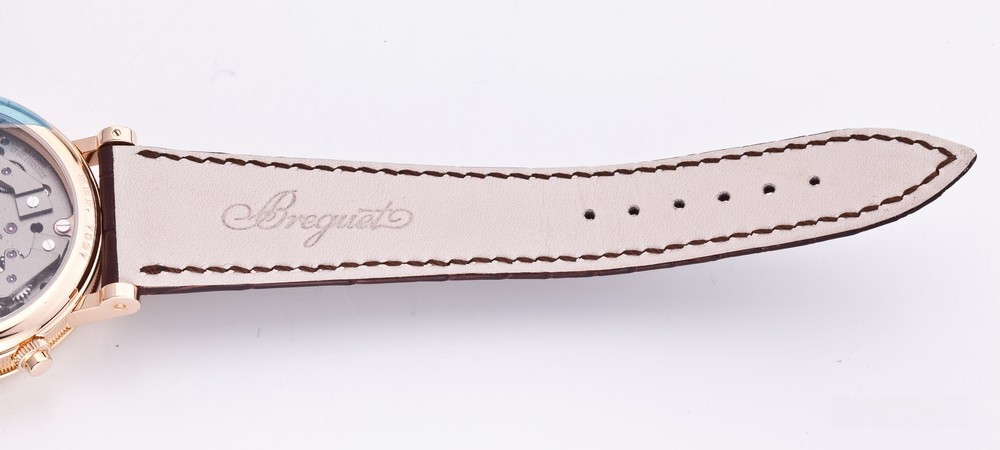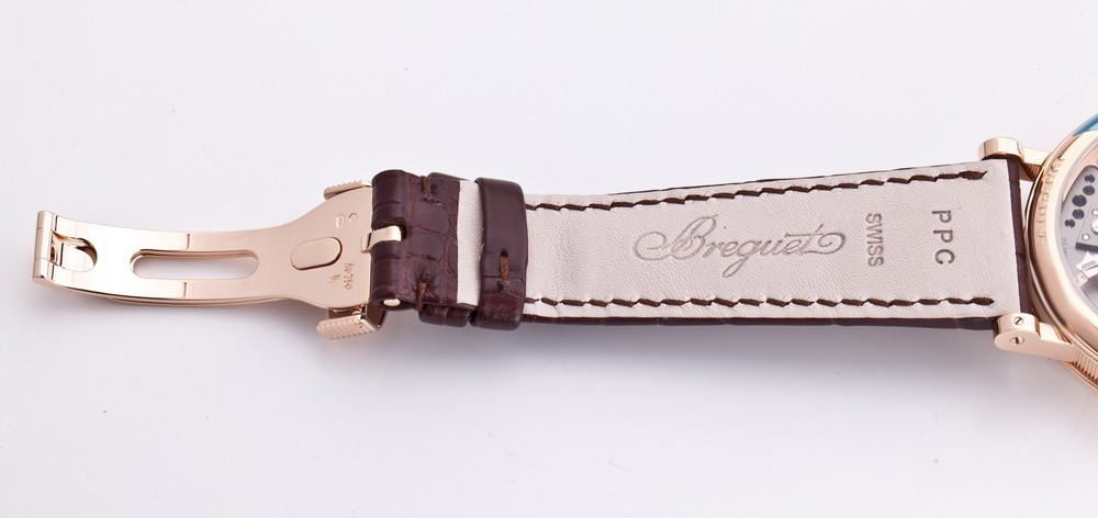 Модель мужских часов Breguet Tradition Time-Zone 7067BR/G1/9W6 представлена в корпусе из 18-каратного розового золота с размером 40 х 12,6 5мм. Циферблат выполнен из 18-каратного золота с гильошированным вручную узором. Смещенный в положение "12 часов" посеребренный циферблат второго часового пояса. В положении "8 часов" размещен циферблат основного часового пояса. Указатель дня и ночи основного часового пояса расположен в положении "10 часов". Баланс находится на отметке "4 часа". Серебристый гильошированный циферблат со стрелками из полированной стали и фирменным наконечником в форме яблока. Сапфировое стекло установлено с обеих сторон корпуса. Механизм с ручным заводом имеет индивидуальный номер. Калибр 507 DRF с покрытием антрацитово-серого цвета и частотой 28800 пол/час собран на 40 драгоценных камнях. На задней стороне корпуса расположен указатель 50-часового запаса хода. Водонепроницаемость корпуса до 30 метров. Часы дополнены коричневым ремешком из кожи аллигатора с золотой раскладывающейся застежкой. Часы представлены в элегантной фирменной коробке с документами.