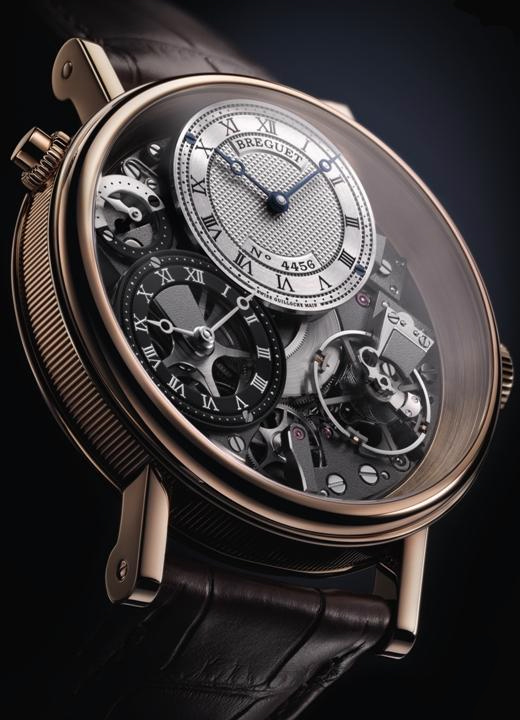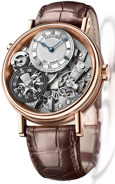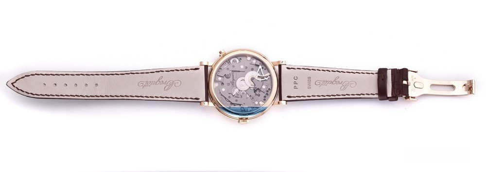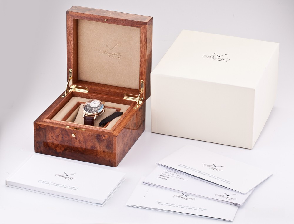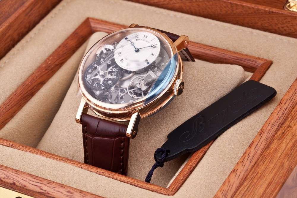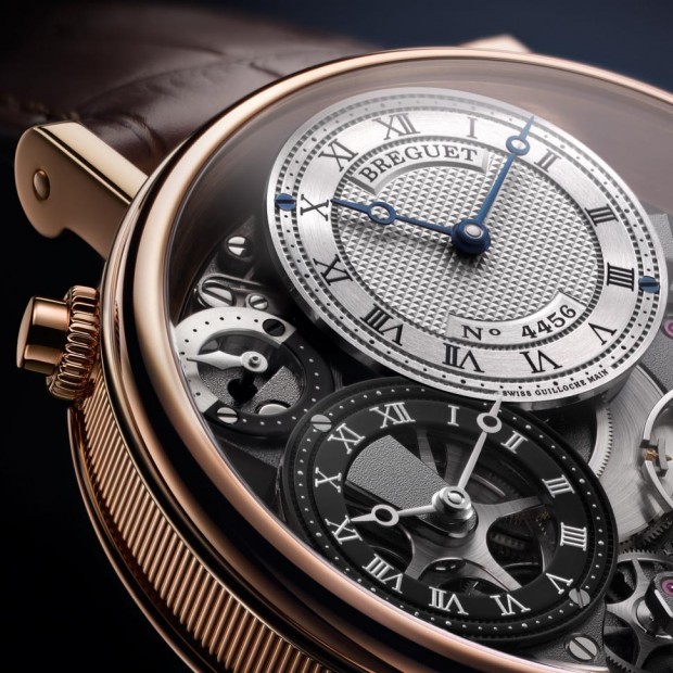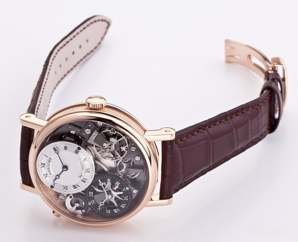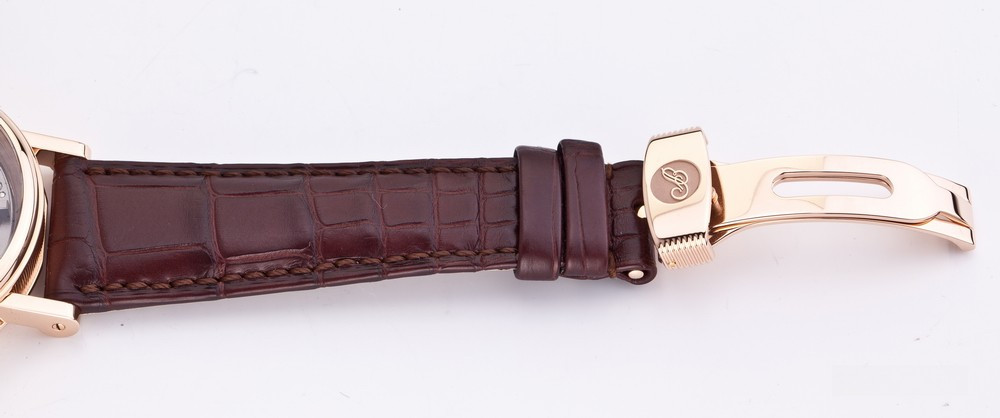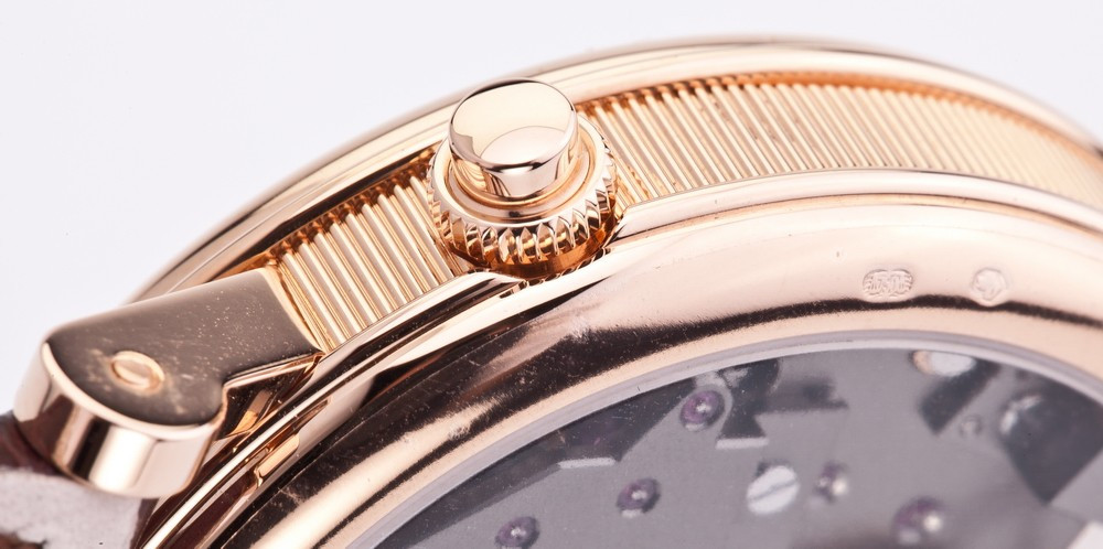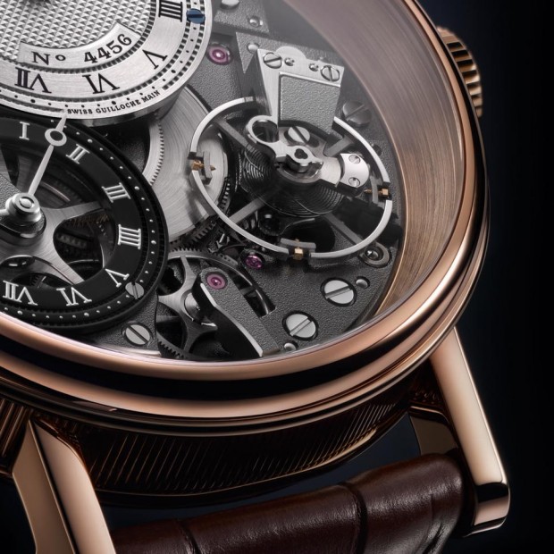 Модель мужских часов Breguet Tradition Time-Zone 7067BR/G1/9W6 представлена в корпусе из 18-каратного розового золота с размером 40 х 12,6 5мм. Циферблат выполнен из 18-каратного золота с гильошированным вручную узором. Смещенный в положение "12 часов" посеребренный циферблат второго часового пояса. В положении "8 часов" размещен циферблат основного часового пояса. Указатель дня и ночи основного часового пояса расположен в положении "10 часов". Баланс находится на отметке "4 часа". Серебристый гильошированный циферблат со стрелками из полированной стали и фирменным наконечником в форме яблока. Сапфировое стекло установлено с обеих сторон корпуса. Механизм с ручным заводом имеет индивидуальный номер. Калибр 507 DRF с покрытием антрацитово-серого цвета и частотой 28800 пол/час собран на 40 драгоценных камнях. На задней стороне корпуса расположен указатель 50-часового запаса хода. Водонепроницаемость корпуса до 30 метров. Часы дополнены коричневым ремешком из кожи аллигатора с золотой раскладывающейся застежкой. Часы представлены в элегантной фирменной коробке с документами.
