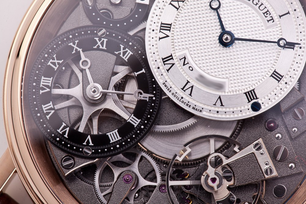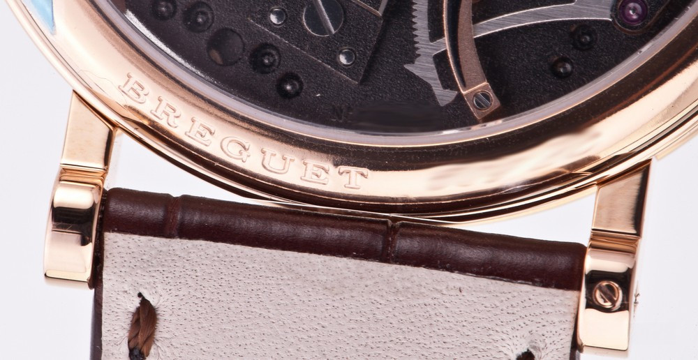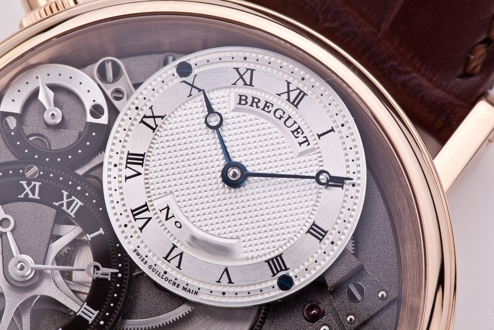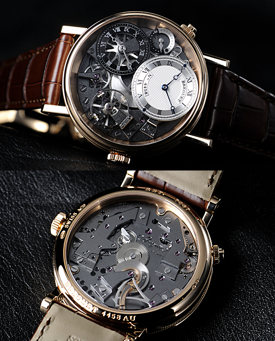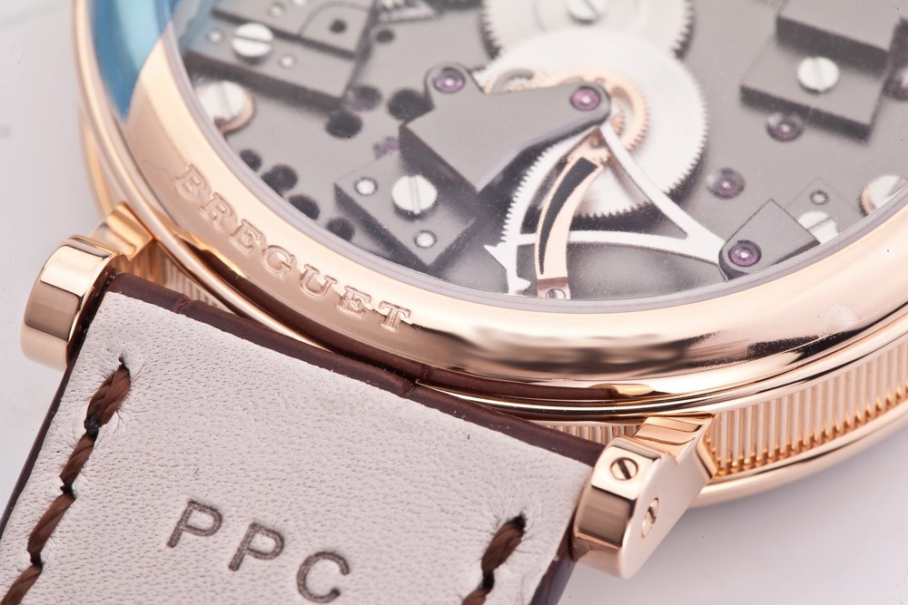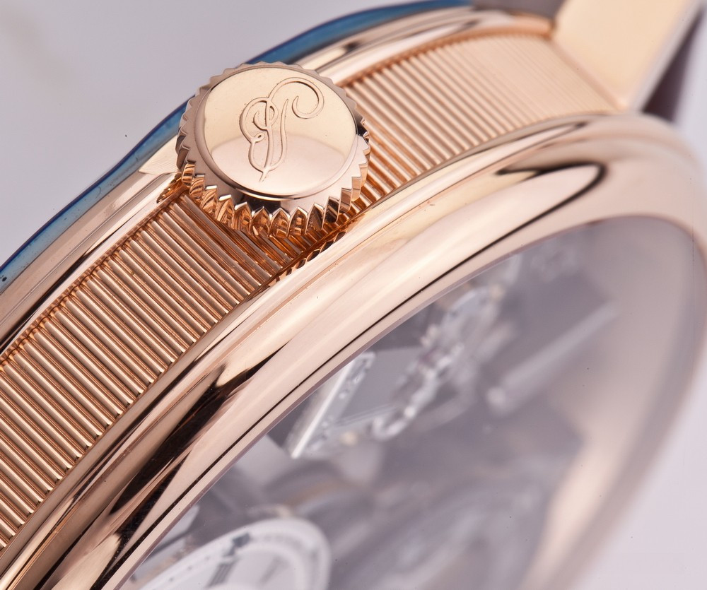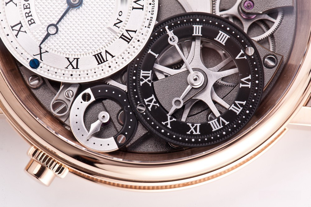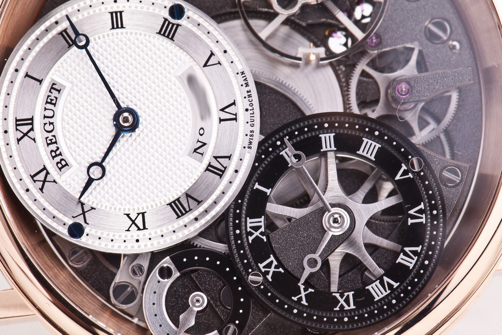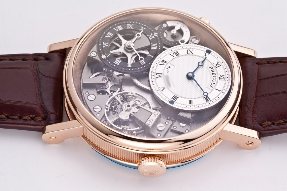 Модель мужских часов Breguet Tradition Time-Zone 7067BR/G1/9W6 представлена в корпусе из 18-каратного розового золота с размером 40 х 12,6 5мм. Циферблат выполнен из 18-каратного золота с гильошированным вручную узором. Смещенный в положение "12 часов" посеребренный циферблат второго часового пояса. В положении "8 часов" размещен циферблат основного часового пояса. Указатель дня и ночи основного часового пояса расположен в положении "10 часов". Баланс находится на отметке "4 часа". Серебристый гильошированный циферблат со стрелками из полированной стали и фирменным наконечником в форме яблока. Сапфировое стекло установлено с обеих сторон корпуса. Механизм с ручным заводом имеет индивидуальный номер. Калибр 507 DRF с покрытием антрацитово-серого цвета и частотой 28800 пол/час собран на 40 драгоценных камнях. На задней стороне корпуса расположен указатель 50-часового запаса хода. Водонепроницаемость корпуса до 30 метров. Часы дополнены коричневым ремешком из кожи аллигатора с золотой раскладывающейся застежкой. Часы представлены в элегантной фирменной коробке с документами.