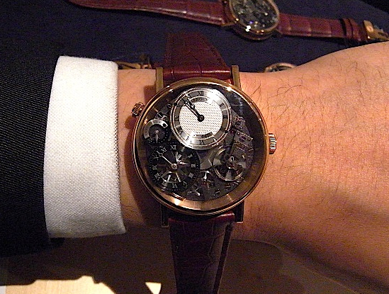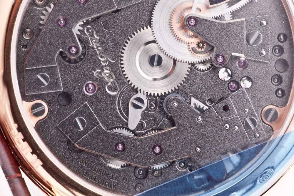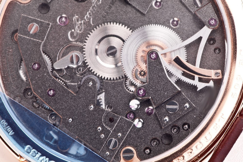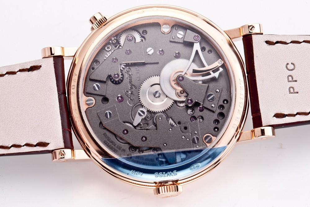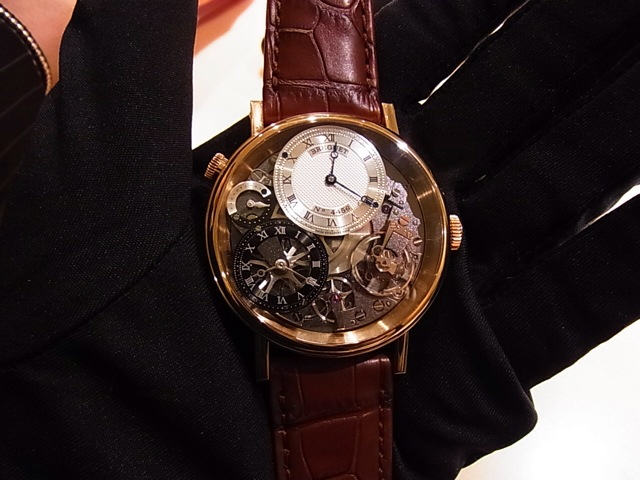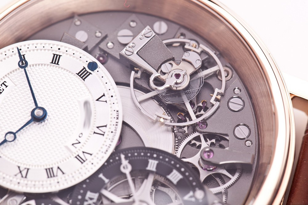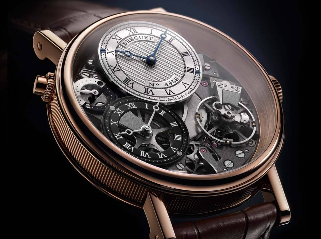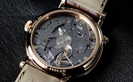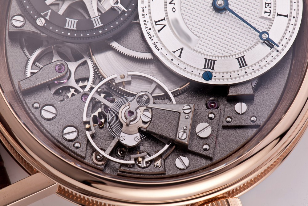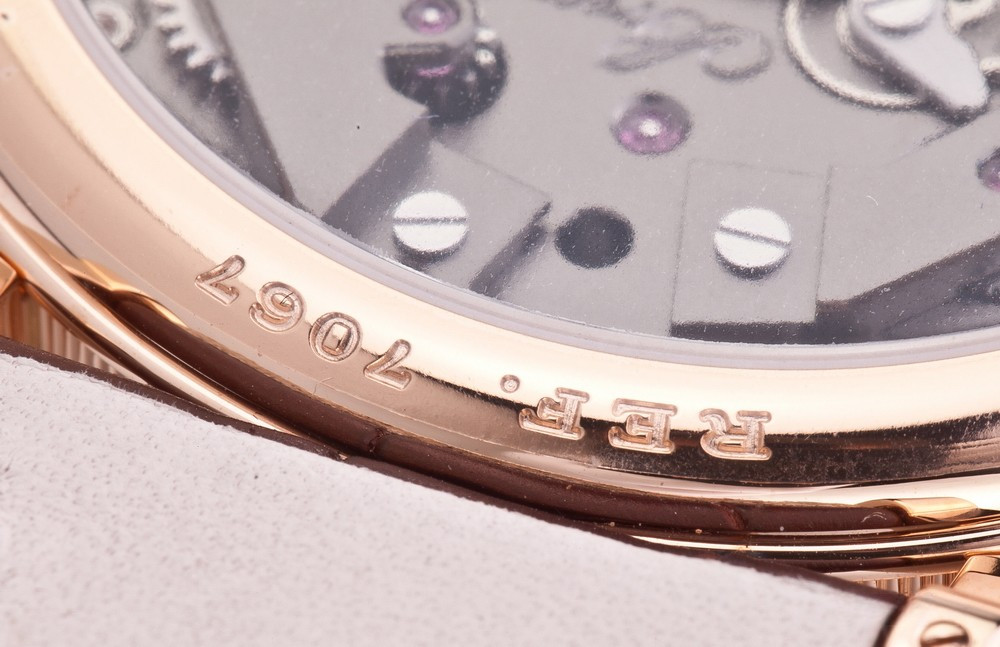 Модель мужских часов Breguet Tradition Time-Zone 7067BR/G1/9W6 представлена в корпусе из 18-каратного розового золота с размером 40 х 12,6 5мм. Циферблат выполнен из 18-каратного золота с гильошированным вручную узором. Смещенный в положение "12 часов" посеребренный циферблат второго часового пояса. В положении "8 часов" размещен циферблат основного часового пояса. Указатель дня и ночи основного часового пояса расположен в положении "10 часов". Баланс находится на отметке "4 часа". Серебристый гильошированный циферблат со стрелками из полированной стали и фирменным наконечником в форме яблока. Сапфировое стекло установлено с обеих сторон корпуса. Механизм с ручным заводом имеет индивидуальный номер. Калибр 507 DRF с покрытием антрацитово-серого цвета и частотой 28800 пол/час собран на 40 драгоценных камнях. На задней стороне корпуса расположен указатель 50-часового запаса хода. Водонепроницаемость корпуса до 30 метров. Часы дополнены коричневым ремешком из кожи аллигатора с золотой раскладывающейся застежкой. Часы представлены в элегантной фирменной коробке с документами.