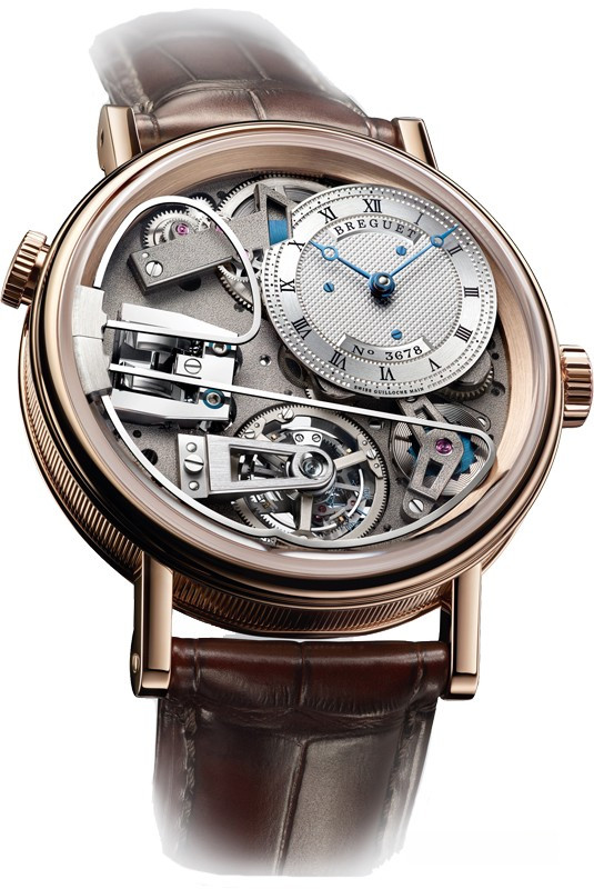 Корпус часов Tradition 7087 изготовлен из розового золота 18к. Сапфировое стекло с антибликовым покрытием установлено с обеих сторон корпуса. Размер часов 44 х 13.6 мм, водонепроницаемость до 30 метров. Часы и минуты отображаются на серебристом гильошированном циферблате, расположенном на отметке 1:30. Синие вороненые стрелки с яблоками Бреге указывают на римские цифры. Внутри корпуса деликатно установлен автоматический механизм с репетиром и 60-секундным турбийоном на 6-ти часах. Главная платина и мосты изготовлены из титана. Мануфактурный Калибр 565DR стоит на 60 камнях и обладает запасом хода 80 часов. Индикатор запаса хода находится на 12-ти часах. Двунаправленный платиновый ротор расположен на периферии механизма. Мост турбийона изготовлен из титана. Рычаг спуска укомплектован кремниевыми паллетами. Балансовое колесо и пружина Breguet изготовлены из кремния. Балансовая частота составляет 4 Гц. Часы комплектуются коричневым ремешком из кожи аллигатора с застежкой из розового золота 18к.