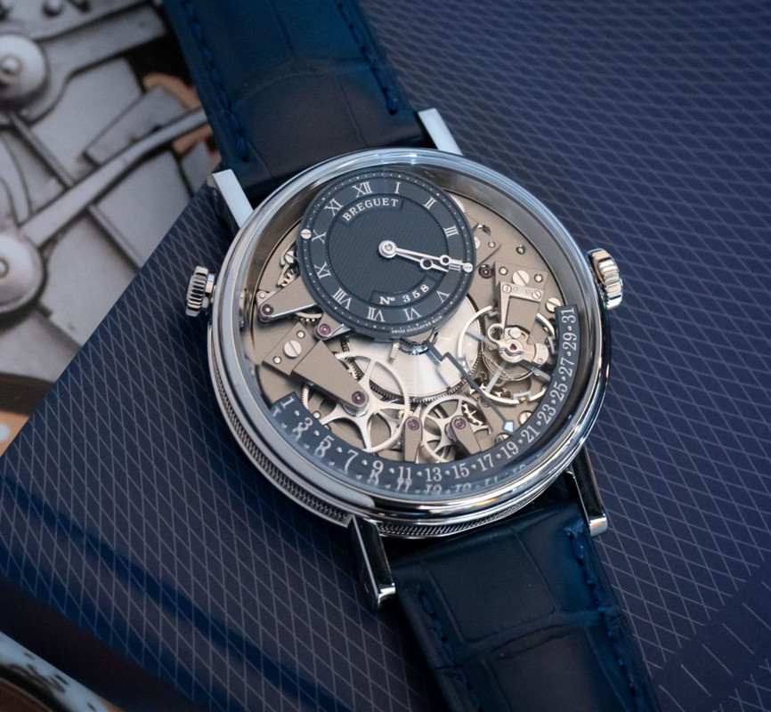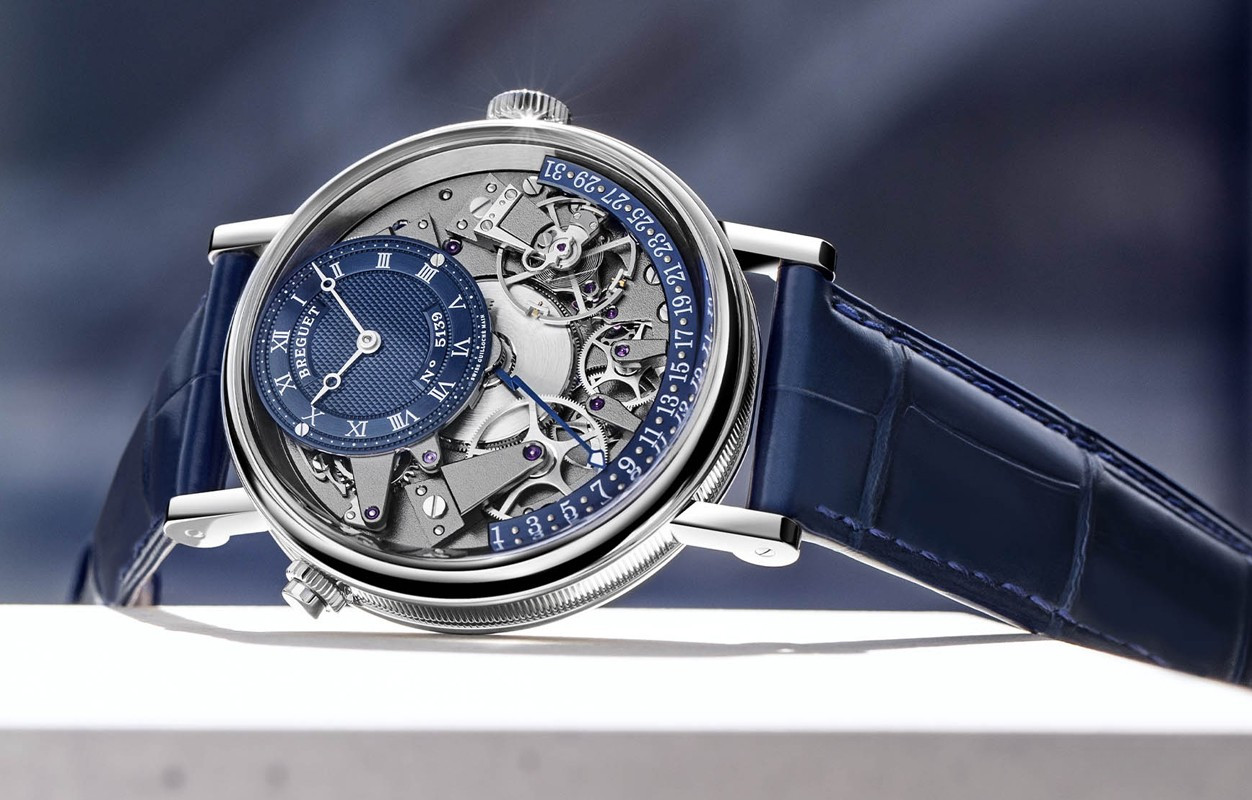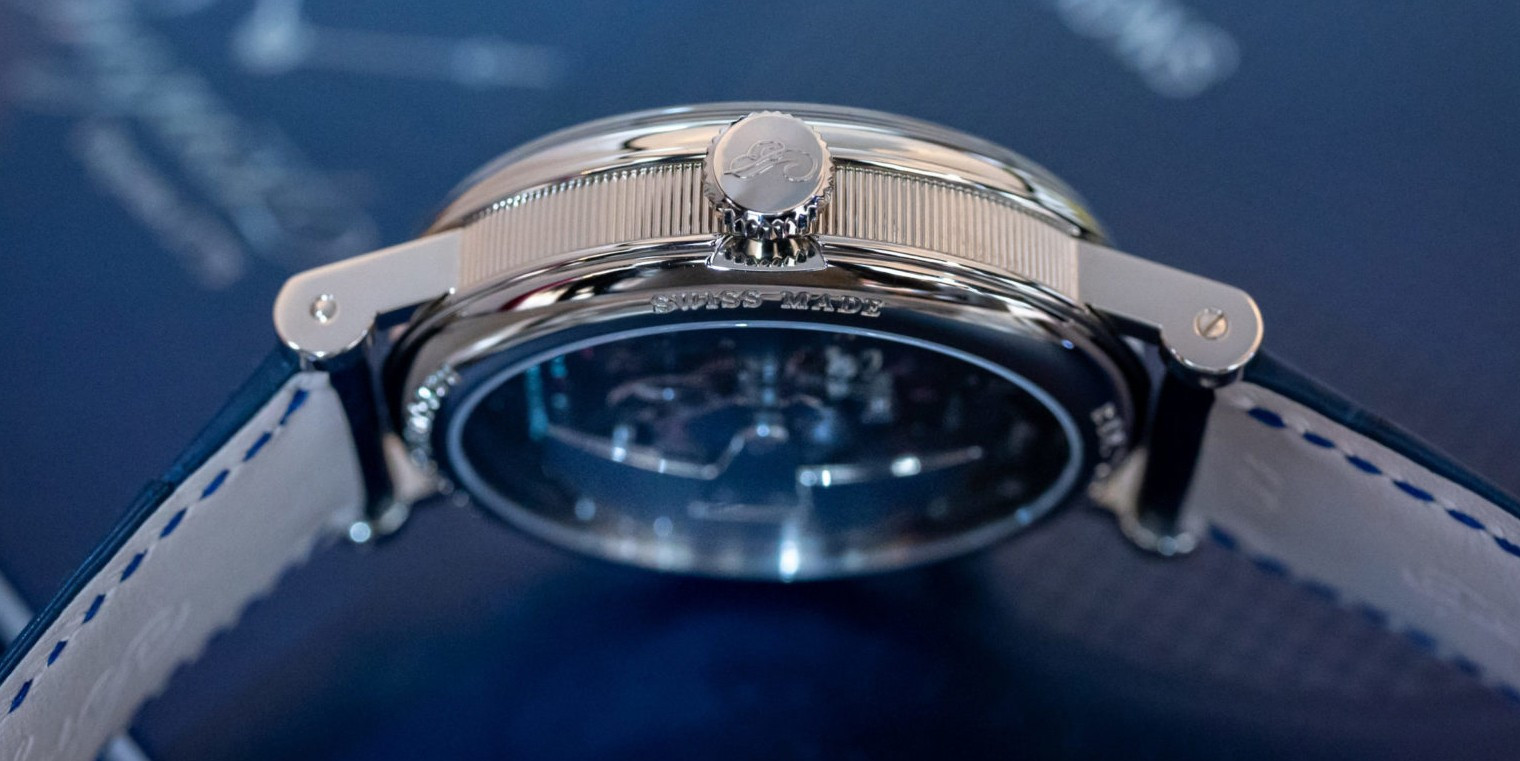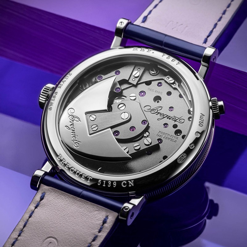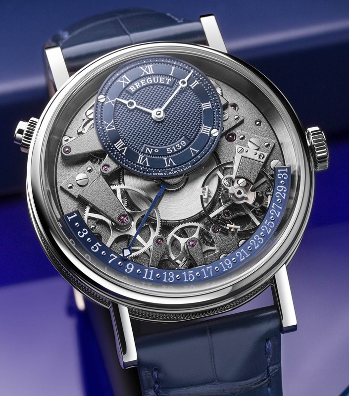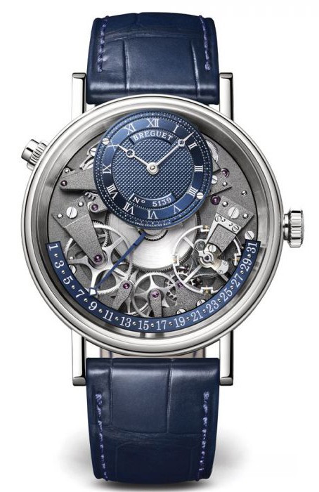 Часы Breguet Tradition 7597 Quantieme Retrograde представлены в корпусе из белого золота 18к размером 40 х 12.1 мм воднепроницаемостью 30 метров. Внутри корпуса установлен автоматический механизм, Калибр 505Q, обладающий запасом хода 50 часов. На серебристом гильошированном циферблате отображаются часы и минуты, в нижней части циферблата находится ретроградная шкала даты. Часы поставляются на ремешке из кожи аллигатора с золотой застежкой.