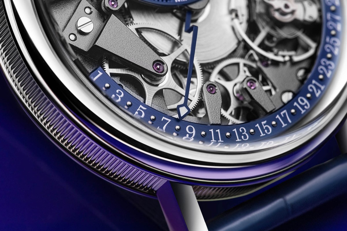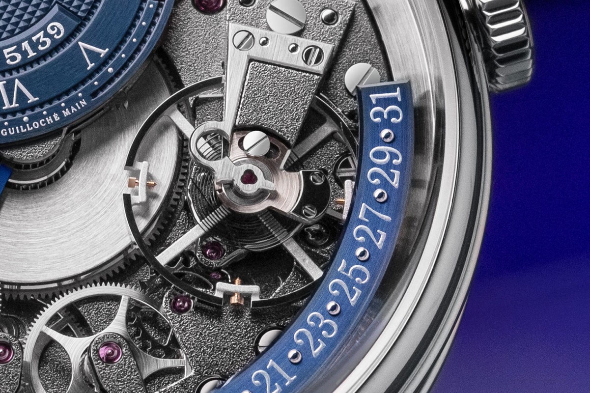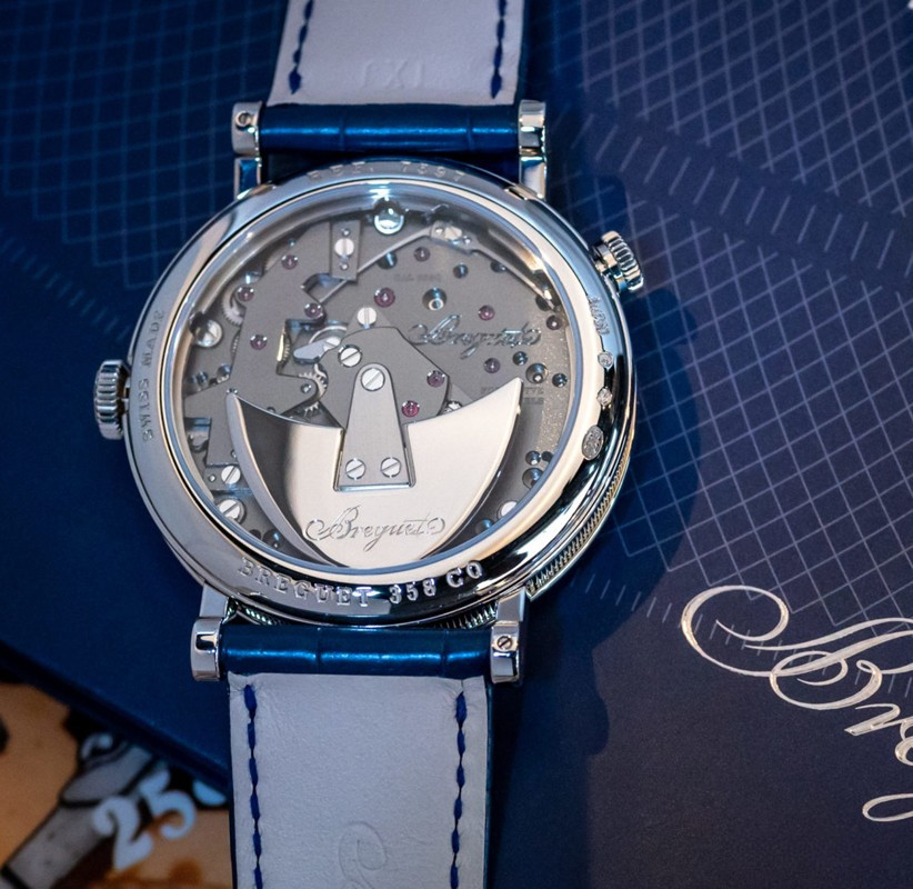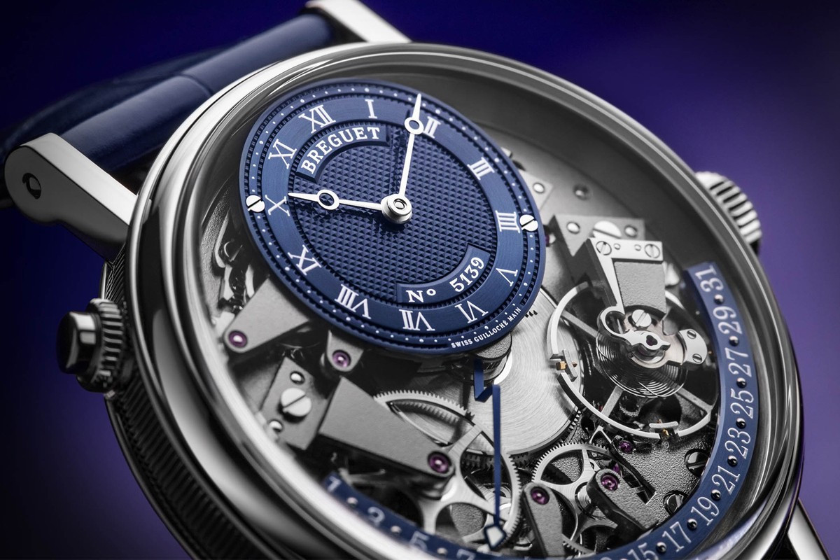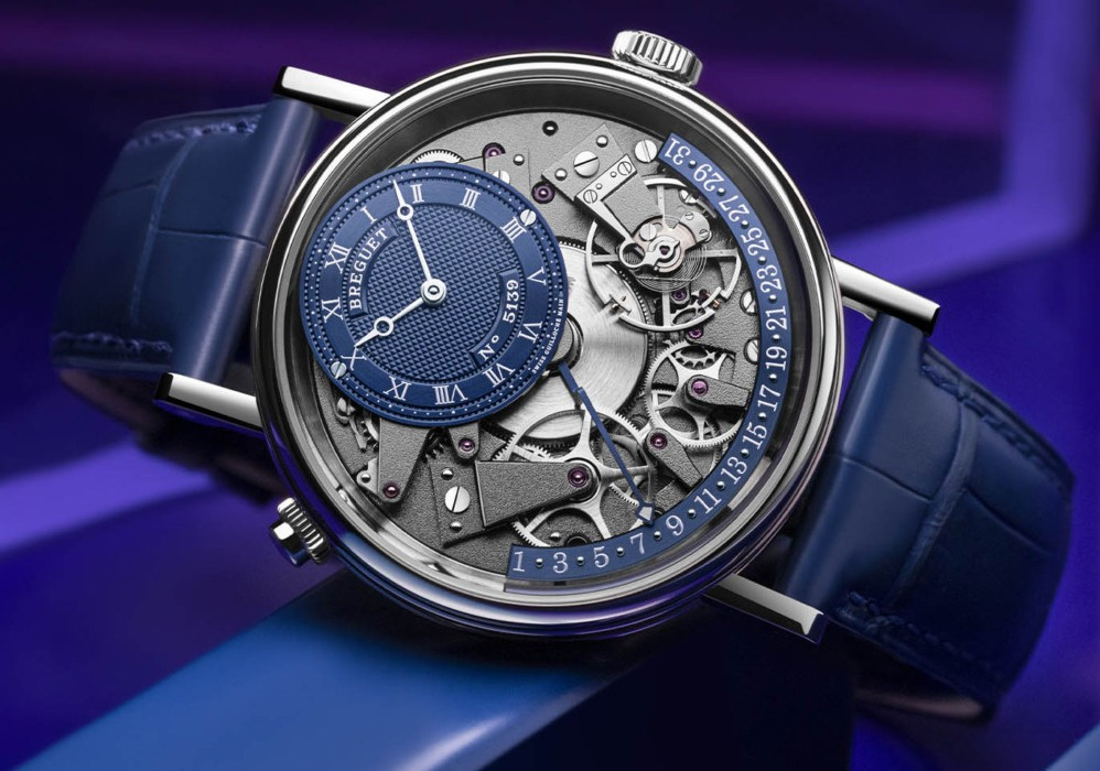 Часы Breguet Tradition 7597 Quantieme Retrograde представлены в корпусе из белого золота 18к размером 40 х 12.1 мм воднепроницаемостью 30 метров. Внутри корпуса установлен автоматический механизм, Калибр 505Q, обладающий запасом хода 50 часов. На серебристом гильошированном циферблате отображаются часы и минуты, в нижней части циферблата находится ретроградная шкала даты. Часы поставляются на ремешке из кожи аллигатора с золотой застежкой.