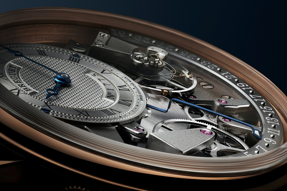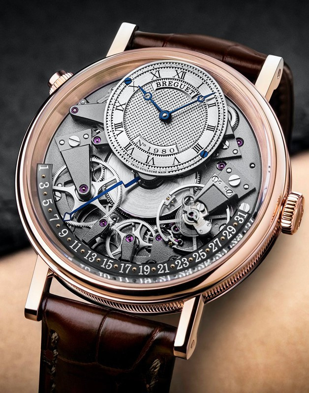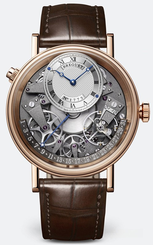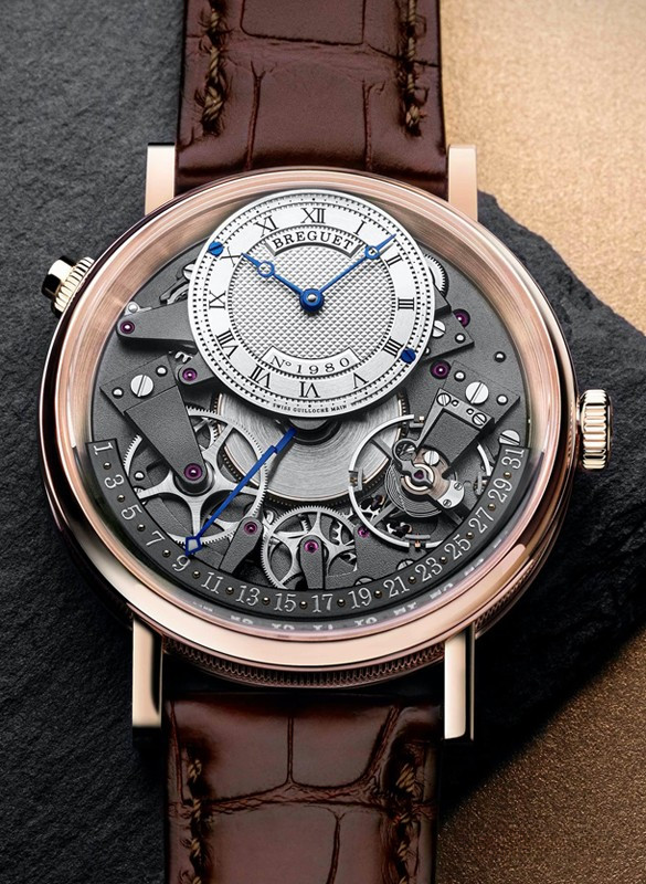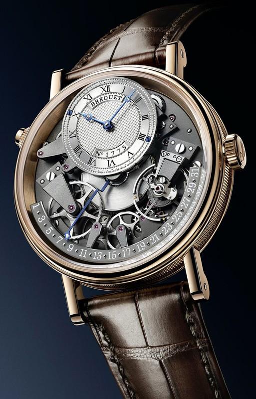 Часы Breguet Tradition 7597 Quantieme Retrograde представлены в корпусе из розового золота 18к размером 40 х 12.1 мм воднепроницаемостью 30 метров. Внутри корпуса установлен автоматический механизм, Калибр 505Q, обладающий запасом хода 50 часов. На серебристом гильошированном циферблате отображаются часы и минуты, в нижней части циферблата находится ретроградная шкала даты. Часы поставляются на ремешке из кожи аллигатора с вставкой из розового золота 18к.