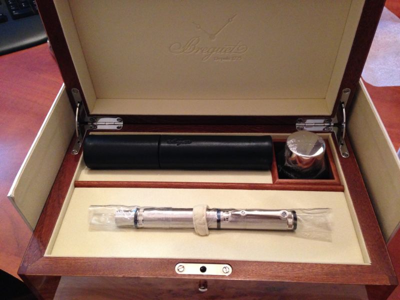 Перьевая ручка Breguet Writing Instruments Fountain Pen WI01AG03F выполнена из серебра 925-ой пробы, представлена в элегантной коробке с документами. Часовая марка Бреге часто упоминалась в произведениях гениальных писателей мировой литературы, начиная от Бальзака, Стендаля, Гюго, Макса Жакоба, Жюля Верна и Дюма и заканчивая русскими классиками, такими как Пушкин и Куприн. Данный факт свидетельствует об исключительной репутации часового дома и его основателя. В свою очередь, благодарность за предоставленную честь, часовая марка Breguet выразила коллекцией инструментов для письма.