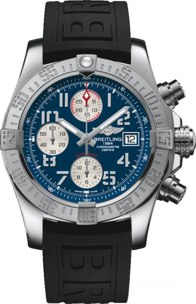Мужские часы Avenger II изготовлены в корпусе из нержавеющей стали размером 43 х 16.5 мм и водонепроницаемостью 300 метров. На синем с серебристым циферблате отображаются часы, минуты, секунды и дата. Накопители хронографа расположены на 6, 9 и 12 часах, апертура даты расположена на 3-х часах. Внутри корпуса установлен автоматический механизм Breitling 13 с запасом хода 42 часа. Безель часов вращающийся. Часы комплектуются каучуковым ремешком с вставкой из нержавеющей стали.