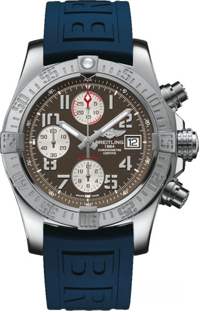Мужские часы Avenger II изготовлены в корпусе из нержавеющей стали размером 43 х 16.5 мм и водонепроницаемостью 300 метров. На сером с серебристым циферблате отображаются часы, минуты, секунды и дата. Накопители хронографа расположены на 6, 9 и 12 часах, апертура даты расположена на 3-х часах. Внутри корпуса установлен автоматический механизм Breitling 13 с запасом хода 42 часа. Безель часов вращающийся. Часы комплектуются каучуковым ремешком с вставкой из нержавеющей стали.