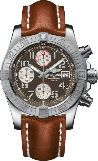 Мужские часы Avenger II изготовлены в корпусе из нержавеющей стали размером 43 х 16.5 мм и водонепроницаемостью 300 метров. На сером с серебристым циферблате отображаются часы, минуты, секунды и дата. Накопители хронографа расположены на 6, 9 и 12 часах, апертура даты расположена на 3-х часах. Внутри корпуса установлен автоматический механизм Breitling 13 с запасом хода 42 часа. Безель часов вращающийся. Часы комплектуются кожаным ремешком с вставкой из нержавеющей стали.