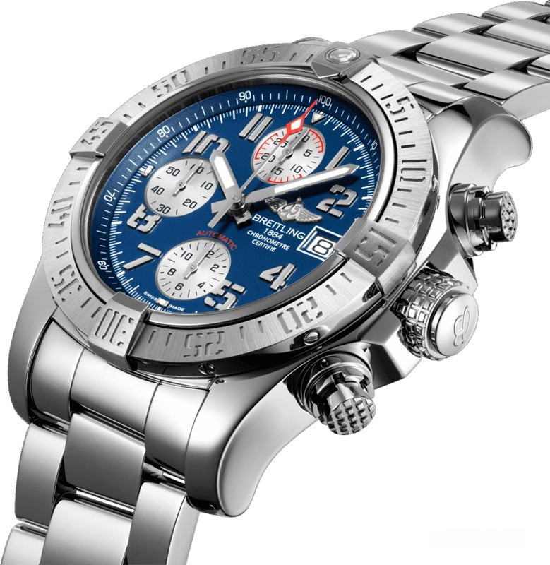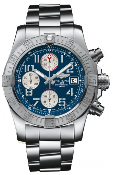 Мужские часы Avenger II изготовлены в корпусе из нержавеющей стали размером 43 х 16.5 мм и водонепроницаемостью 300 метров. На синем с серебристым циферблате отображаются часы, минуты, секунды и дата. Накопители хронографа расположены на 6, 9 и 12 часах, апертура даты расположена на 3-х часах. Внутри корпуса установлен автоматический механизм Breitling 13 с запасом хода 42 часа. Безель часов вращающийся. Часы комплектуются браслетом из нержавеющей стали.