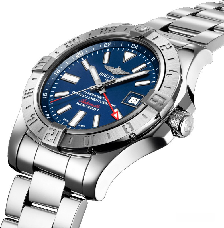 Мужские часы Avenger II GMT изготовлены в корпусе из нержавеющей стали размером 43 х 12.2 мм и водонепроницаемостью 300 метров. На синем циферблате отображаются часы, минуты, секунды и дата. Стрелка второго часового пояса отображается красным цветом и расположена по ценрту циферблата, апертура даты расположена на 3-х часах. Внутри корпуса установлен автоматический механизм Breitling 32 с запасом хода 42 часа. Безель часов вращающийся. Часы комплектуются браслетом из нержавеющей стали.