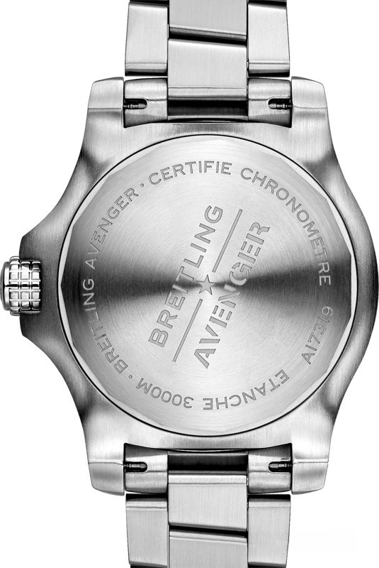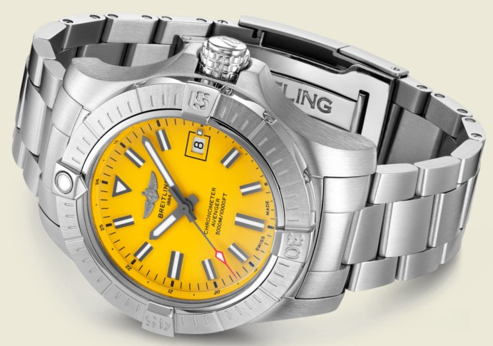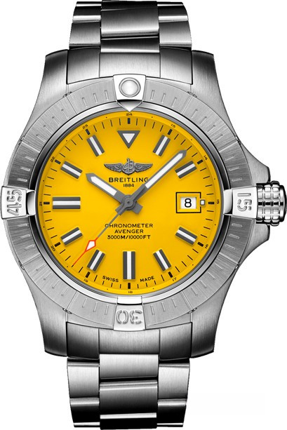 Мужские часы Avenger II Seawolf изготовлены в корпусе из нержавеющей стали размером 45 х 18.39 мм и водонепроницаемостью 3000 метров. На желтом циферблате отображаются часы, минуты, секунды и дата. Апертура даты расположена на 3-х часах. Внутри корпуса установлен автоматический механизм Breitling 17 с запасом хода 38 часов. Безель часов вращающийся. Часы комплектуются браслетом из нержавеющей стали.