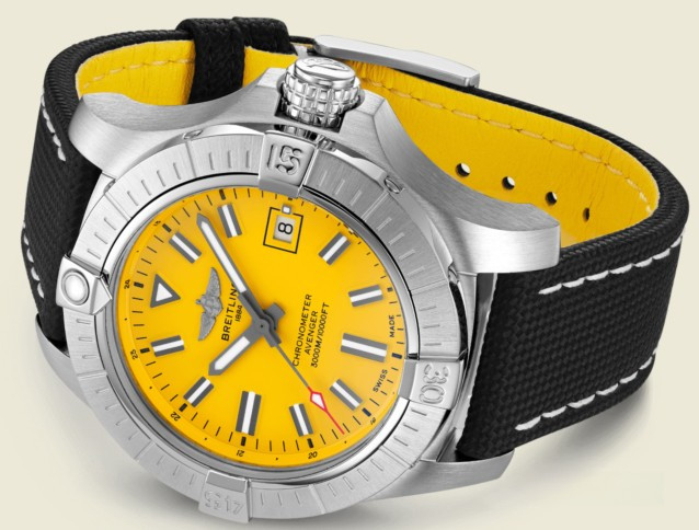 Мужские часы Avenger II Seawolf изготовлены в корпусе из нержавеющей стали размером 45 х 18.39 мм и водонепроницаемостью 3000 метров. На желтом циферблате отображаются часы, минуты, секунды и дата. Апертура даты расположена на 3-х часах. Внутри корпуса установлен автоматический механизм Breitling 17 с запасом хода 38 часов. Безель часов вращающийся. Часы комплектуются текстильным ремешком с вставкой из нержавеющей стали.