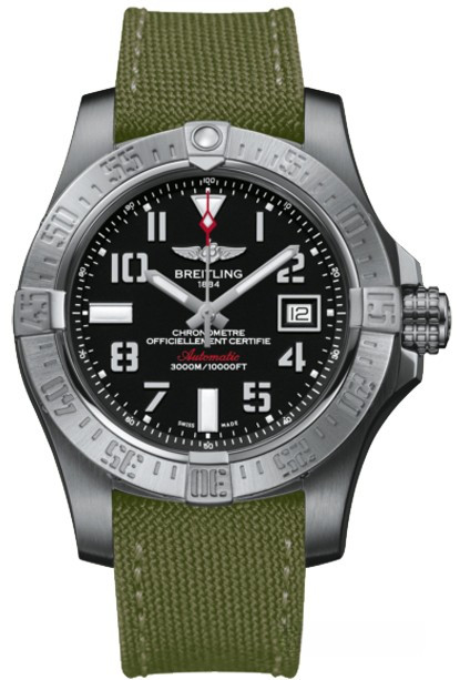 Мужские часы Avenger II Seawolf изготовлены в корпусе из нержавеющей стали размером 45 х 18.4 мм и водонепроницаемостью 3000 метров. На черном циферблате отображаются часы, минуты, секунды и дата. Апертура даты расположена на 3-х часах. Внутри корпуса установлен автоматический механизм Breitling 17 с запасом хода 40 часов. Безель часов вращающийся. Часы комплектуются текстильным ремешком с вставкой из нержавеющей стали.