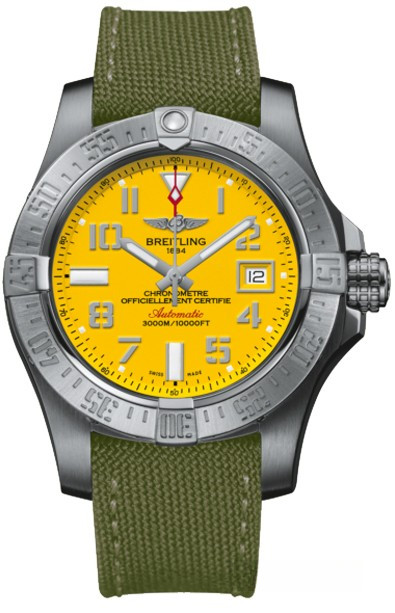 Мужские часы Avenger II Seawolf изготовлены в корпусе из нержавеющей стали размером 45 х 18.4 мм и водонепроницаемостью 3000 метров. На желтом циферблате отображаются часы, минуты, секунды и дата. Апертура даты расположена на 3-х часах. Внутри корпуса установлен автоматический механизм Breitling 17 с запасом хода 40 часов. Безель часов вращающийся. Часы комплектуются текстильным ремешком с вставкой из нержавеющей стали.