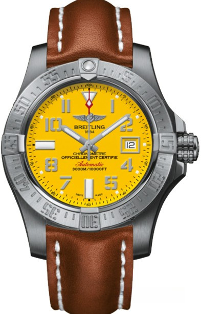 Мужские часы Avenger II Seawolf изготовлены в корпусе из нержавеющей стали размером 45 х 18.4 мм и водонепроницаемостью 3000 метров. На желтом циферблате отображаются часы, минуты, секунды и дата. Апертура даты расположена на 3-х часах. Внутри корпуса установлен автоматический механизм Breitling 17 с запасом хода 40 часов. Безель часов вращающийся. Часы комплектуются кожаным ремешком с вставкой из нержавеющей стали.