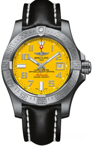 Мужские часы Avenger II Seawolf изготовлены в корпусе из нержавеющей стали размером 45 х 18.4 мм и водонепроницаемостью 3000 метров. На желтом циферблате отображаются часы, минуты, секунды и дата. Апертура даты расположена на 3-х часах. Внутри корпуса установлен автоматический механизм Breitling 17 с запасом хода 40 часов. Безель часов вращающийся. Часы комплектуются кожаным ремешком с вставкой из нержавеющей стали.