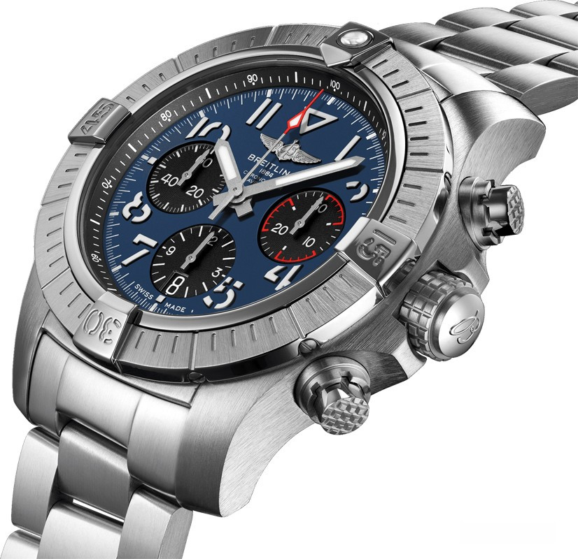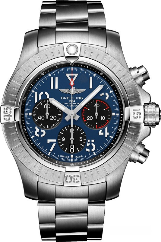 Часы Breitling Avenger B01 Chronograph 45 представлены в корпусе размером 45 х 15.7 мм из нержавеющей стали водонепроницаемостью 300 метров. Внутри корпуса установлен автоматический механизм, Калибр Breitling 01, обладающий запасом хода 70 часов. На синем циферблате отображаются часы, минуты, секунды, накопители хронографа. Часы поставляются на браслете из нержавеющей стали. Серия ограничена - 500 шт.